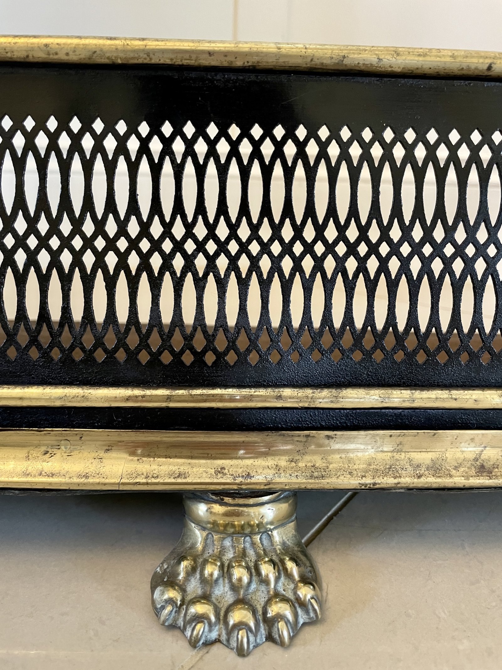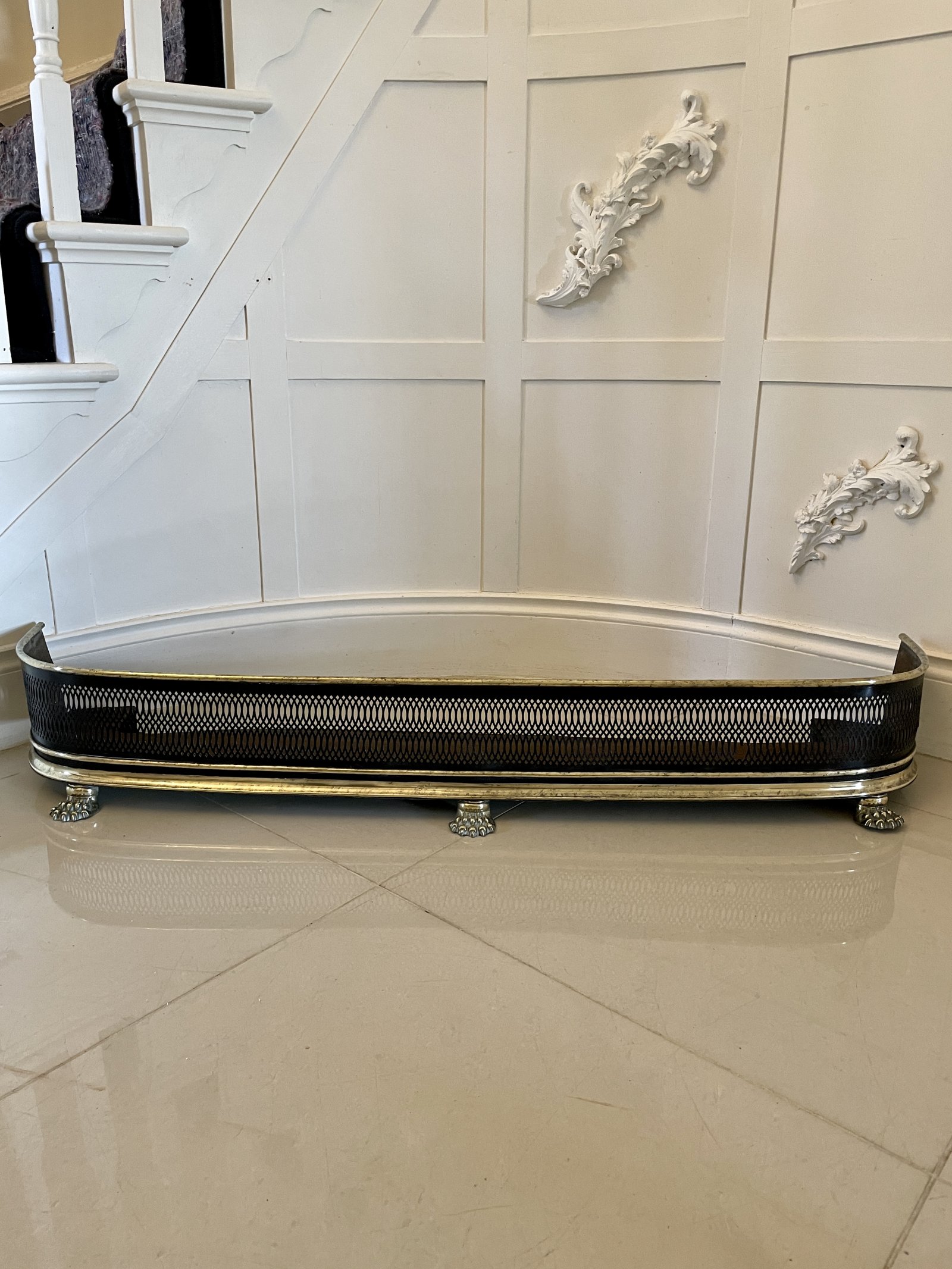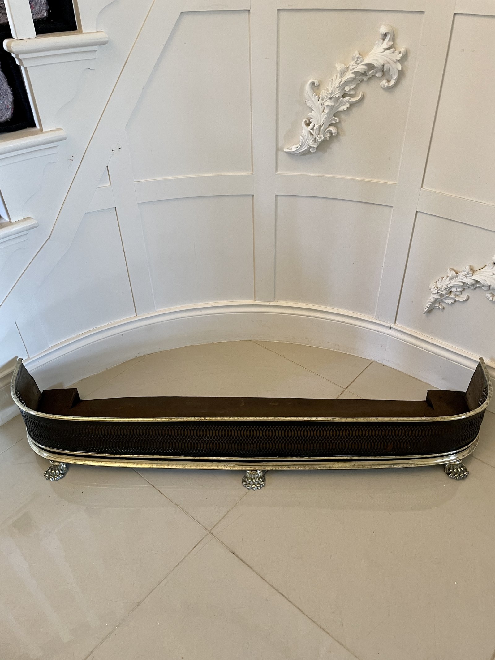 Antique George IIIl quality brass and iron fender having a quality iron pierced shaped front with a brass top rail and raised on a shaped brass base on solid brass paw feet.