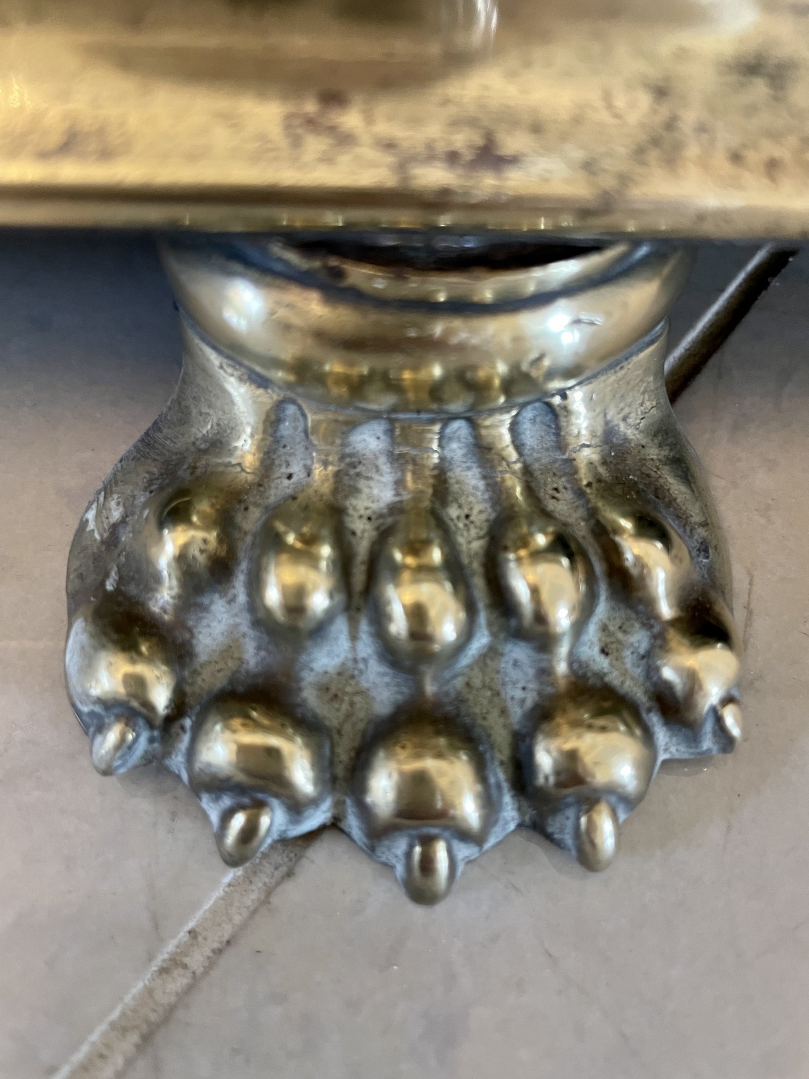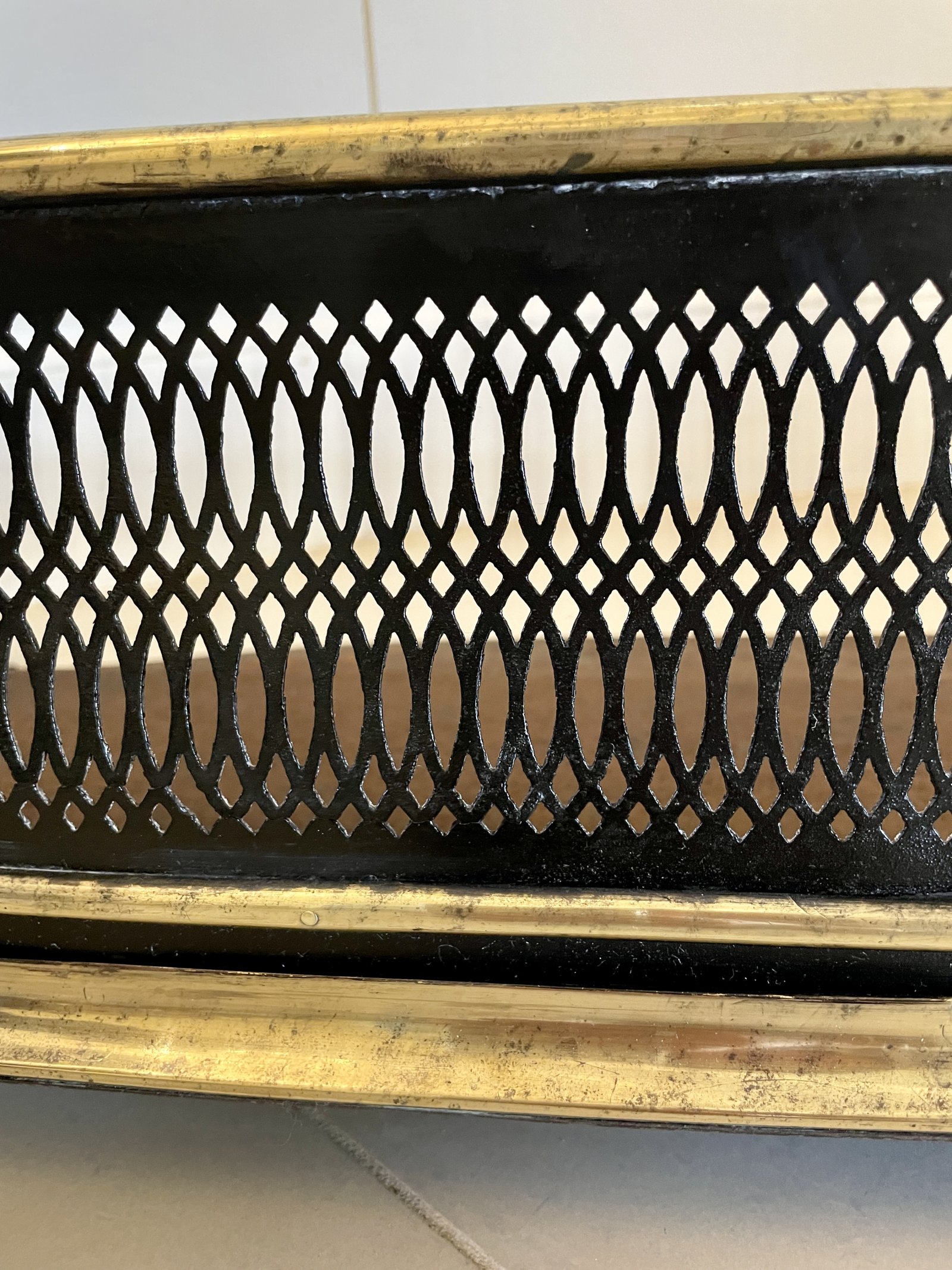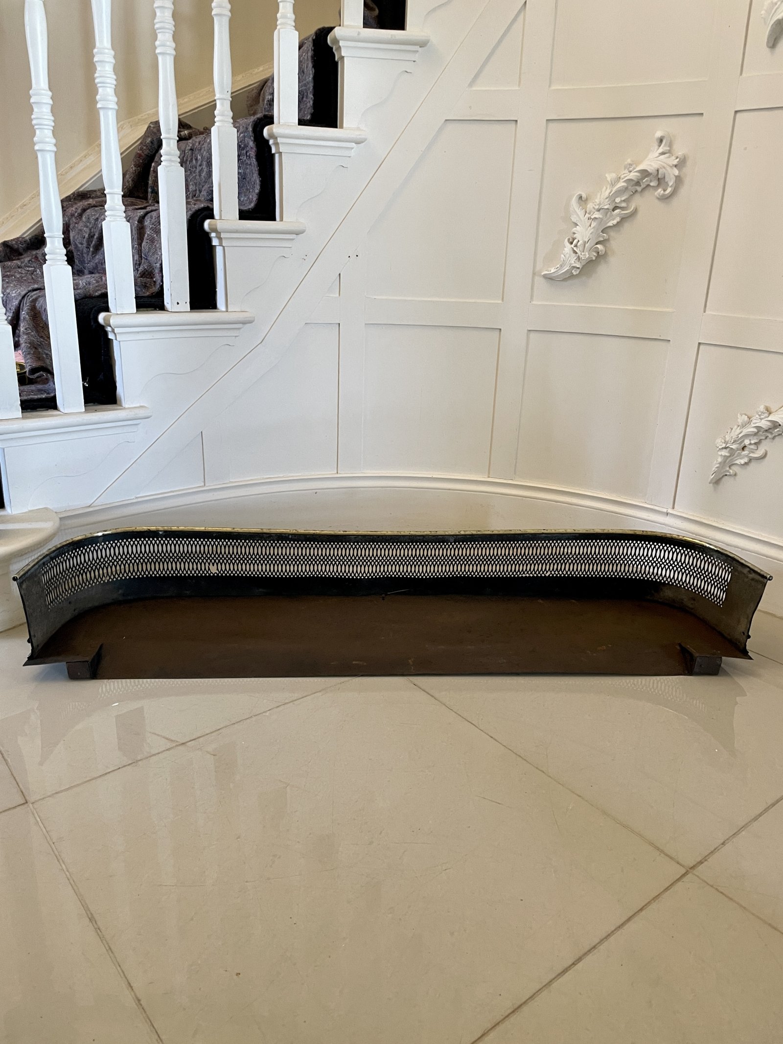 Antique George IIIl quality brass and iron fender having a quality iron pierced shaped front with a brass top rail and raised on a shaped brass base on solid brass paw feet.
