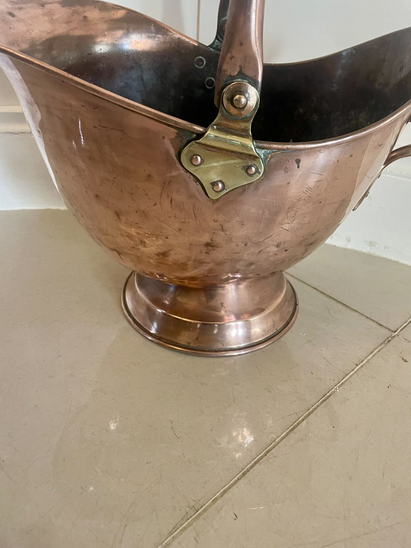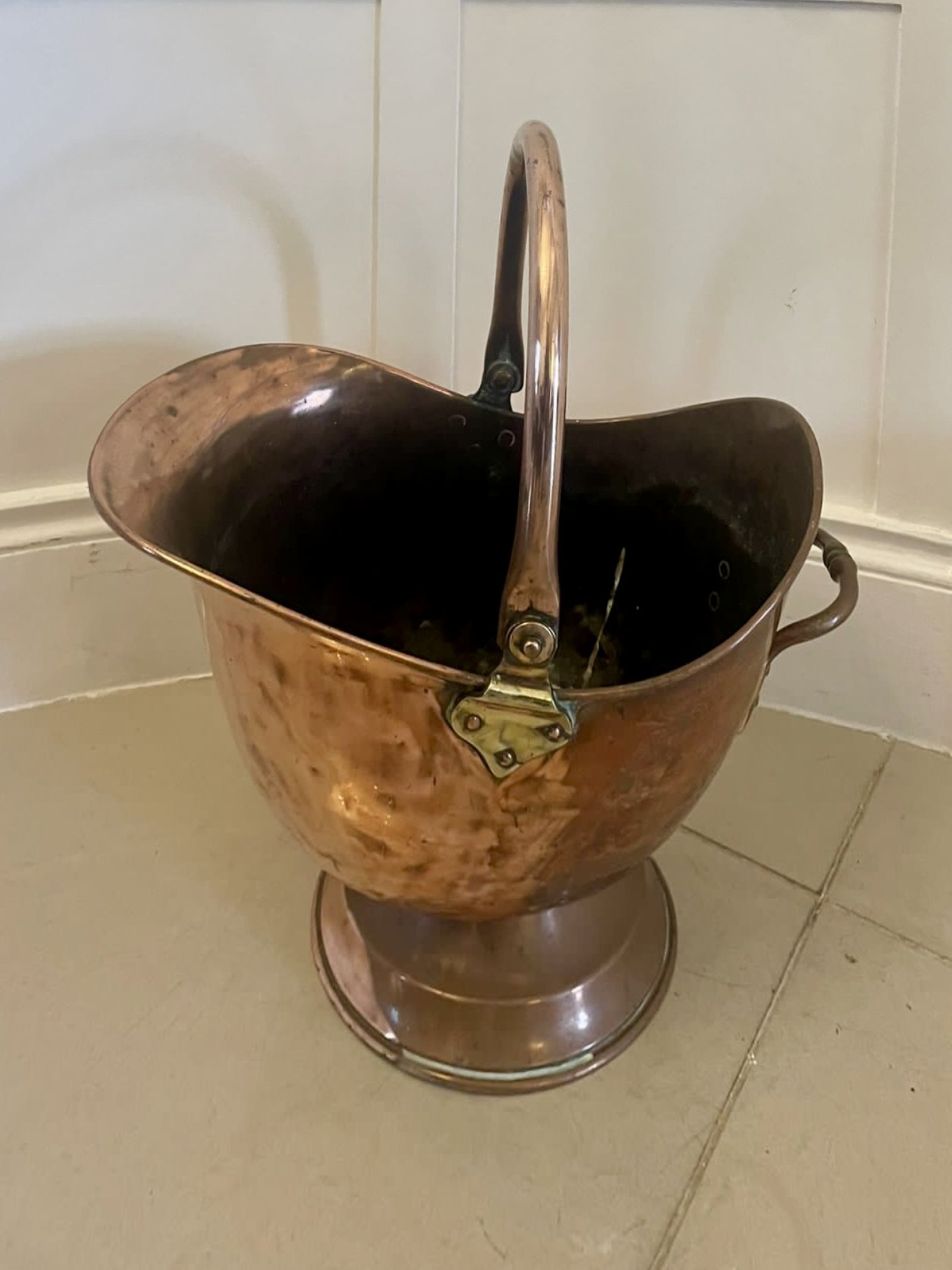 Antique George III quality copper coal scuttle having a copper swing carrying handle with brass hinges above a lovely copper coal scuttle with a shaped top standing on a circular base