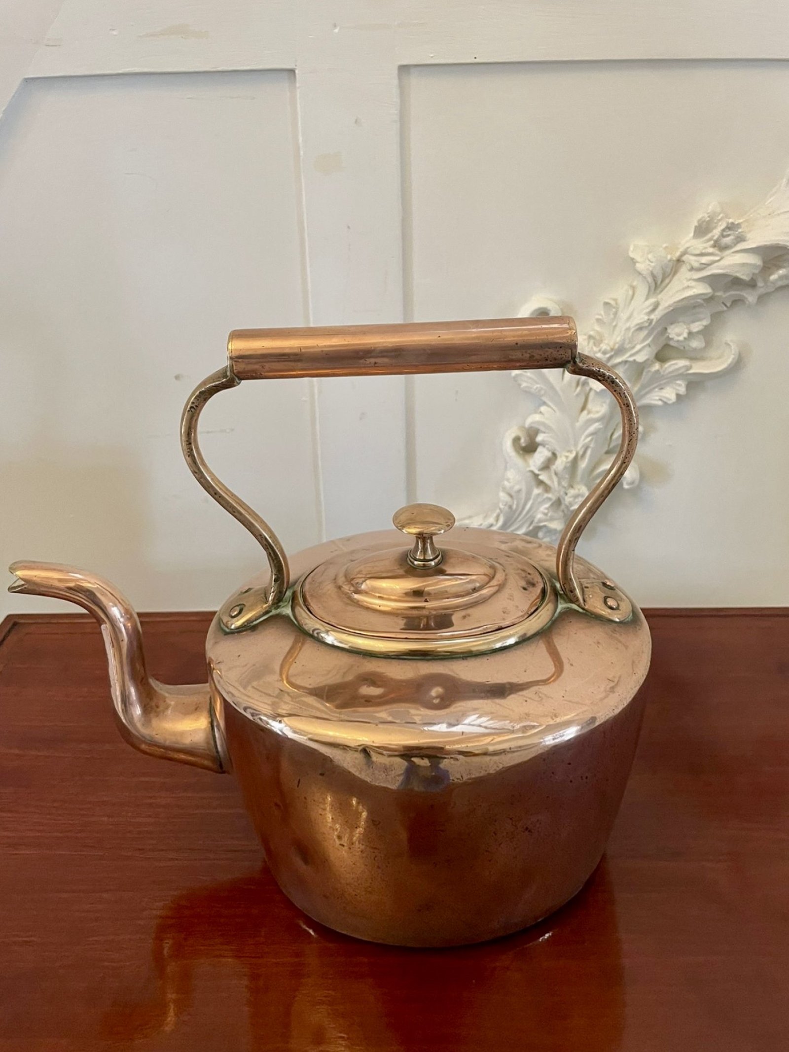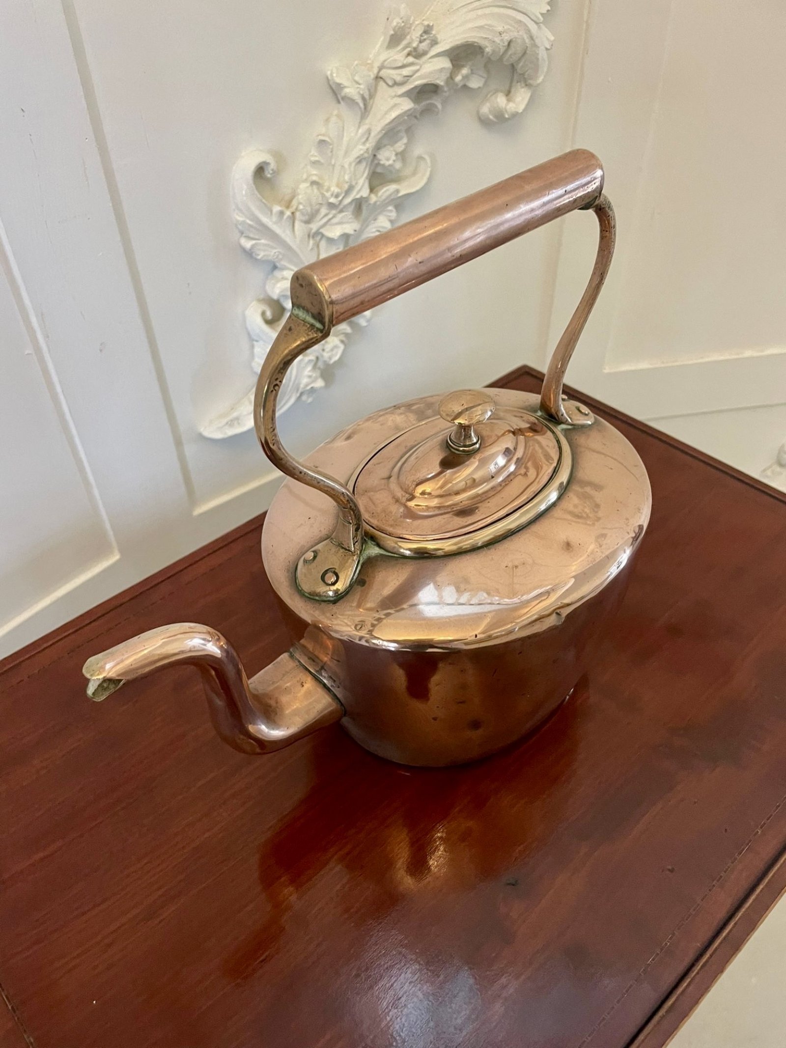 Antique George III quality copper kettle having an oval shaped copper kettle with a shaped handle and spout