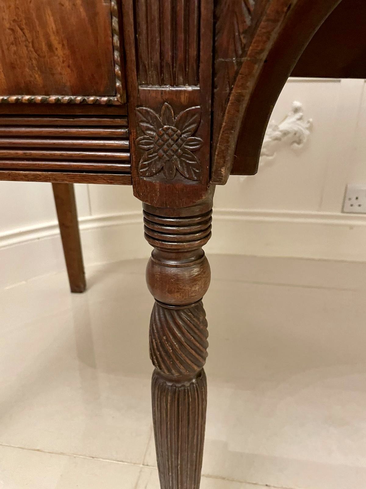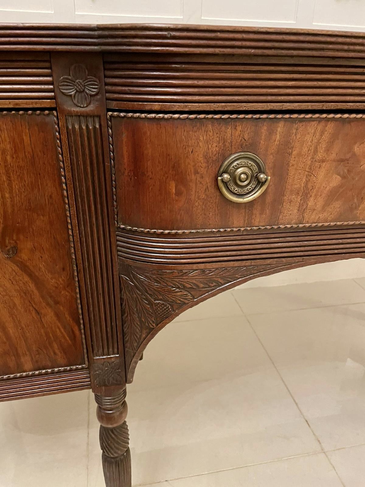 Antique George III quality figured mahogany breakfront sideboard having a quality figured mahogany breakfront shaped top with a reeded edge and brass handles above three shaped drawers with a fine carved beaded edge, one drawer fitted with a cellarette flanked by reeded moulding and quality carved shaped mahogany supports and standing on shaped turned reeded rope twist tapering legs.