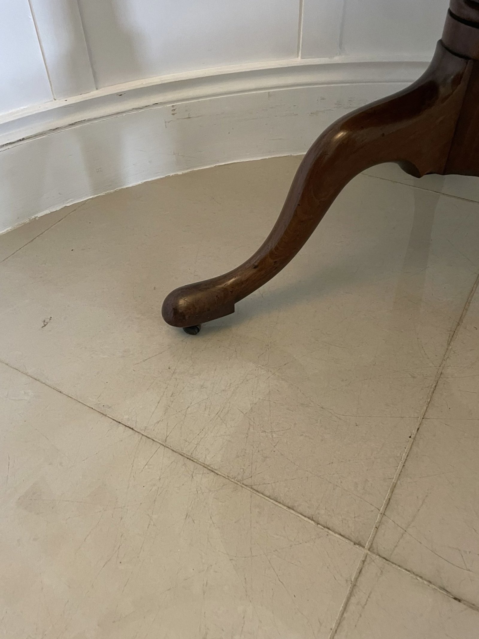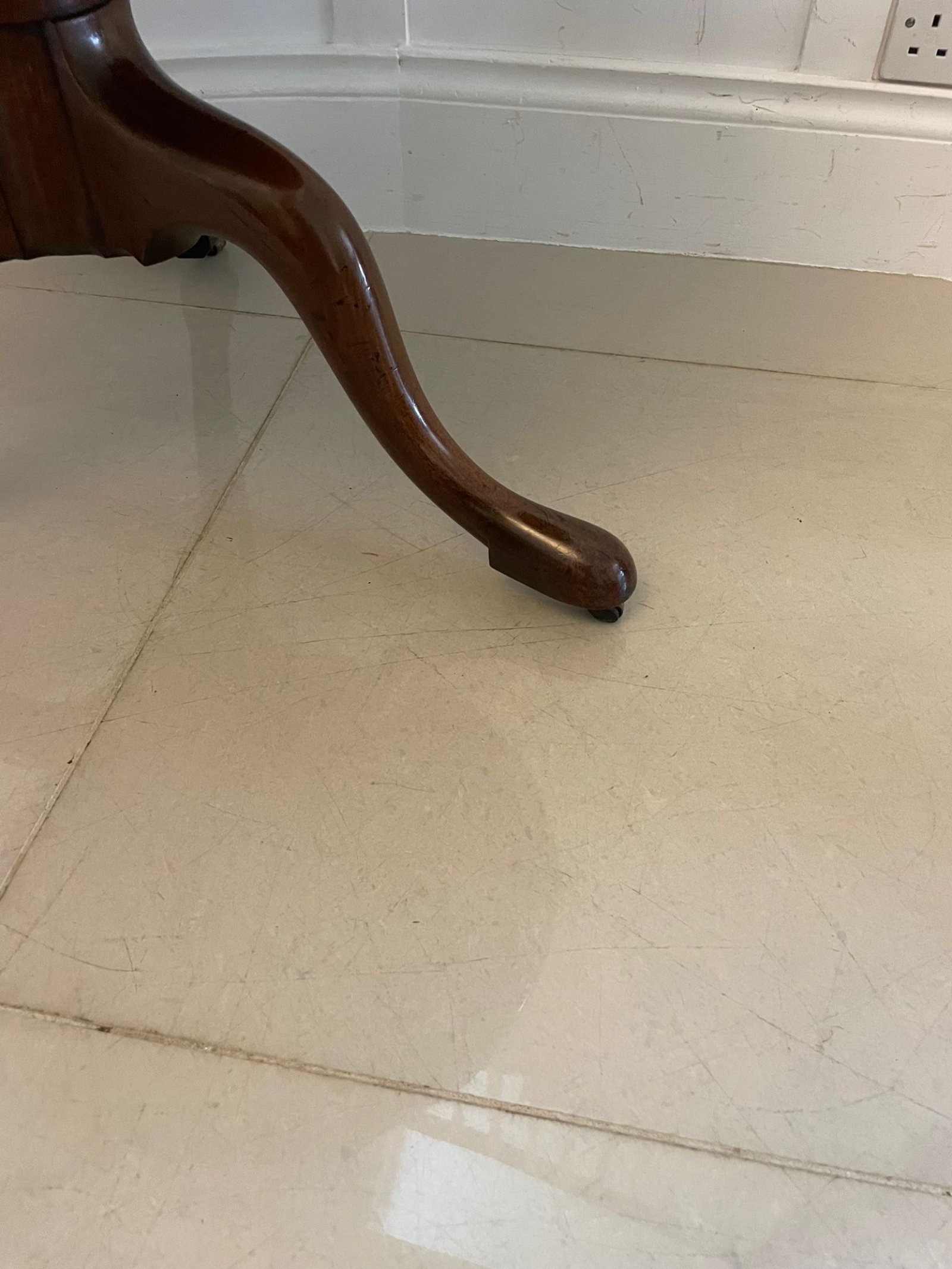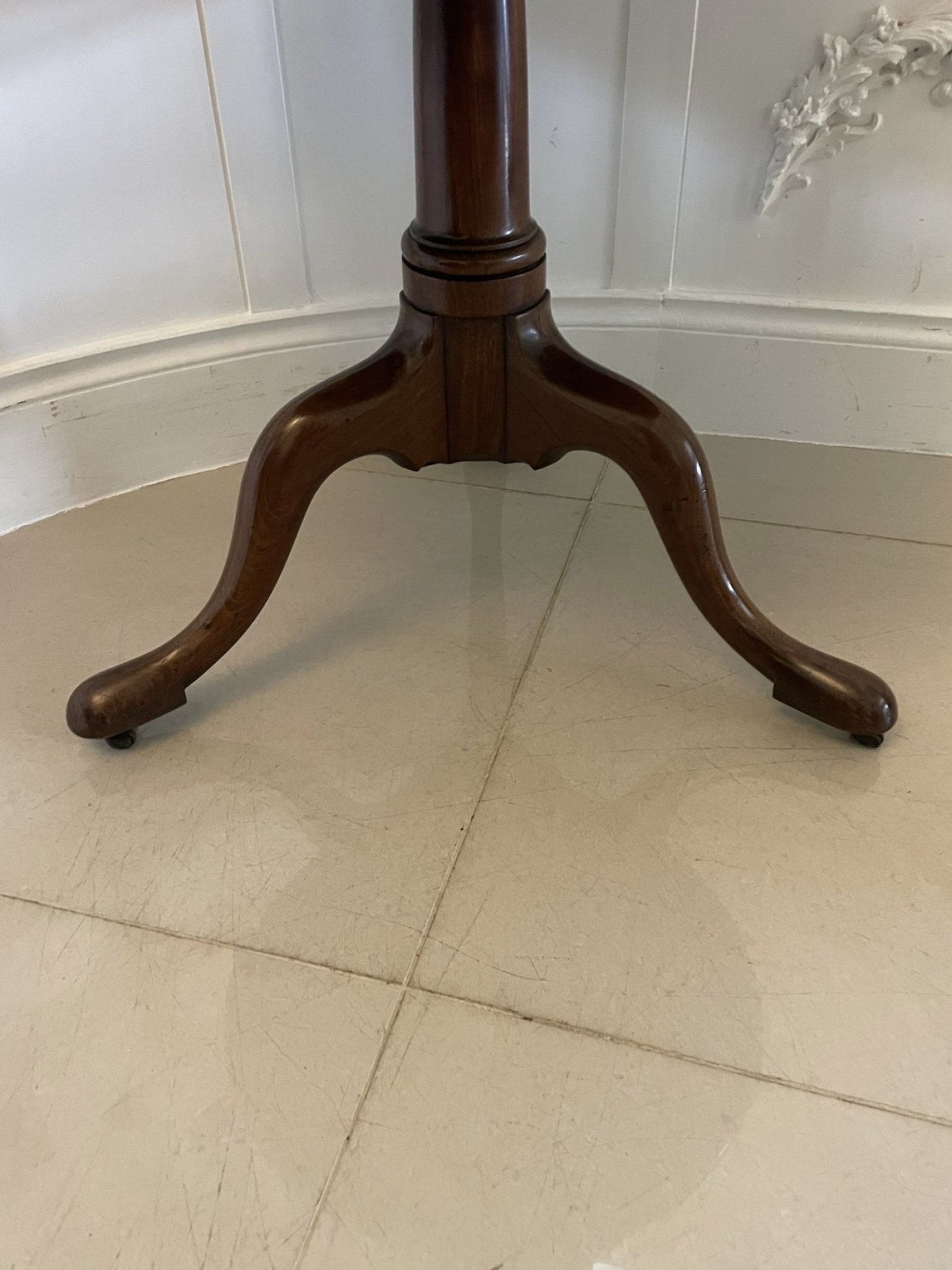 Antique George III quality mahogany 3 tier circular dumb waiter having 3 circular quality mahogany display tiers supported by turned columns standing on 3 shaped cabriole legs with pad feet original brass castors