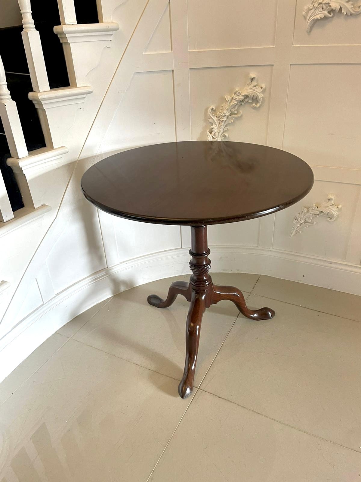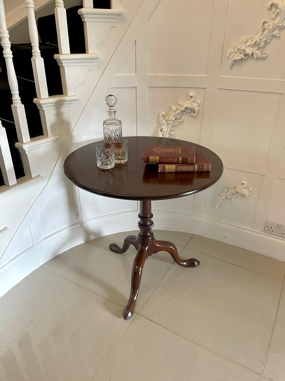 Antique George III quality mahogany bird cage tripod/lamp table having a quality mahogany circular tilt top supported by a mahogany birdcage and a turned carved tapering mahogany pedestal column standing on shaped cabriole legs with pad feet