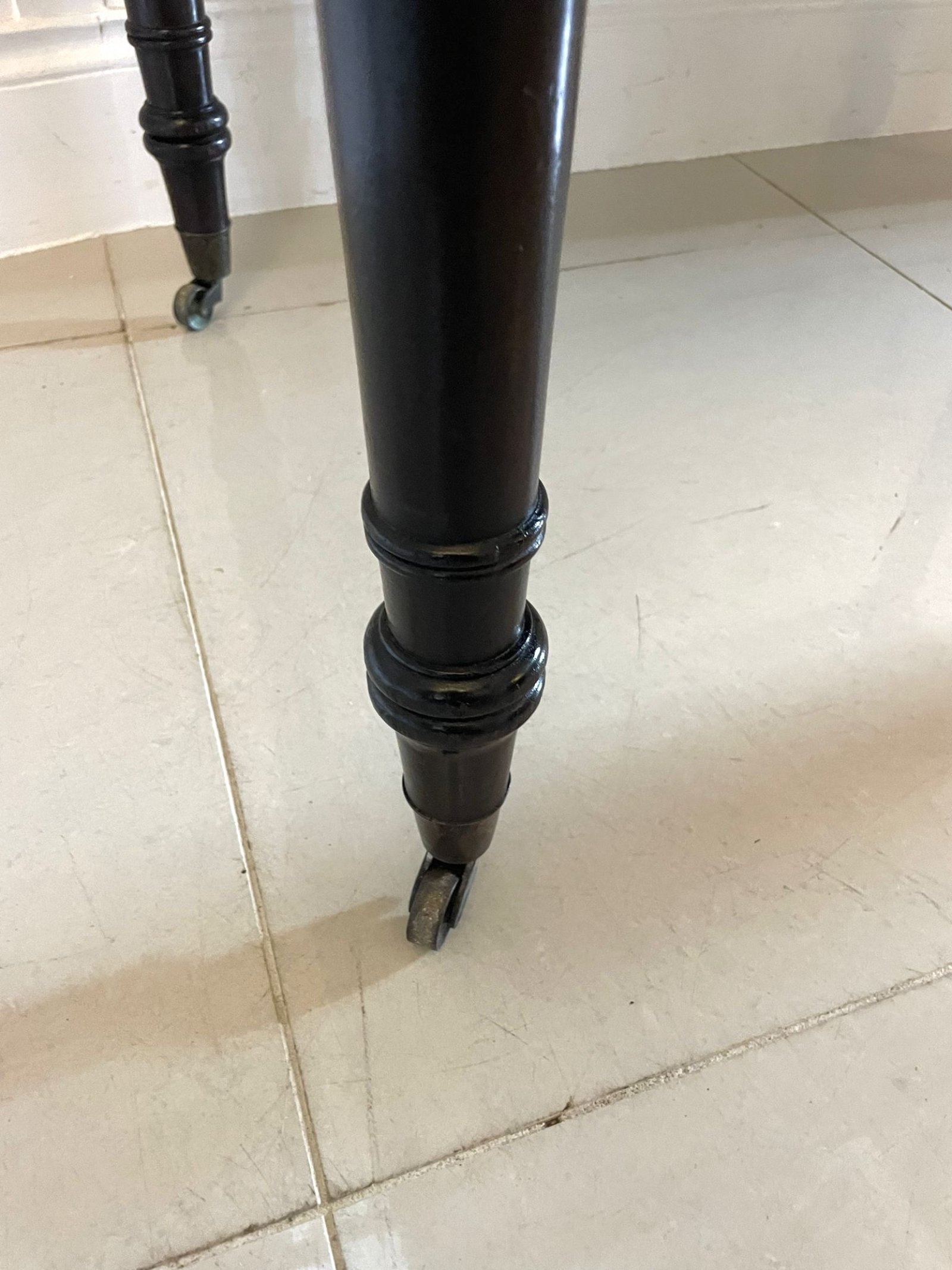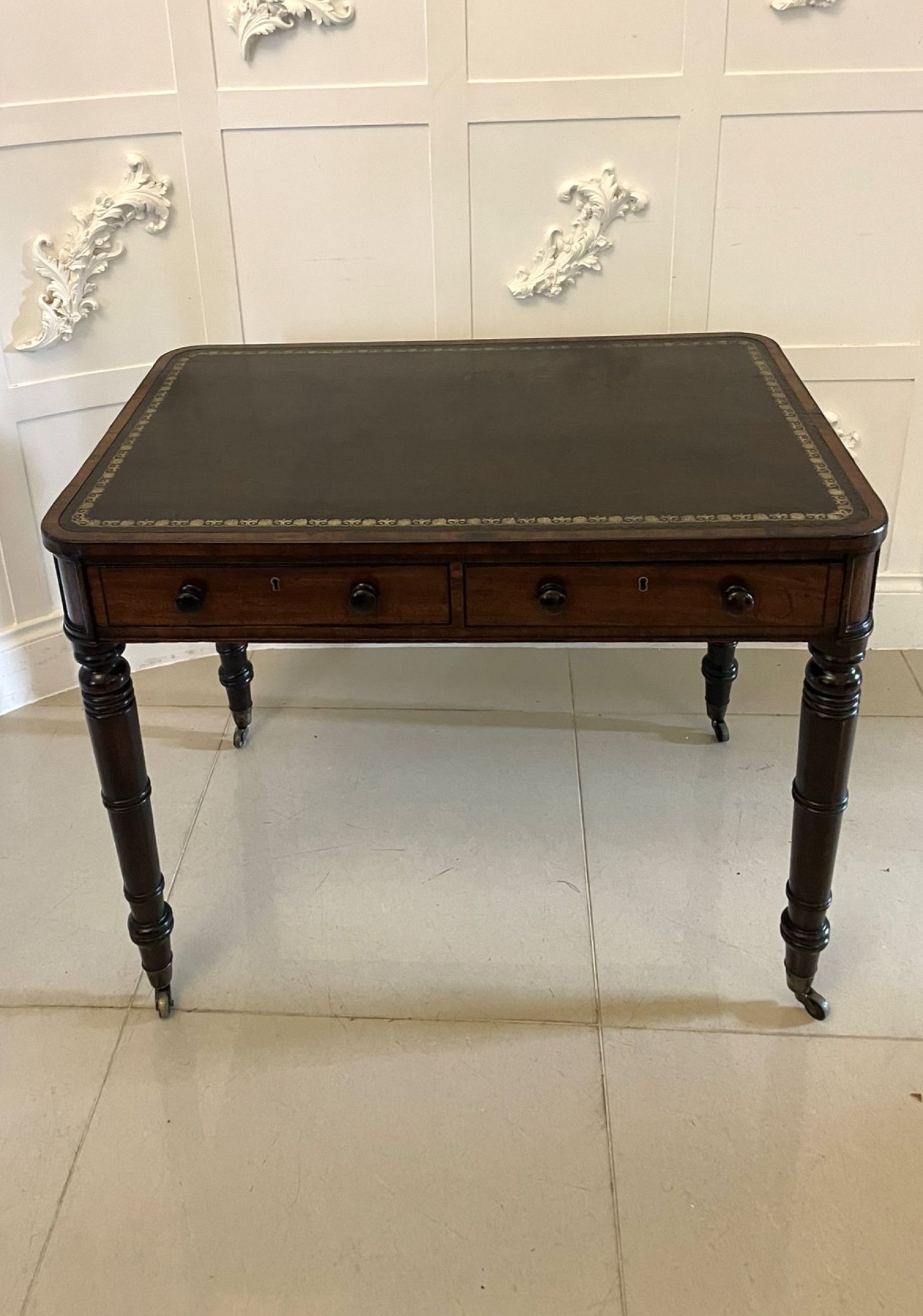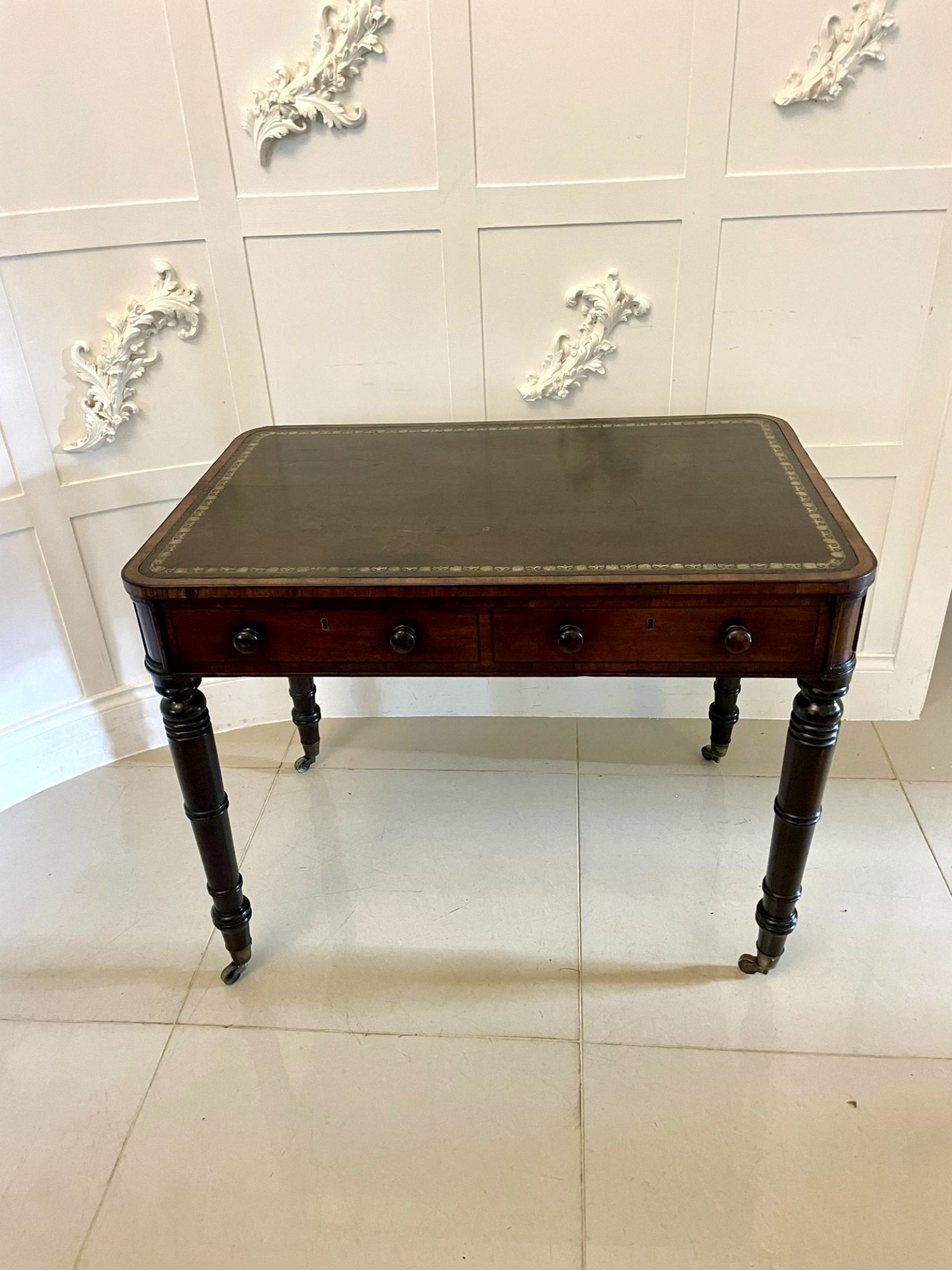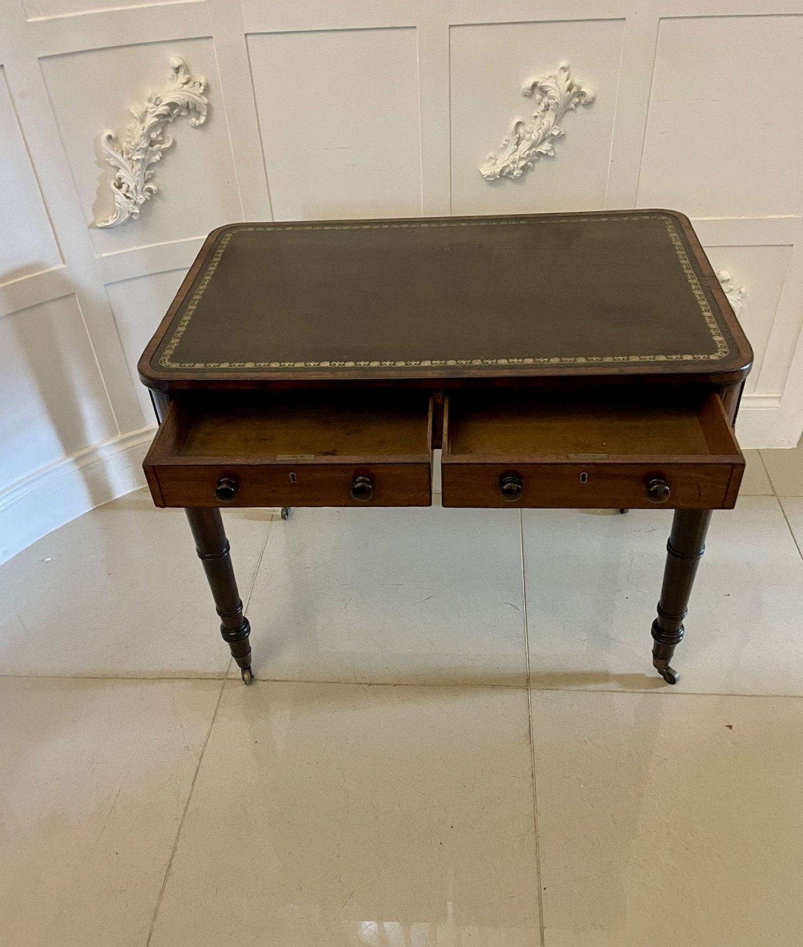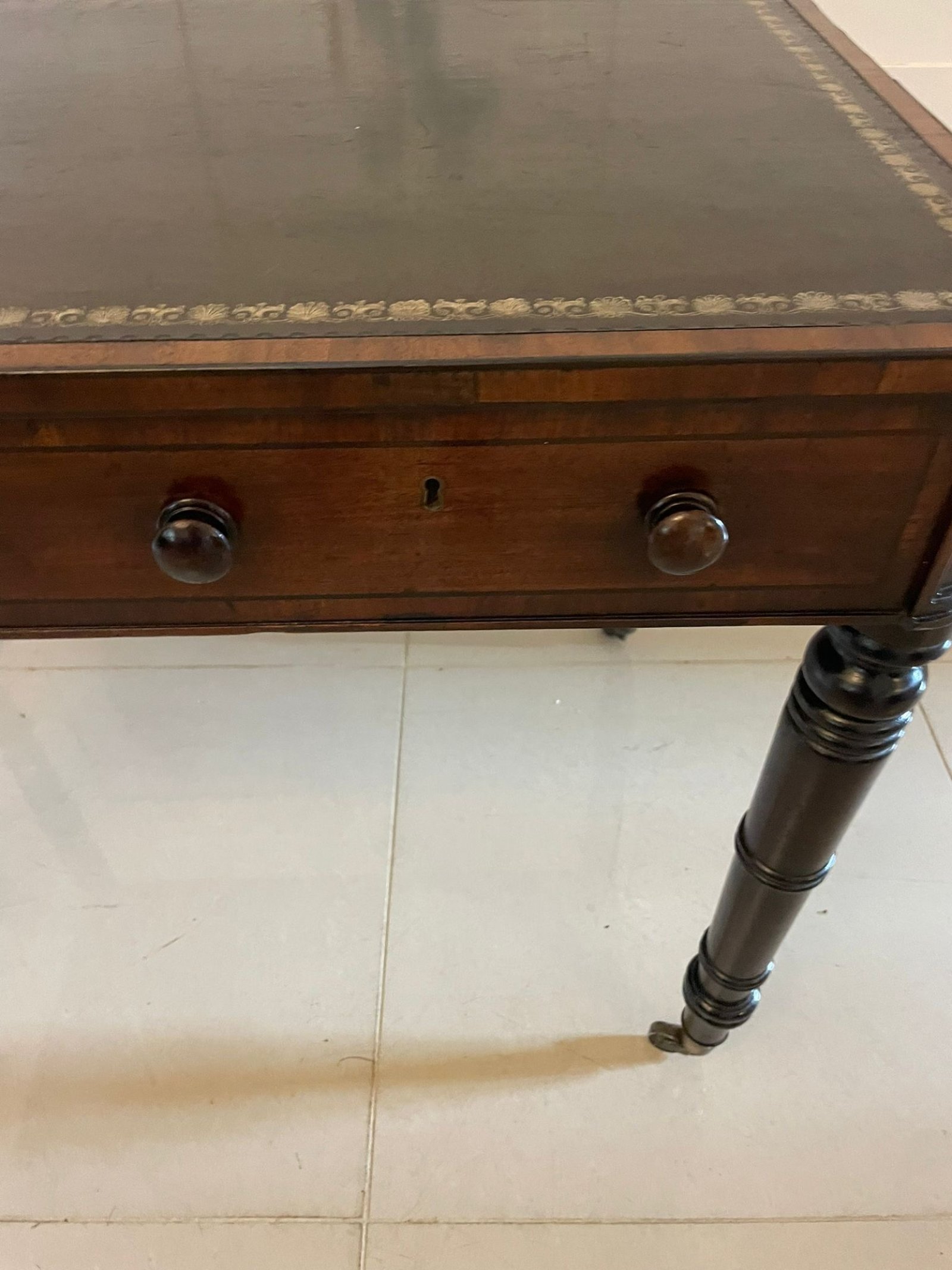 Antique George III quality mahogany freestanding leather top writing desk having a leather writing surface with a quality mahogany crossbanded edge above two mahogany cockbeeded oak lined drawers with original turned knob handles, freestanding dummy drawers to the back, panel sides standing on elegant turned tapering legs with original brass cup castors
