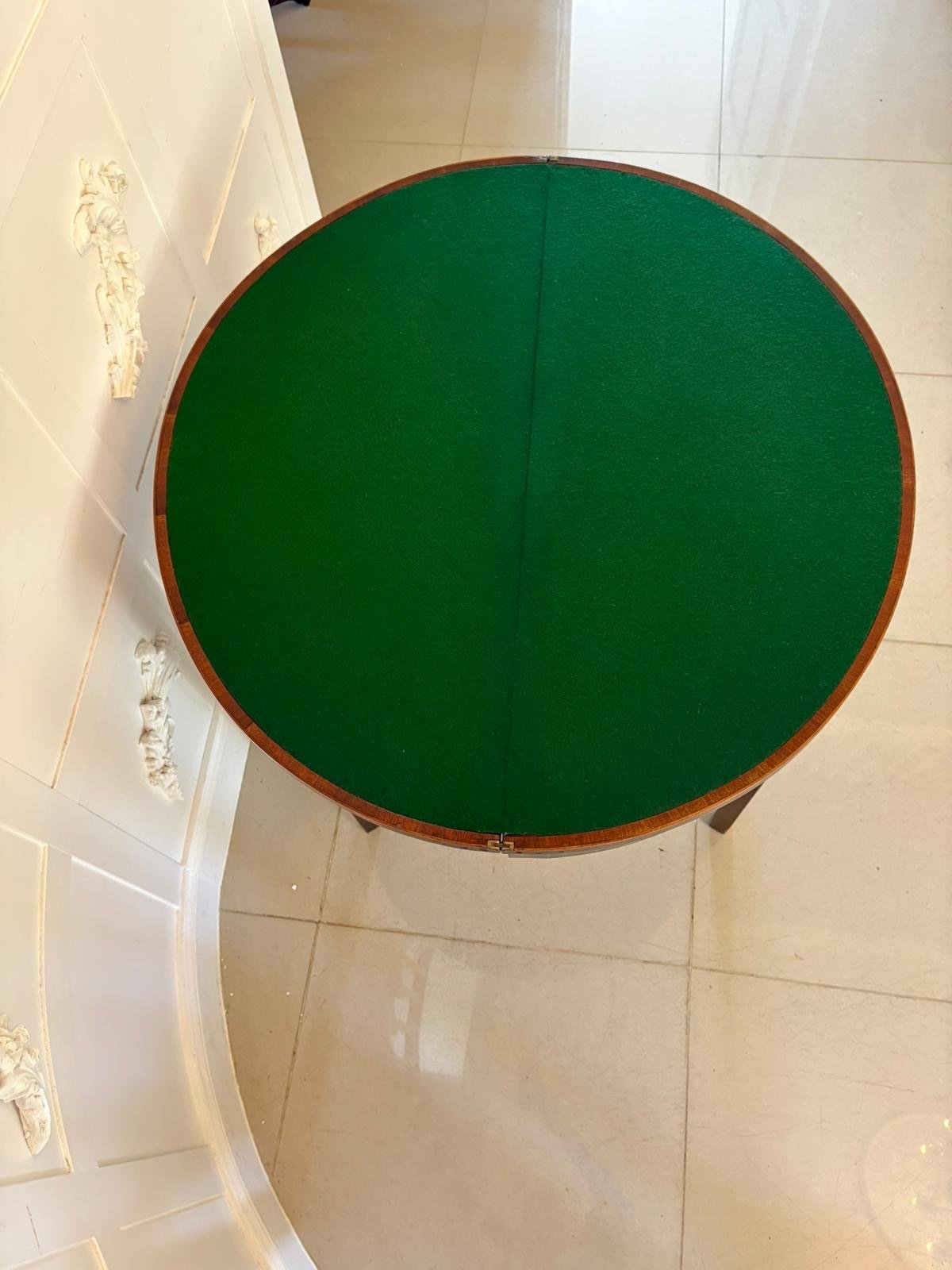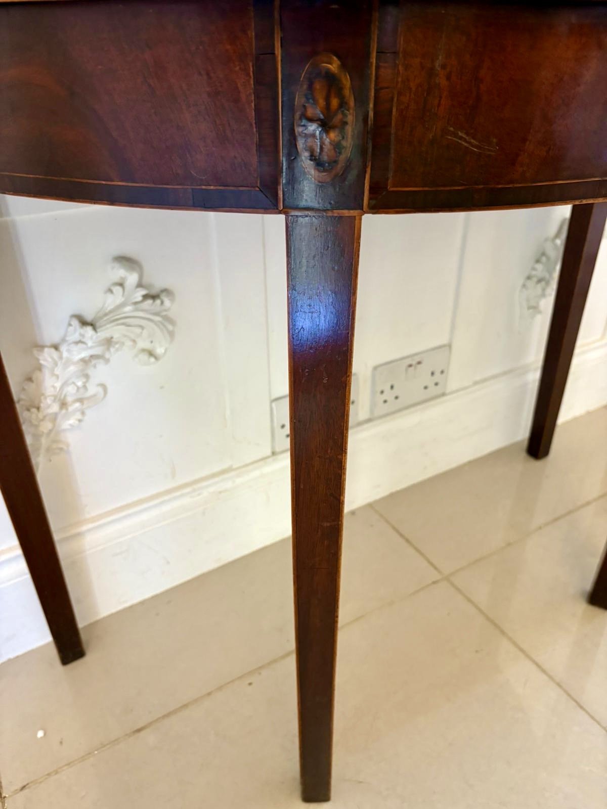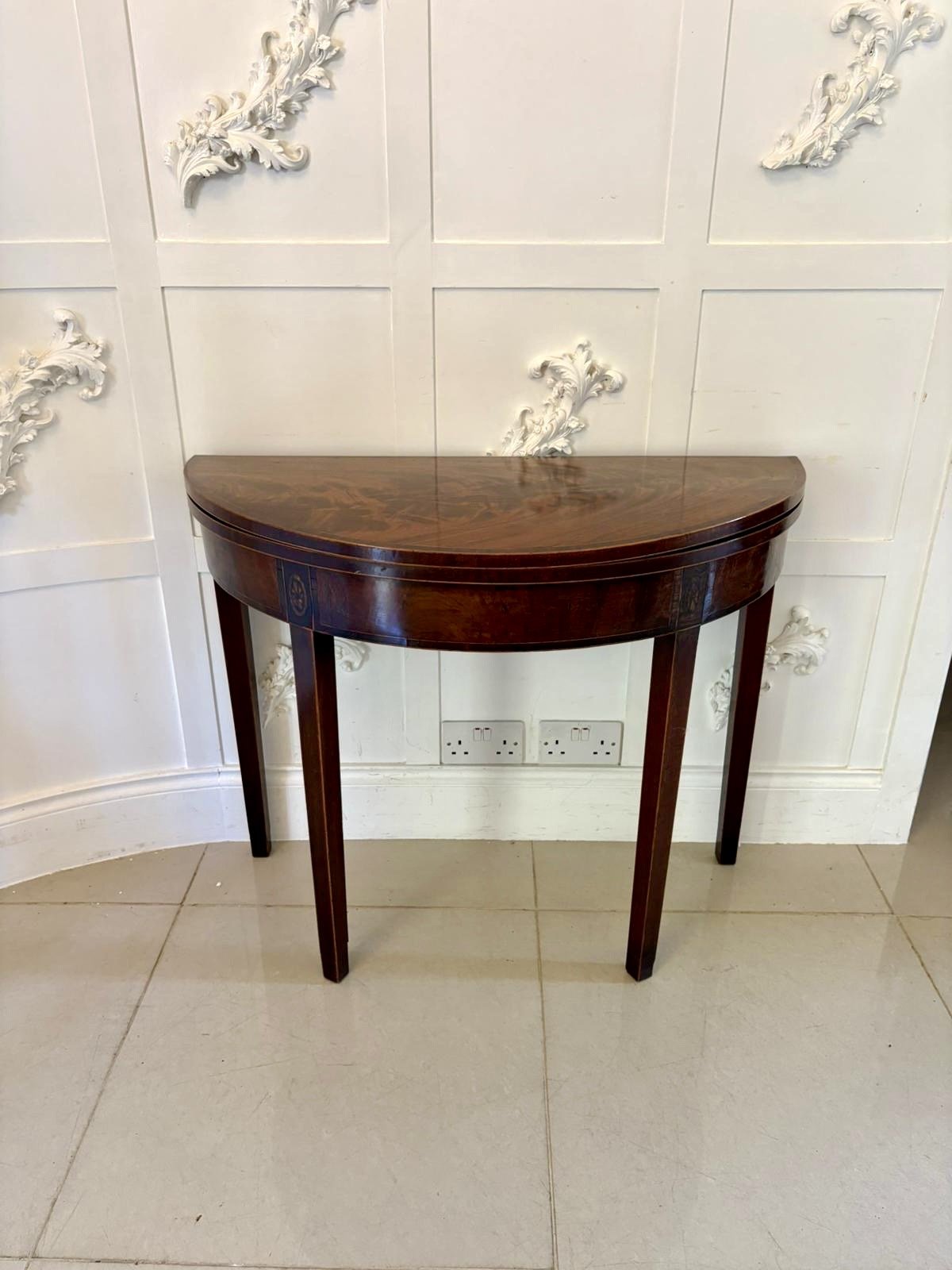 Antique George III quality mahogany inlaid demi lune shaped card/console table having a quality mahogany demi lune shaped top with satinwood crossbanding opening to reveal a baize interior, mahogany frieze with oval inlaid satinwood shells standing on elegant square tapering legs.
