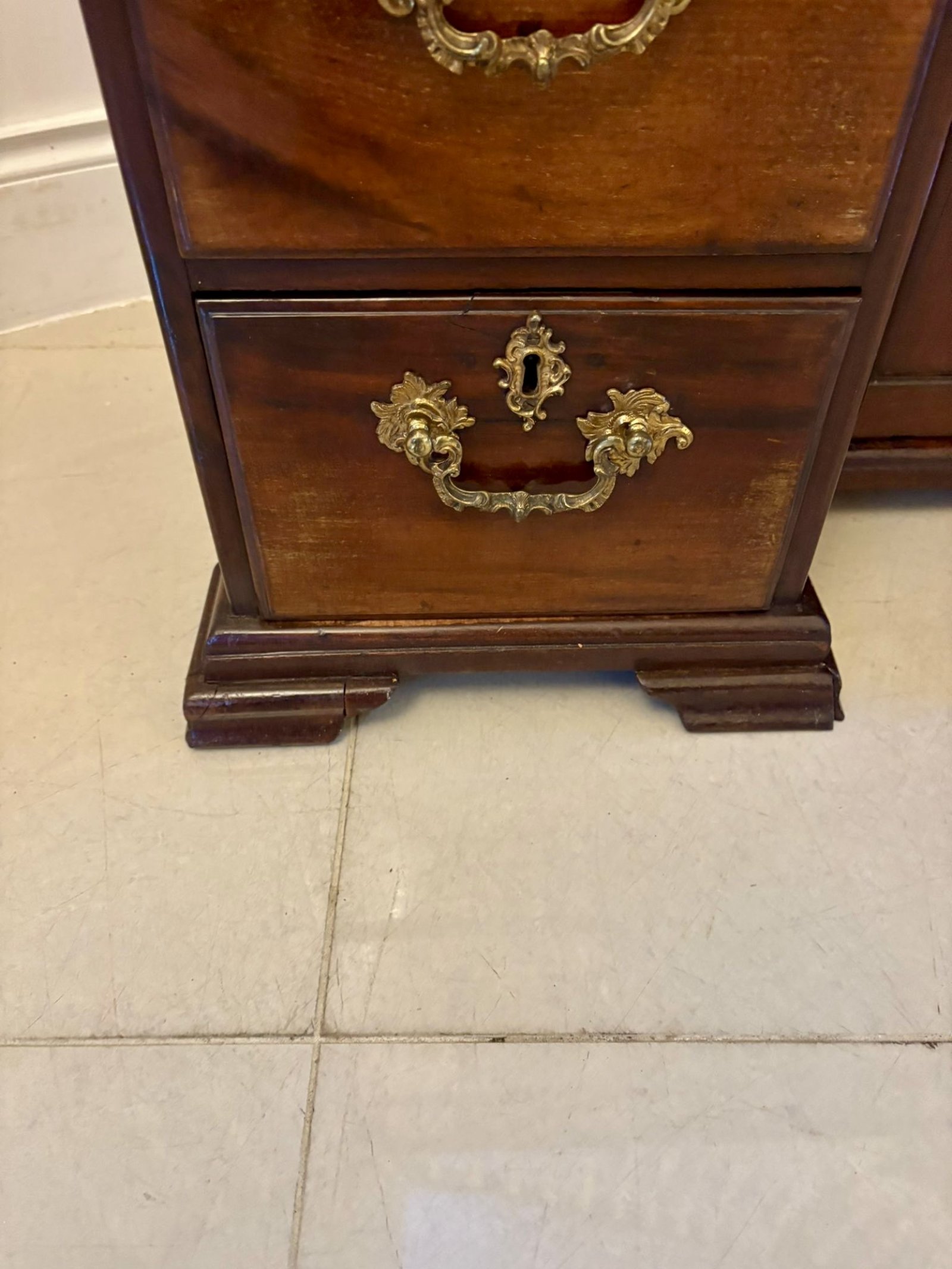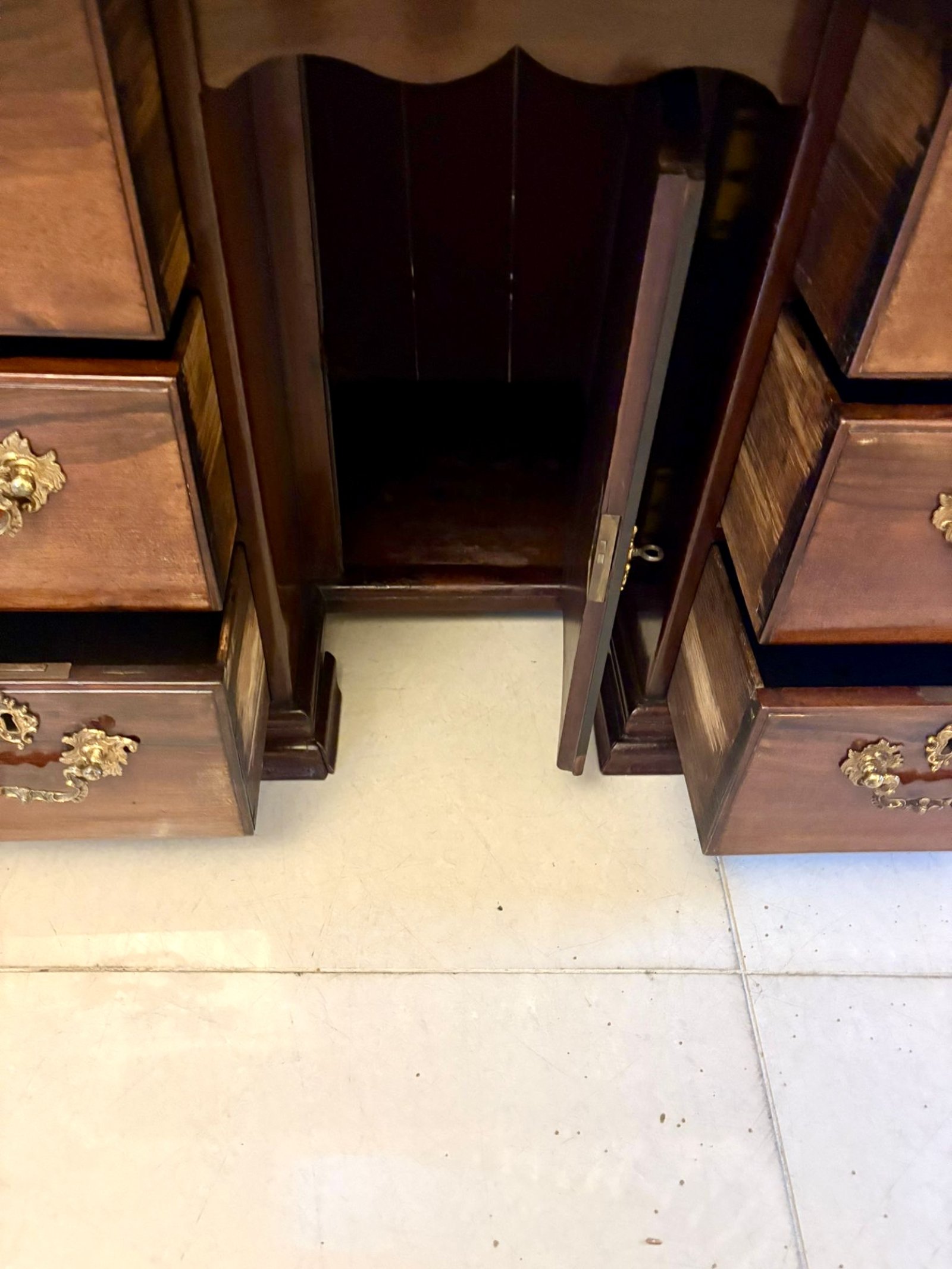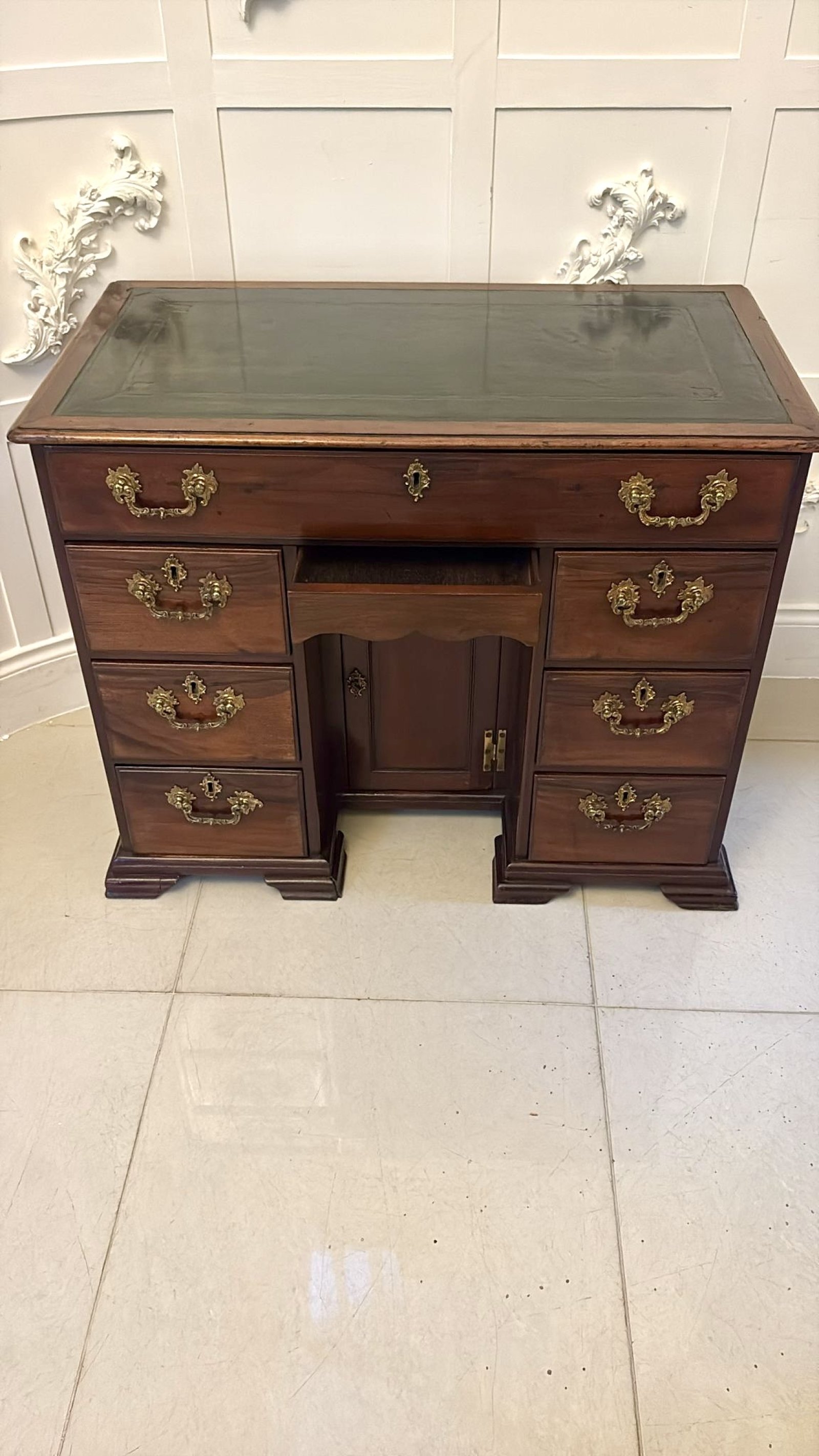 An Antique George III mahogany kneehole desk, beautifully balanced and displaying the restrained elegance typical of late-18th-century Georgian craftsmanship. The desk features a warm, rich mahogany colour, a desirable green tooled leather inset top, a shaped apron, and a central cupboard flanked by banks of smoothly running drawers with origins decorative brass handles.