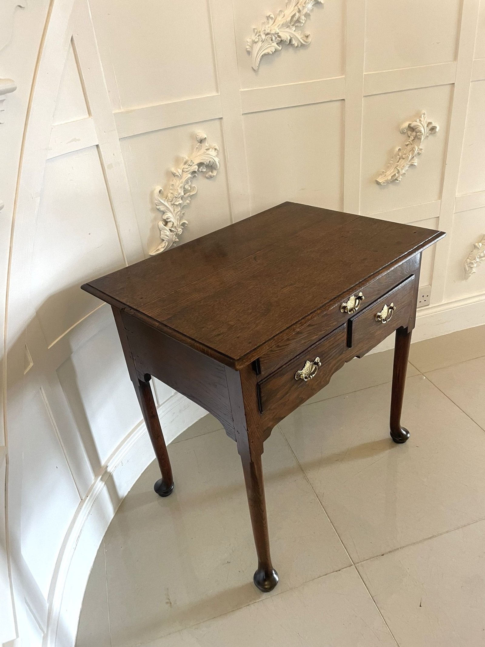 Antique George III quality oak lowboy having a quality oak rectangular shape top with a moulded edge above one long and two short drawers with original engraved brass handles standing on turned tapering legs with pad feet