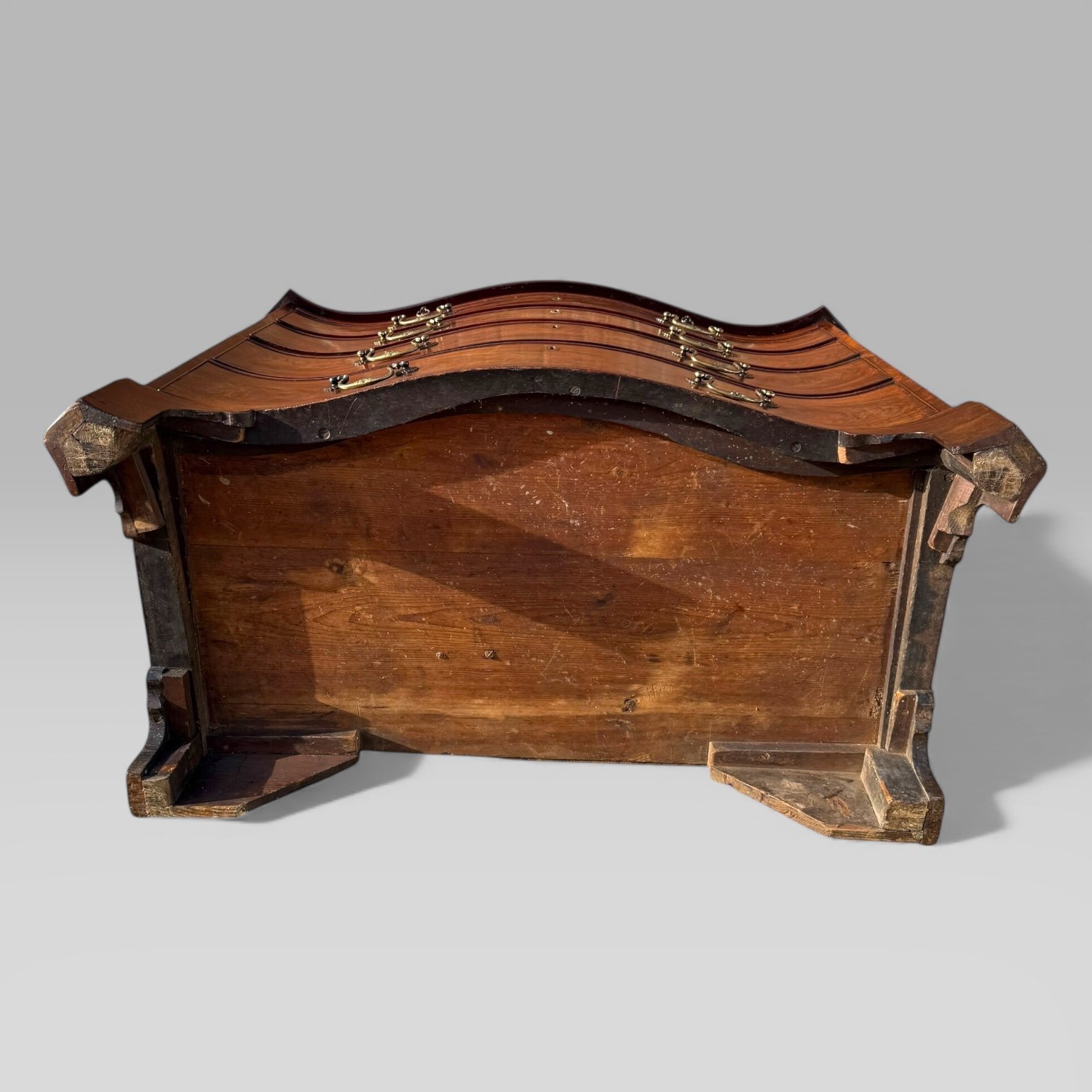 This chest comprises of 4 graduated drawers each with ornate detailed swan neck brass handles & key inscriptions between horizontal reeded corners. Above the drawers is a brush and slide which has a green baize writing space. This chest of drawers retains its deep rich colour and patina which is only achieved by over 260 years of age!