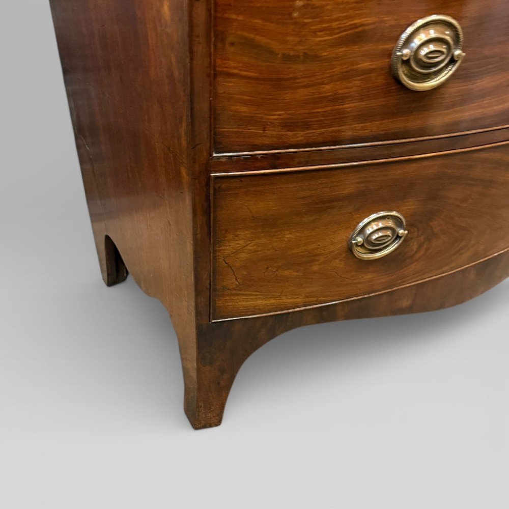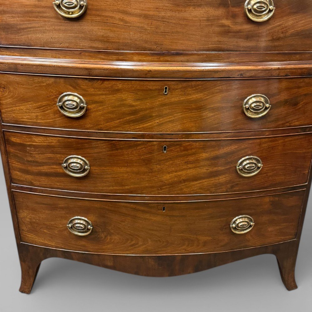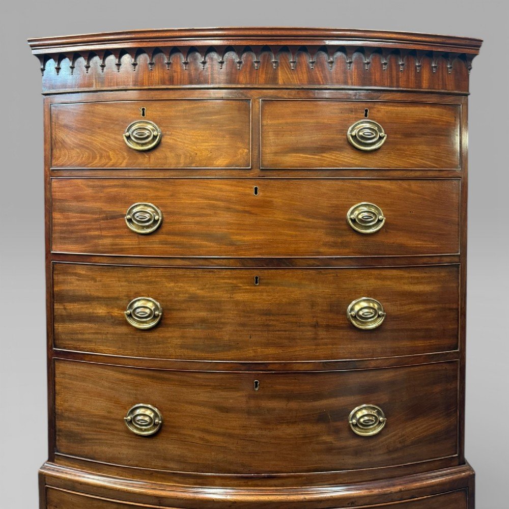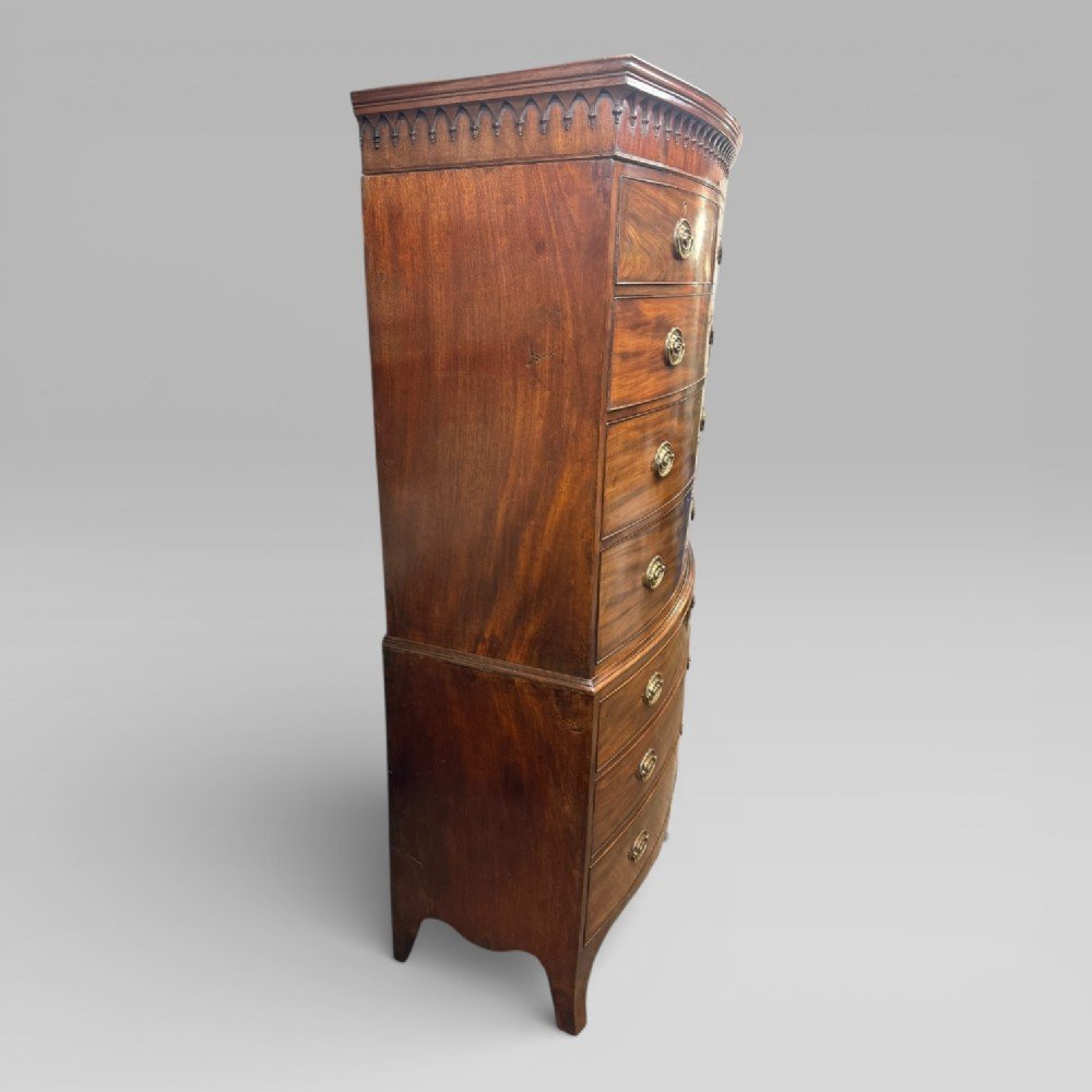 A Georgian George III mahogany bow-front chest on chest, fitted with eight drawers arranged with a two-over-three drawer configuration to the upper section, set above three long drawers to the lower section. This traditional chest-on-chest form provides substantial storage, offering greater capacity than a standard single chest.