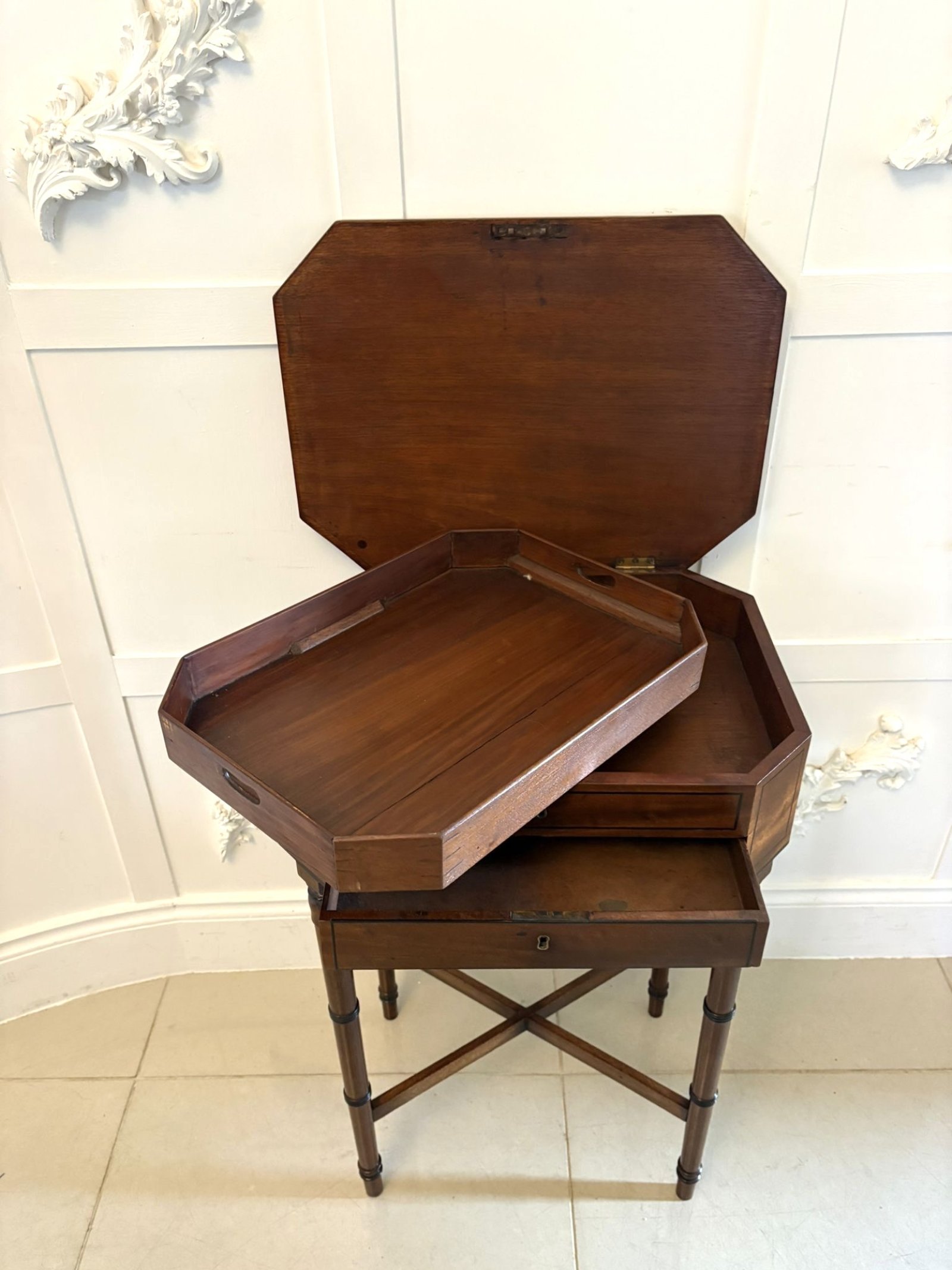 The table features an attractive cut corner top above two drawers and stands on slender turned legs united by an X framed stretcher. The design displays the refined proportions and restrained elegance associated with late Georgian furniture.