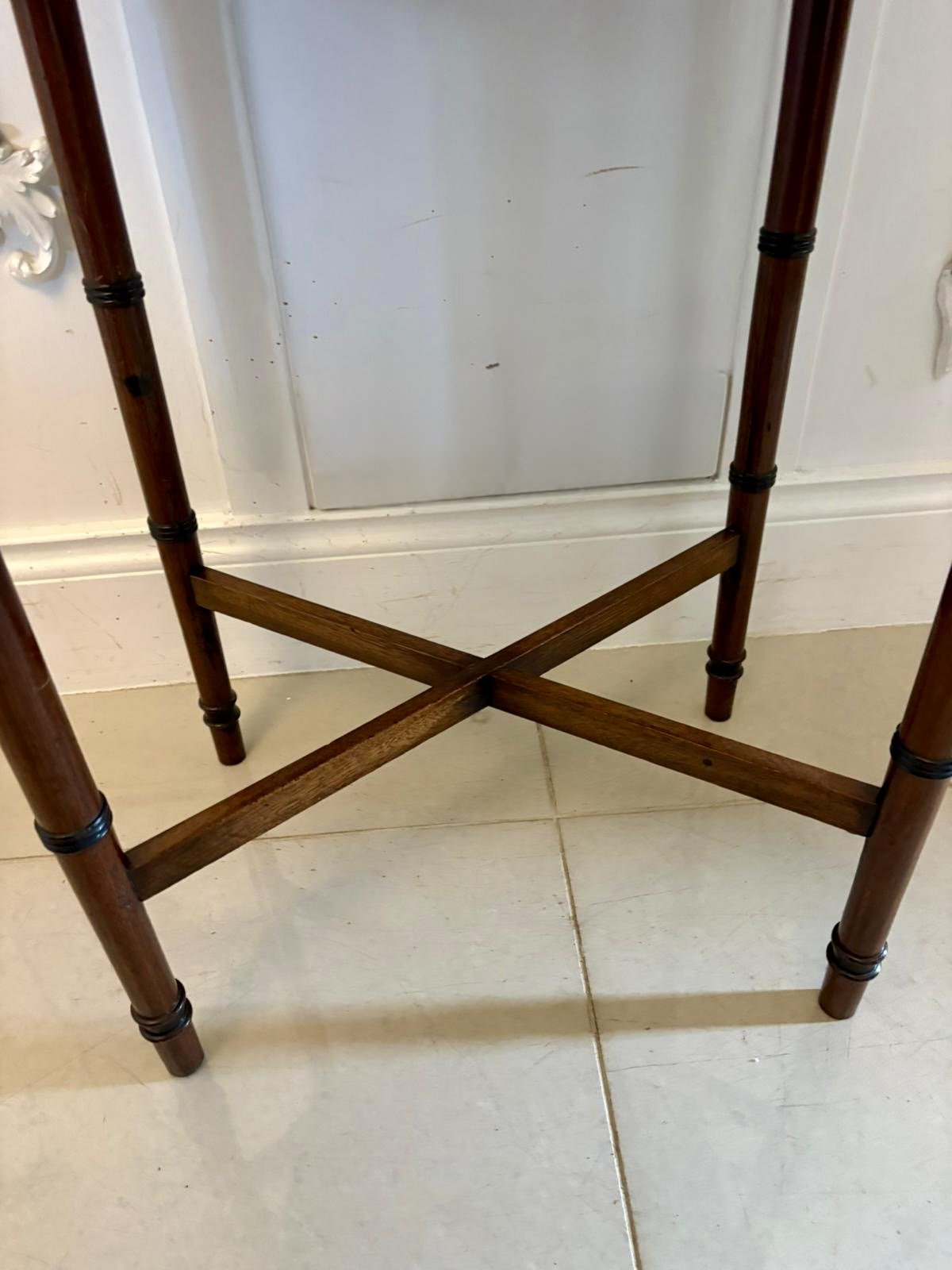 Today they are more commonly used as lamp tables or occasional tables beside a sofa or chair, making them both practical and decorative pieces of early English furniture.