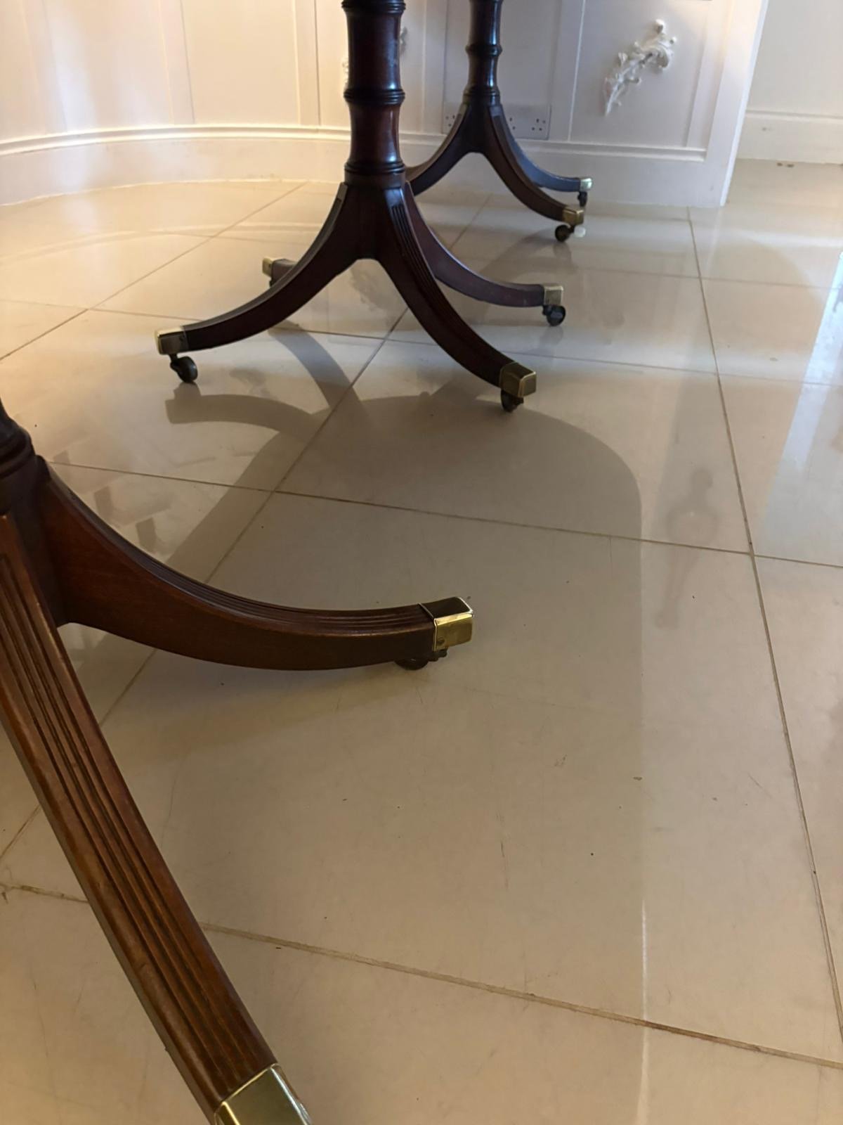 A fine quality Georgian mahogany triple pillar dining table of generous proportions designed to seat twelve to fourteen people comfortably when fully extended. A classic and highly desirable form offering both scale and flexibility.
