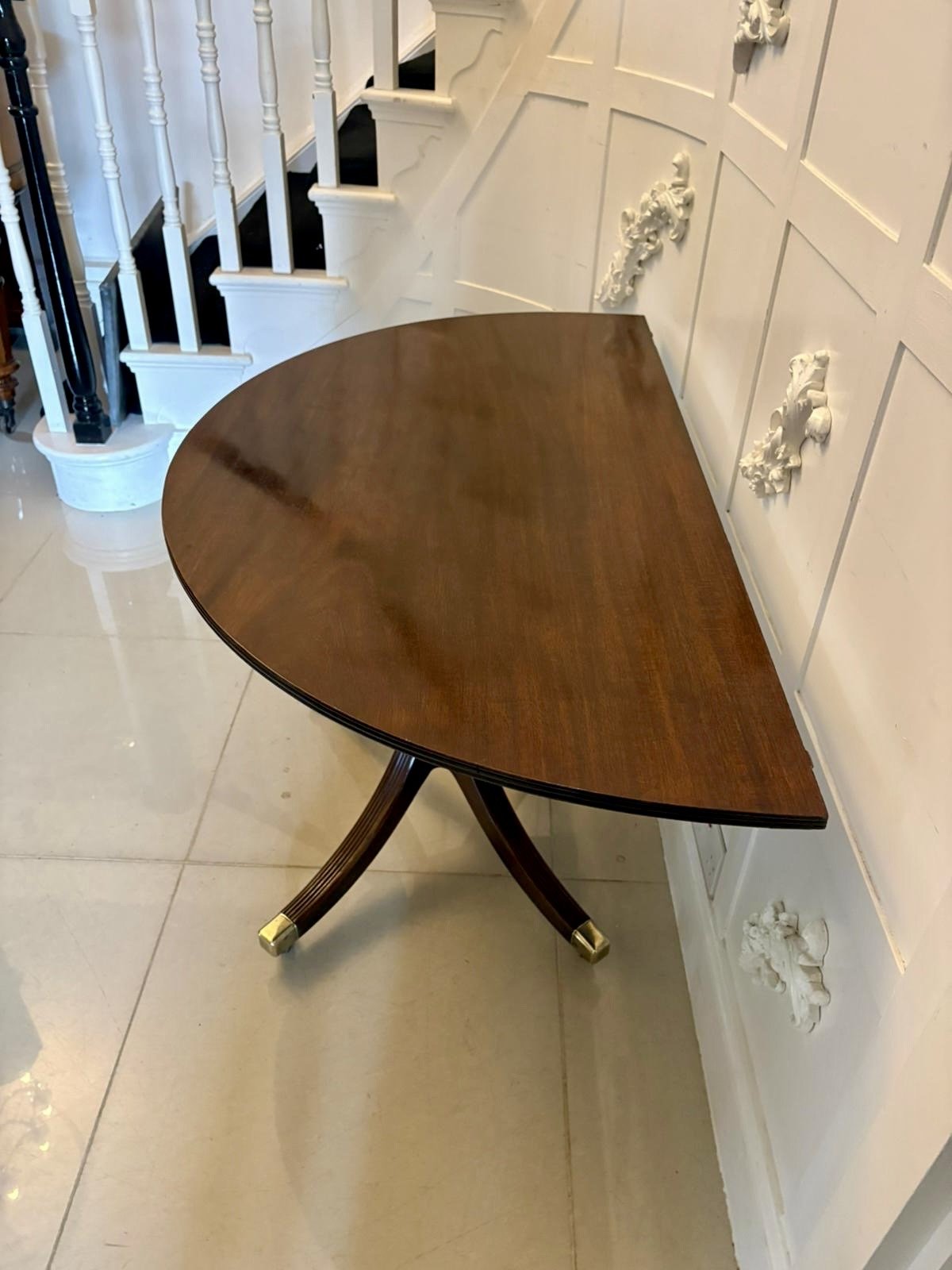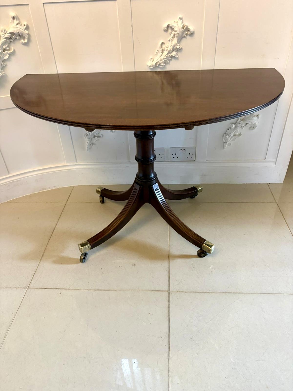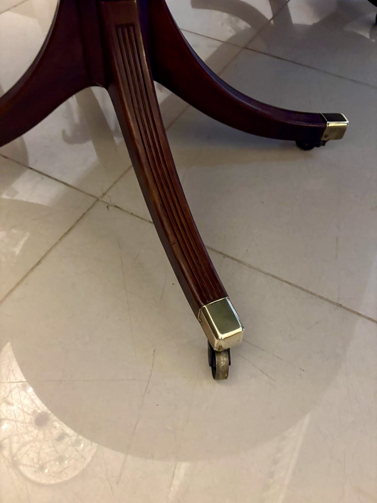 The table stands on three elegant turned pedestal columns each raised on swept reeded legs terminating in original brass capped castors. The proportions are excellent with a well balanced stance giving both strength and visual elegance.