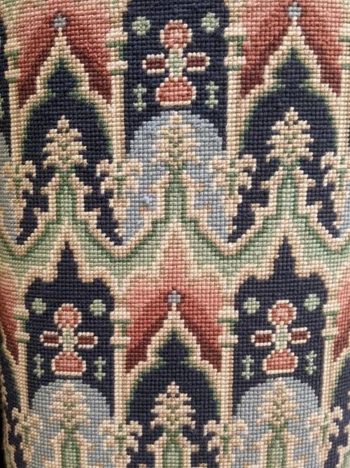 The high back chair is upholstered in a thick tapestry fabric which is in very good condition. The columns have hand carved finials in solid rosewood and the chair has a swag design apron with turned ball terminals.
