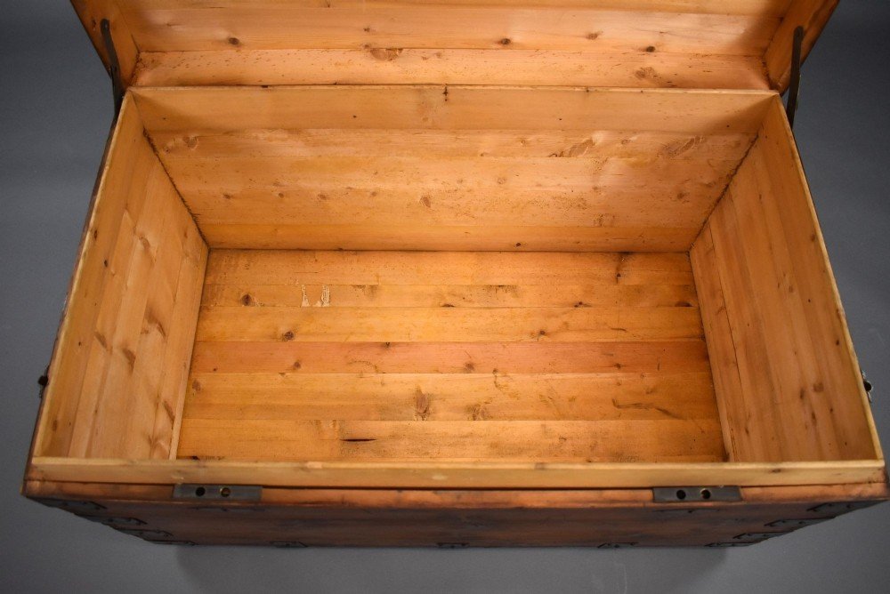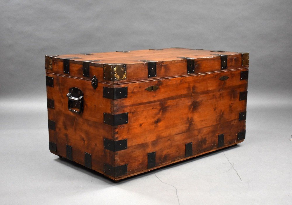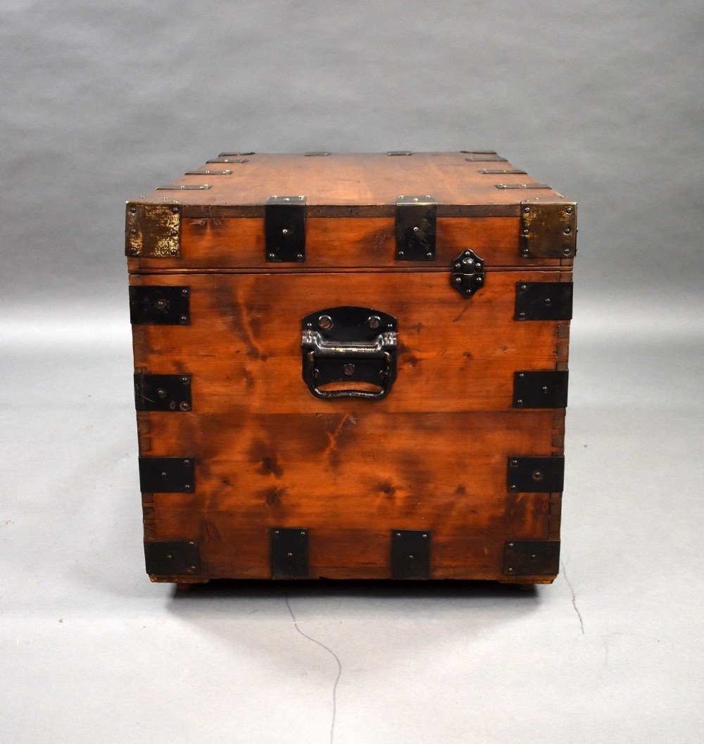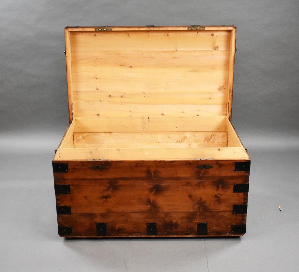 Antique Iron bound Pine Trunk in good condition with carrying handles either side. Would be ideal to be used as a coffee table/storage.