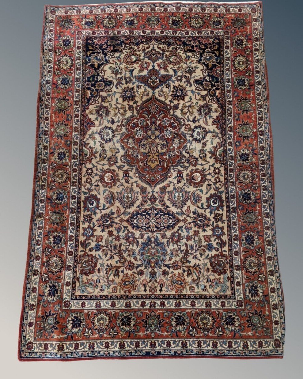 This is an exceptionally fine antique Ishfahan prayer carpet dating from the late 19th Century. The carpet has a well drawn design with a very pretty central scalloped lozenge set in a warm ivory flower filled field all beneath an ornate mihrab above and warm red deep borders around. This is a very finely woven carpet with great detail and an appealing colour palette. The carpet is in good overall condition for its age and has some areas of light wear and a low even pile. It measures 233 cms by 138 cms.