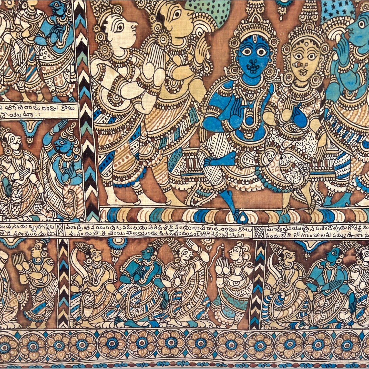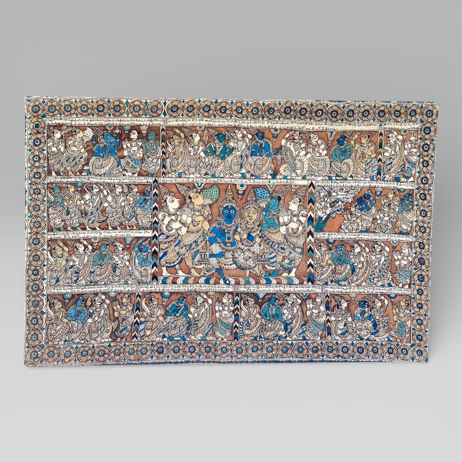 A Kalamkari Temple Painting from South India depicting a Hindu story, circa 1900-1920. This hand-drawn, all-natural hand-dyed textile was a traditional artwork of the temple town of Srikalahasti in Andhra Pradesh in South India. Set on a wooden frame and a string across the back for hanging his art on the wall.