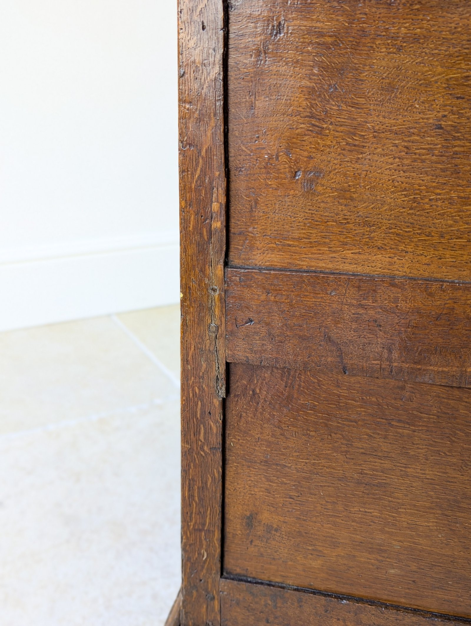 The chest stands on later bracket feet, likely added in the 18th century, as was common for chests of this type. These have aged and patinated alongside the carcass, providing stability while retaining a sympathetic appearance. The brass pear-drop handles and pierced escutcheons are also slightly later replacements, themselves of good age and entirely appropriate to the piece.