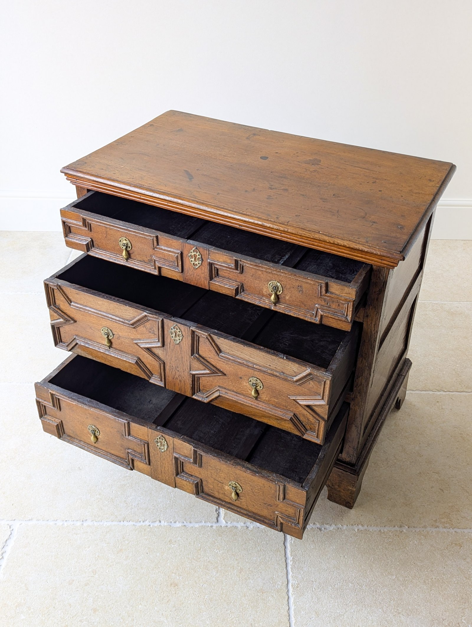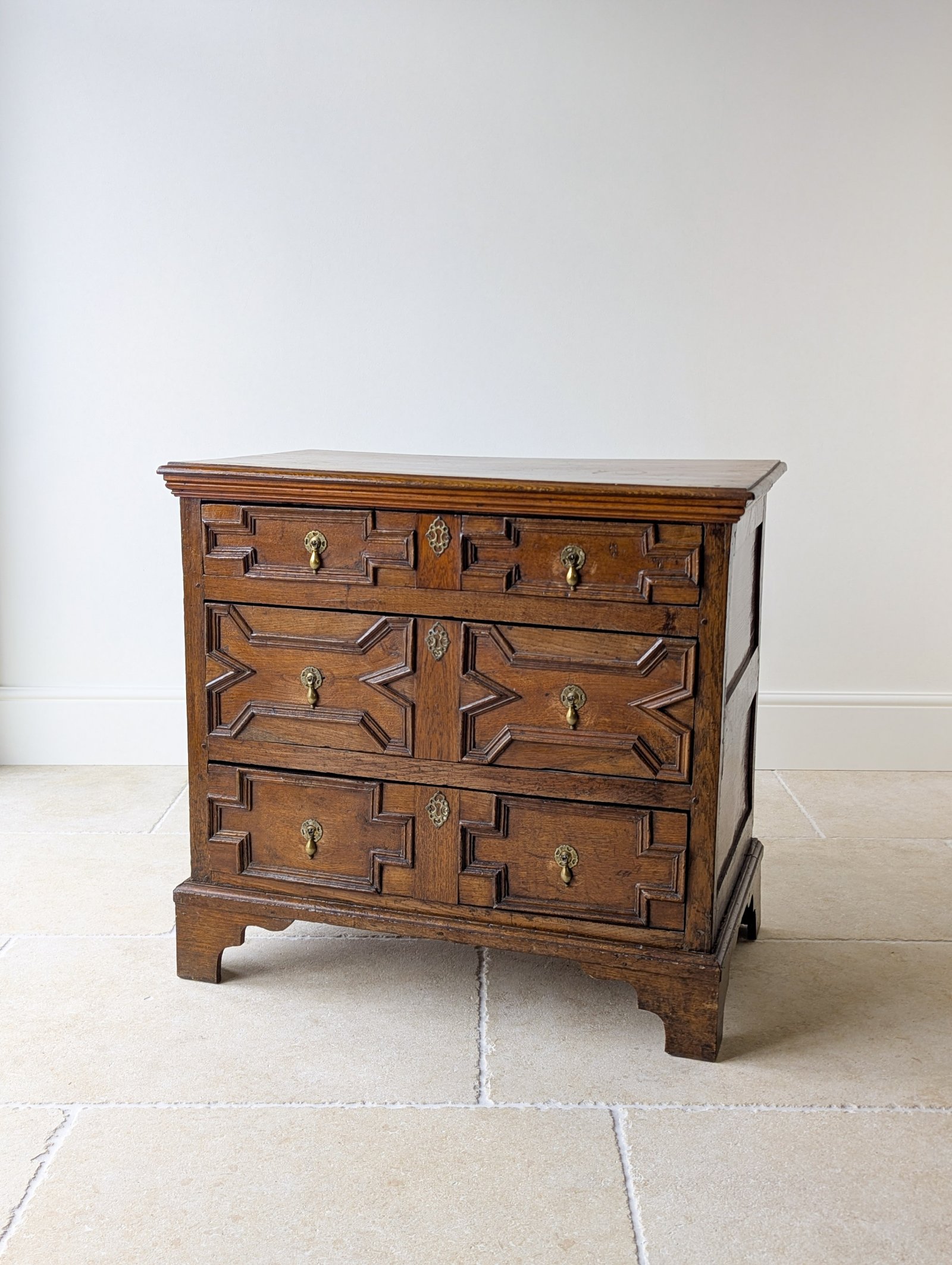 A fine late 17th century chest of drawers constructed in solid oak, with characteristic geometric mouldings and a richly matured patina with a deep honey tone.