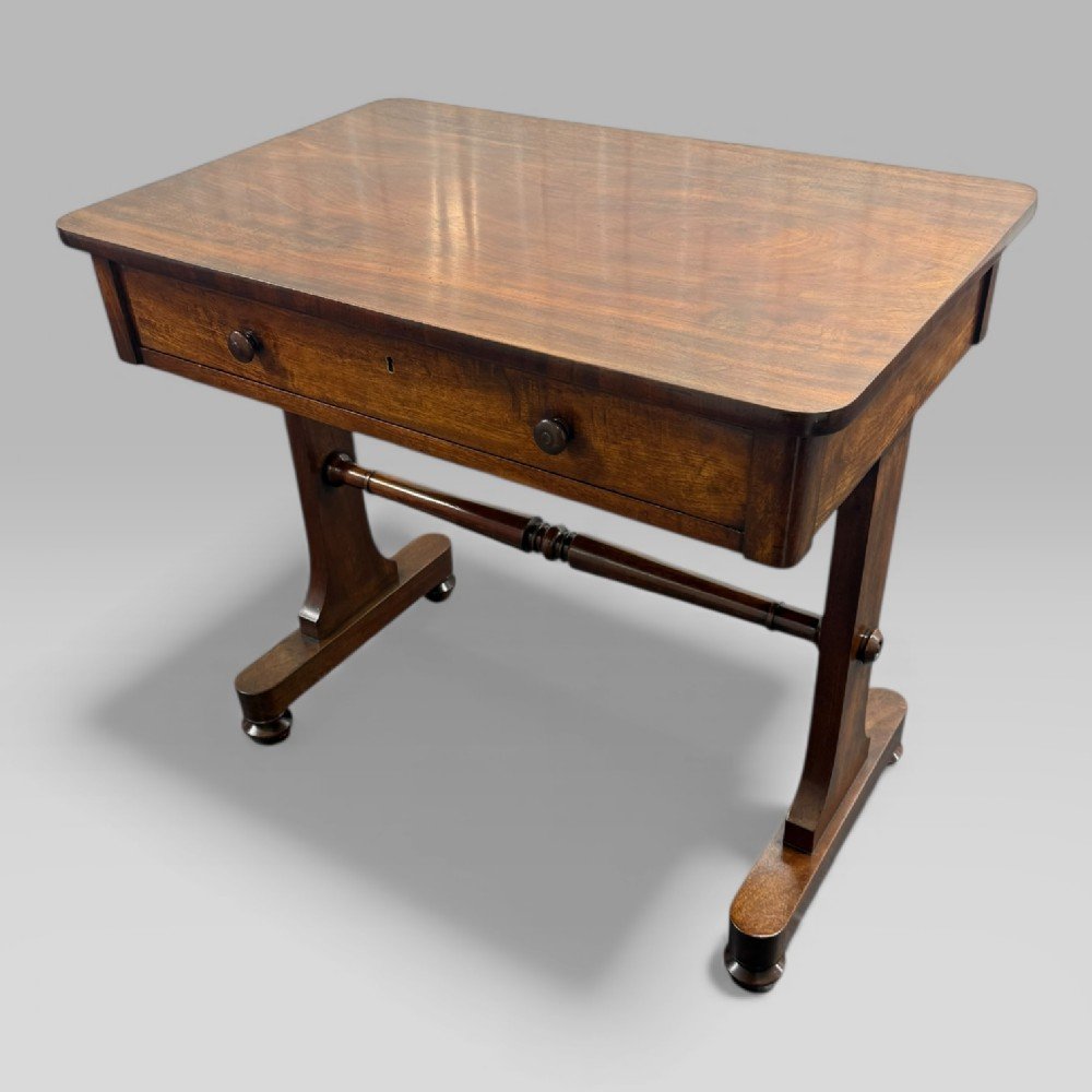A William IV mahogany centre table (circa 1830–1837), fitted with a single drawer to the frieze. The table is supported on straight legs with small carved decoration to the centres, joined by a turned stretcher, and stands on castors for ease of movement.