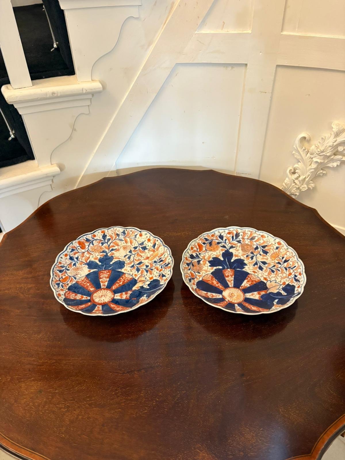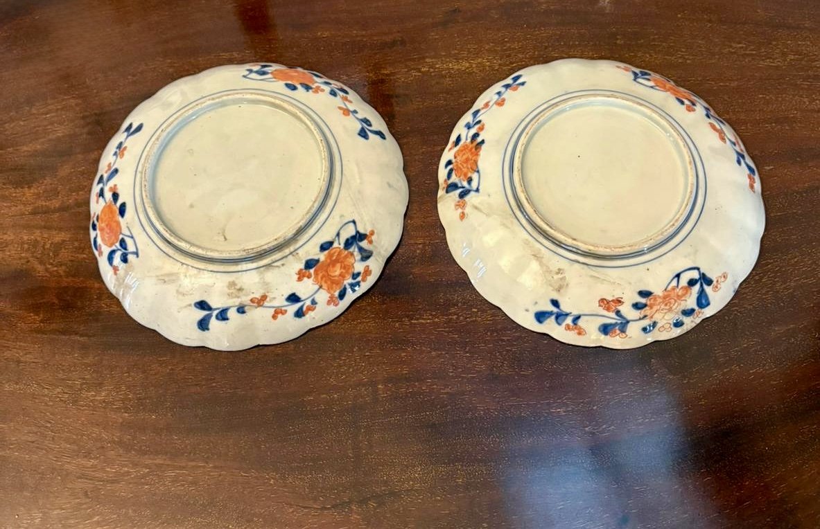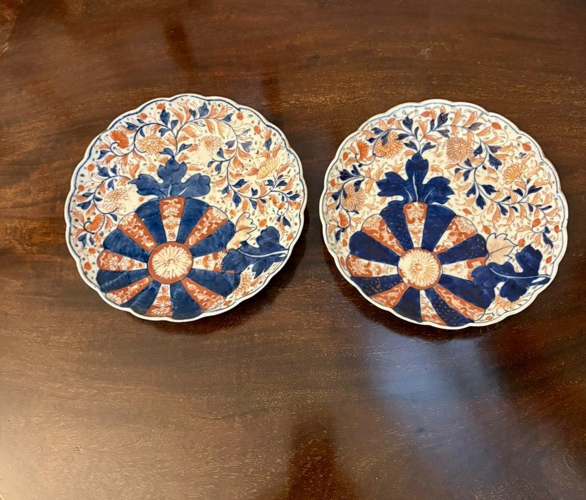 A charming pair of scalloped-edge Japanese Imari plates decorated in the traditional palette of underglaze cobalt blue and overglaze iron-red with gilt highlights. Each plate features a bold central roundel with radiating fan-shaped panels alternating between deep cobalt and intricate foliate motifs. The borders are richly decorated with scrolling chrysanthemum and peony designs, executed with fine detail and exhibiting the expressive brushwork characteristic of early Imari wares.