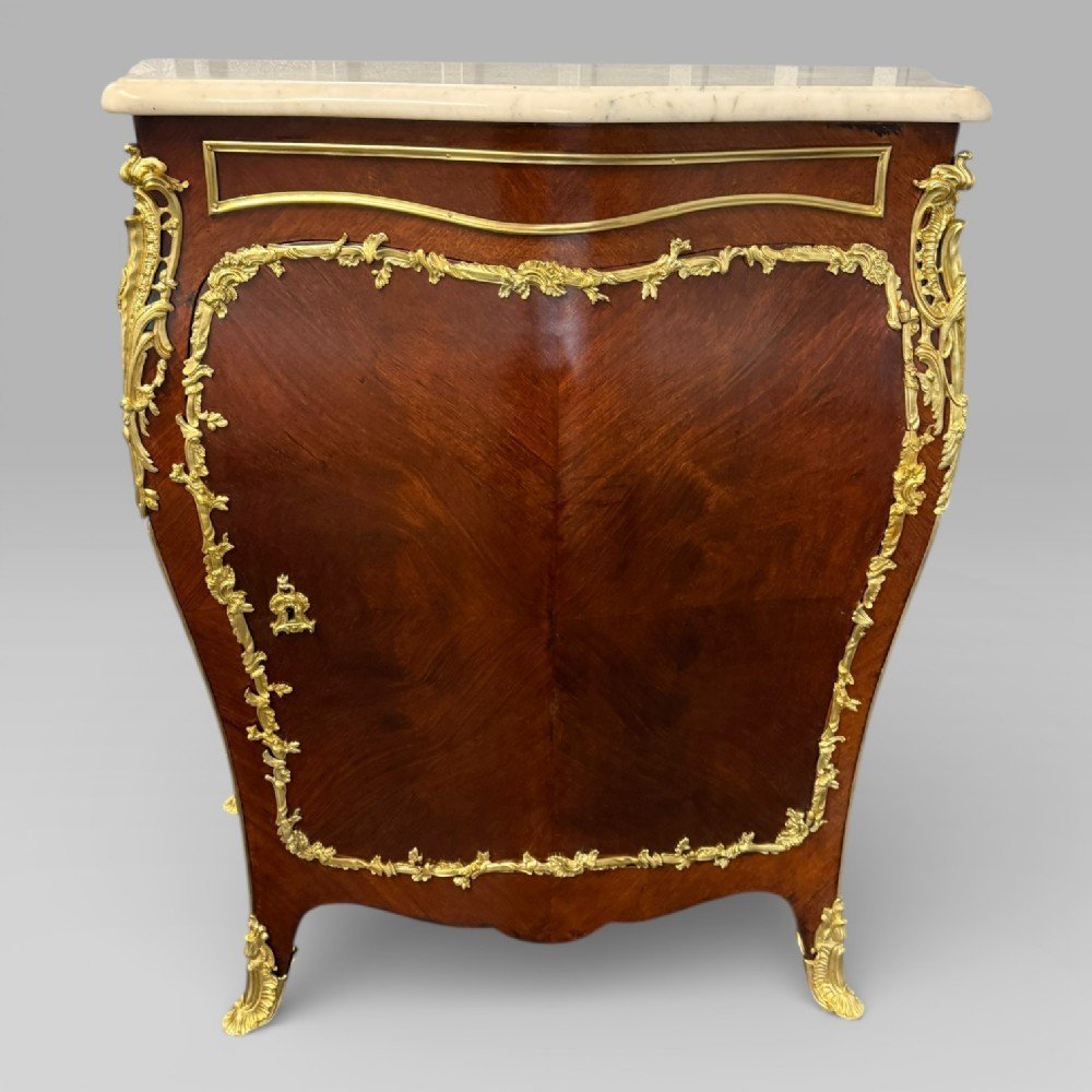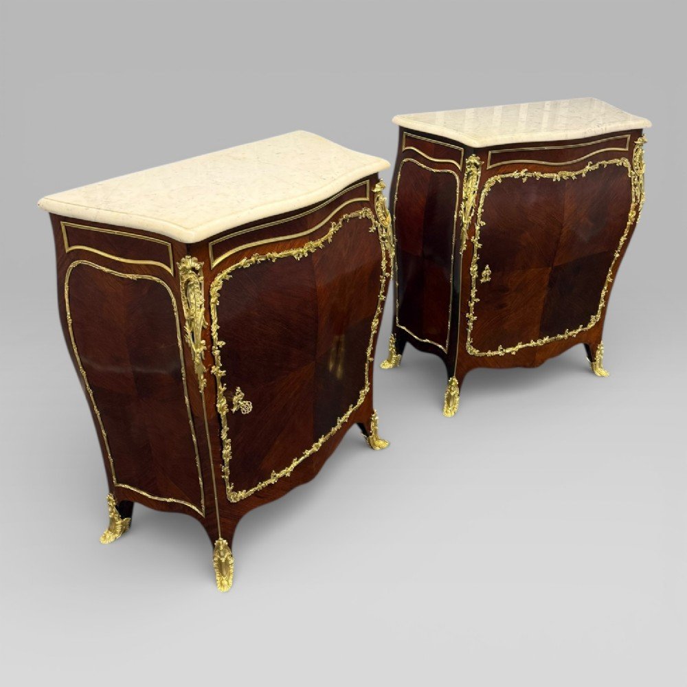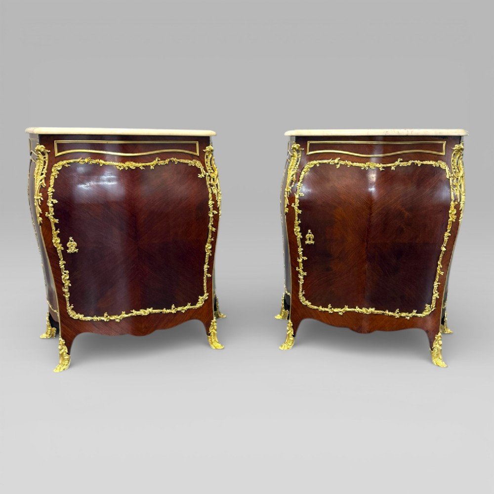 Each cabinet is fitted with a single door, opening to reveal a shelved interior, and is extensively decorated with floral ormolu (gilt bronze) mounts. The bombe form is present to both the front and sides, and the cabinets feature quarter-veneered kingwood detailing to the front and sides. The mounts frame the doors and continue around the sides, reflecting the level of workmanship typical of high-quality French furniture of the period.
