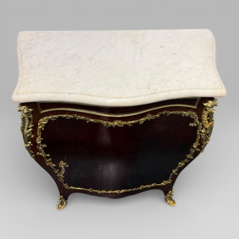 See shipping detailsA pair of late 19th century French kingwood bombe-shaped cabinets, dating to the Belle Époque period (circa 1870–1914), each surmounted by a white Carrara marble top with softly rounded edges. The cabinets are by E. Kahn & Cie. of Paris, with the ormolu mounts stamped “KAHN” to the reverse.