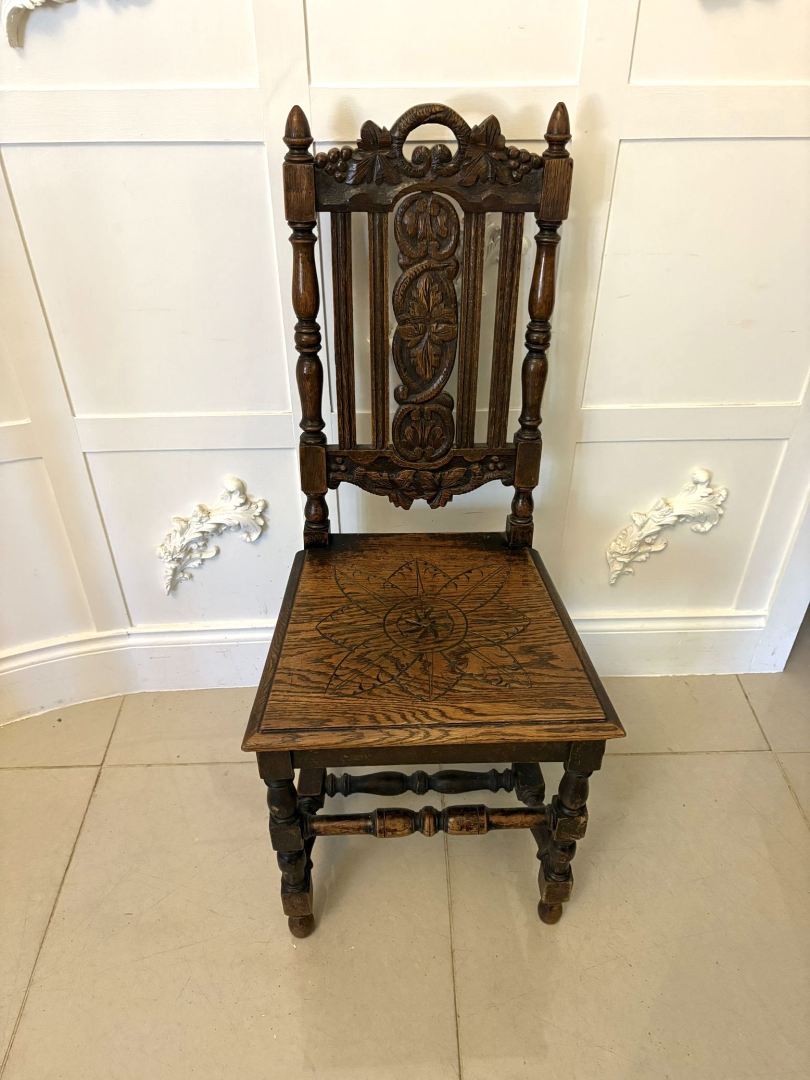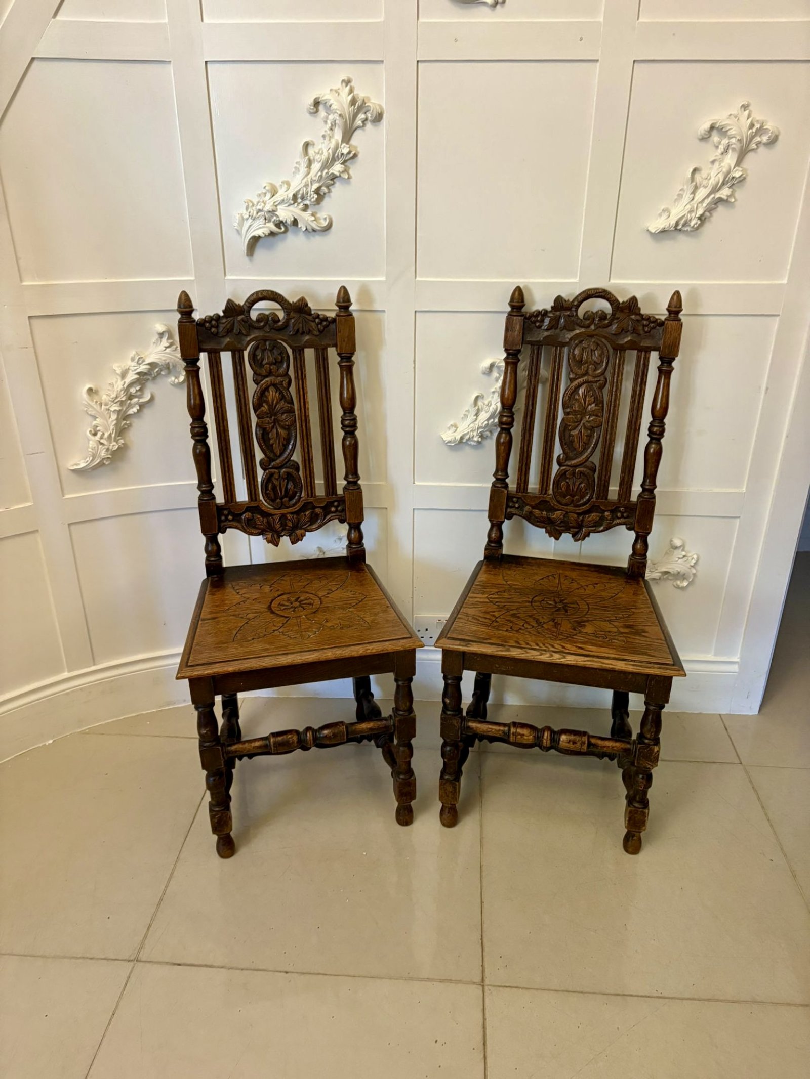A charming pair of late Victorian carved oak side chairs richly modelled with detailed foliate and fruit motifs. Each chair features a high decorative back with finely turned supports, a pierced top rail with vine and grape carving, and a solid oak seat intricately engraved with a central stylised floral design. Raised on robust turned legs united by shaped stretchers, these chairs are full of character and beautifully hand-crafted throughout.