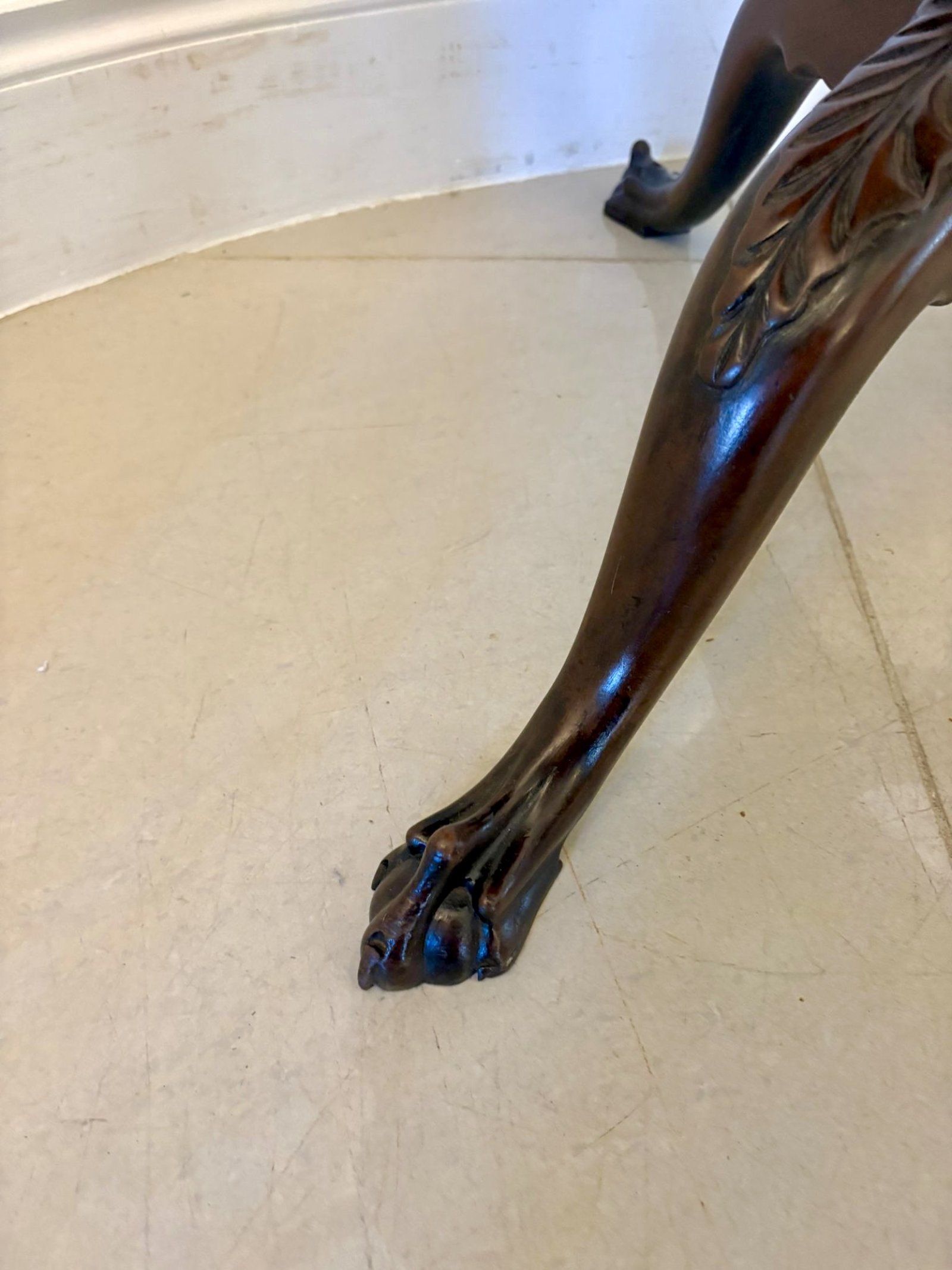 A well-proportioned Antique George III mahogany centre table, standing on a finely carved tripod base with elegant cabriole legs terminating in bold claw feet. The circular top is attractively shaped with a scalloped outline and a subtle moulded edge, lending both movement and refinement to the design. The mahogany displays a rich, warm tone with an appealing patina, highlighting the quality of the timber and the confident late 18th-century craftsmanship. Of practical and versatile scale, this table is well suited for use as a centre table, lamp table, or occasional table, fitting comfortably into both classic and contemporary interiors.