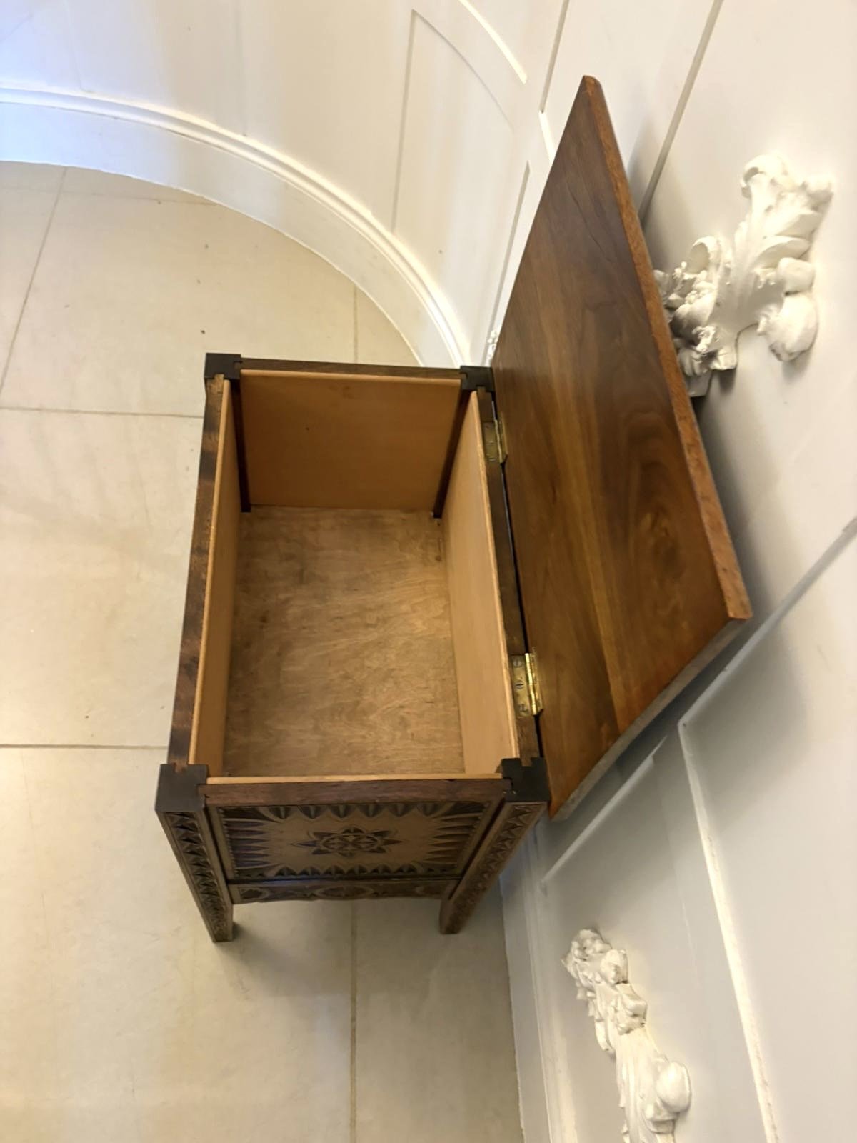 A charming hand-carved marriage /dowry chest featuring intricate geometric and floral carvings on all sides. This beautifully crafted piece showcases exceptional workmanship likely of Central or Eastern European origin with its detailed chip-carved patterns and folk-inspired motifs — including rosettes, fan patterns and radiating stars are characteristic of regional folk art symbolism often representing prosperity, fertility, and good fortune.