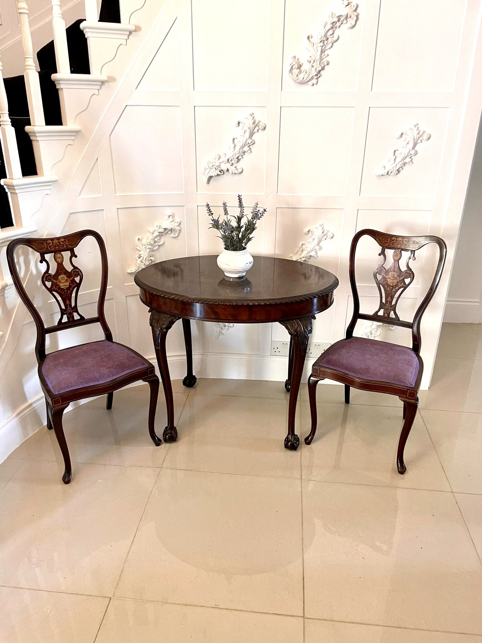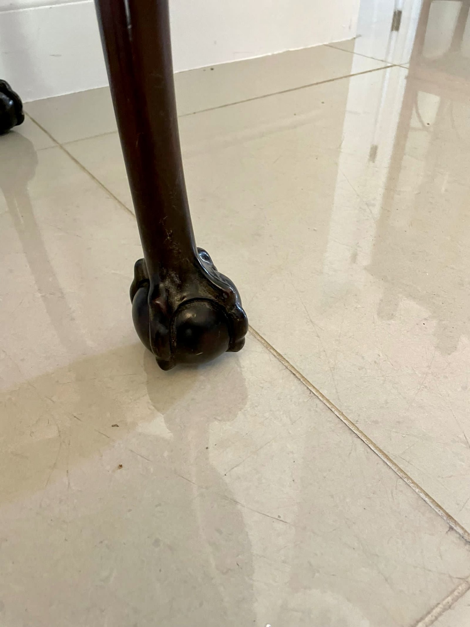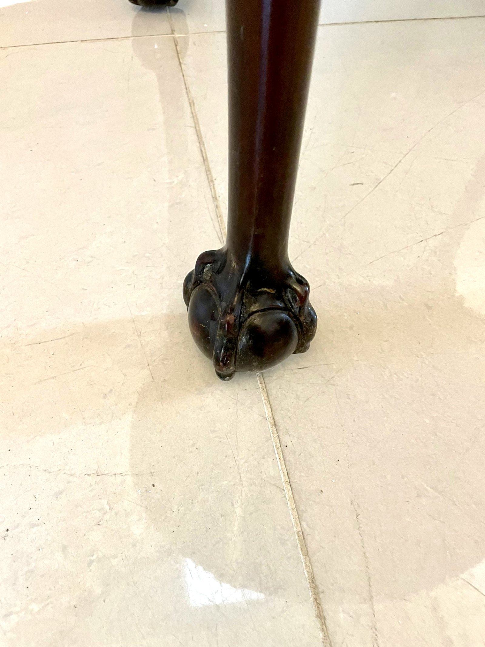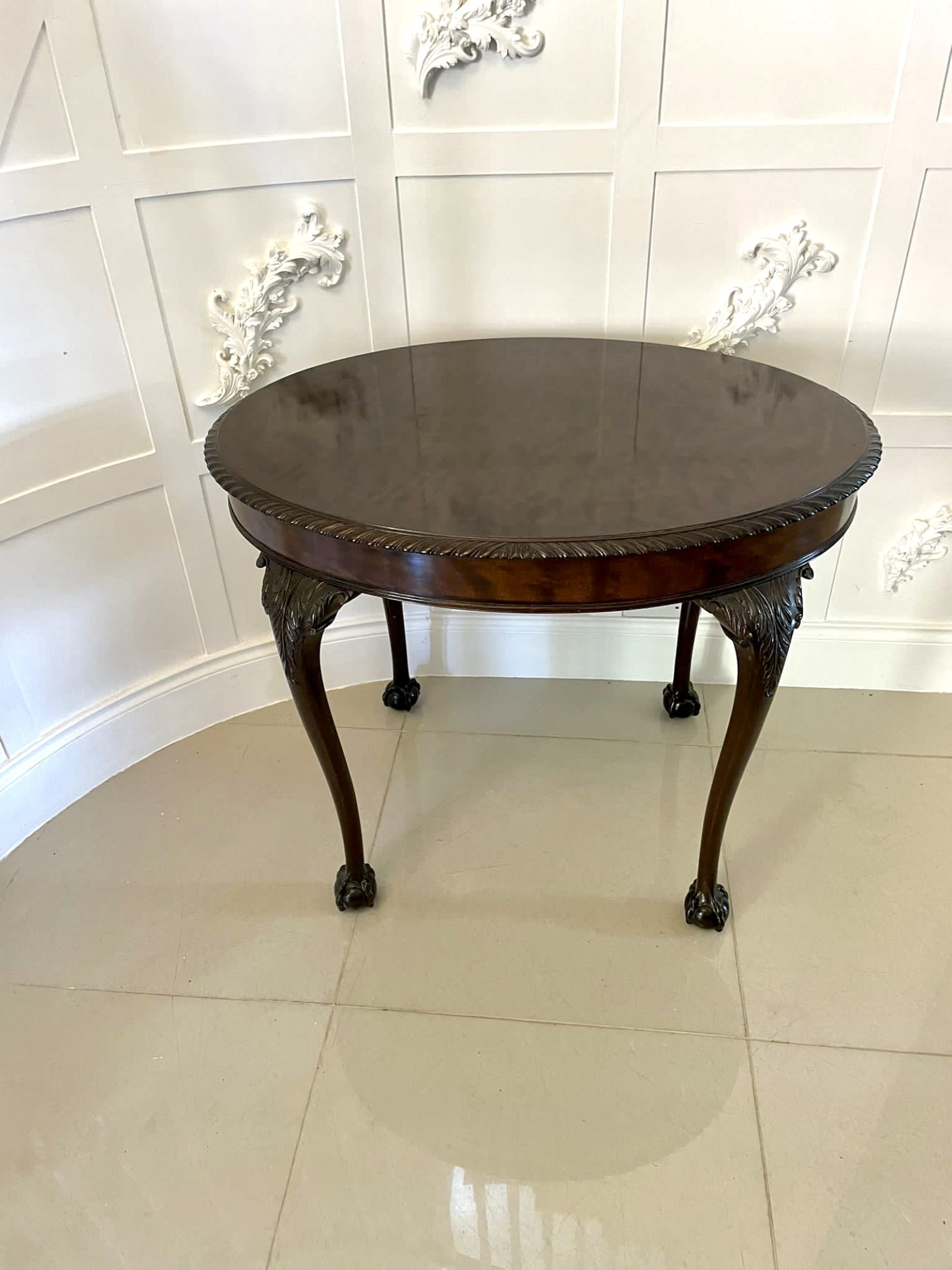 Antique quality oval carved mahogany centre table with a very attractive figured mahogany top and carved moulded edge. It is standing on four lovely carved claw and ball legs.