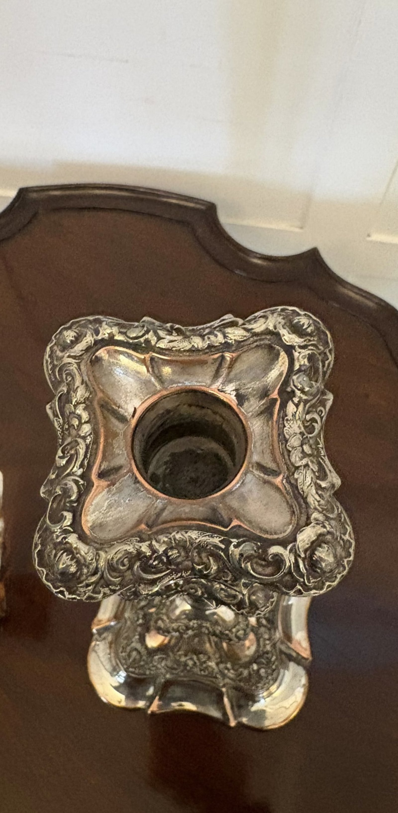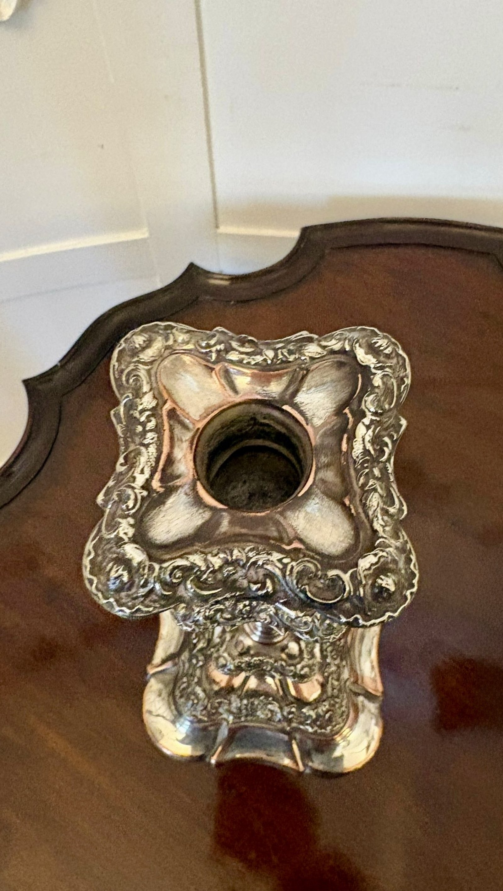 The removable sconces are finely worked with matching chased borders. Subtle copper tones visible beneath the silver plate are consistent with quality period manufacture and add depth to the surface.