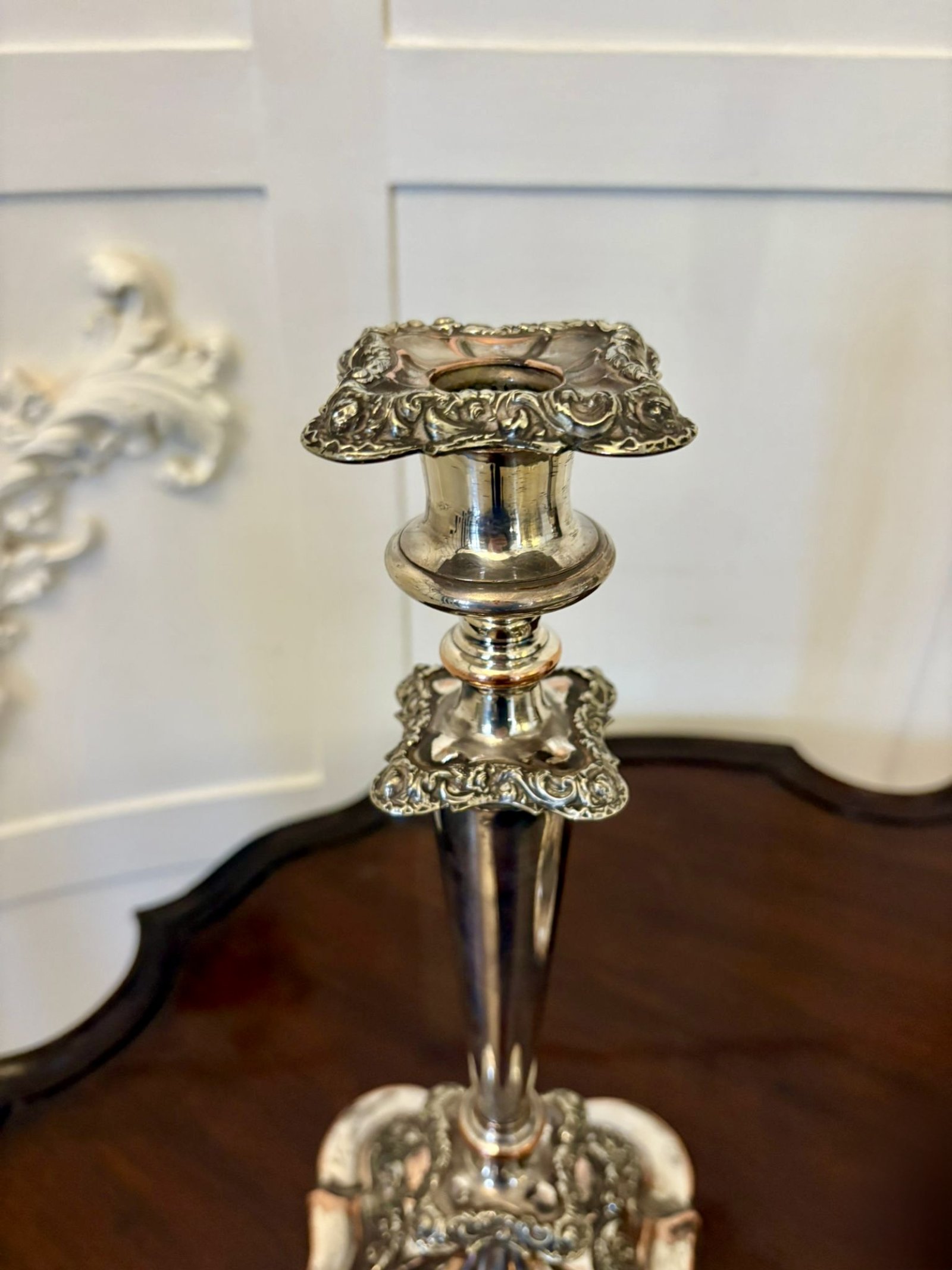 A fine pair of tall antique silver-plated candlesticks, elegantly proportioned and standing on substantial shaped bases. Each example features a tapering column shaft rising from a stepped lobed base, decorated with scrolling foliate and rococo-revival ornament.