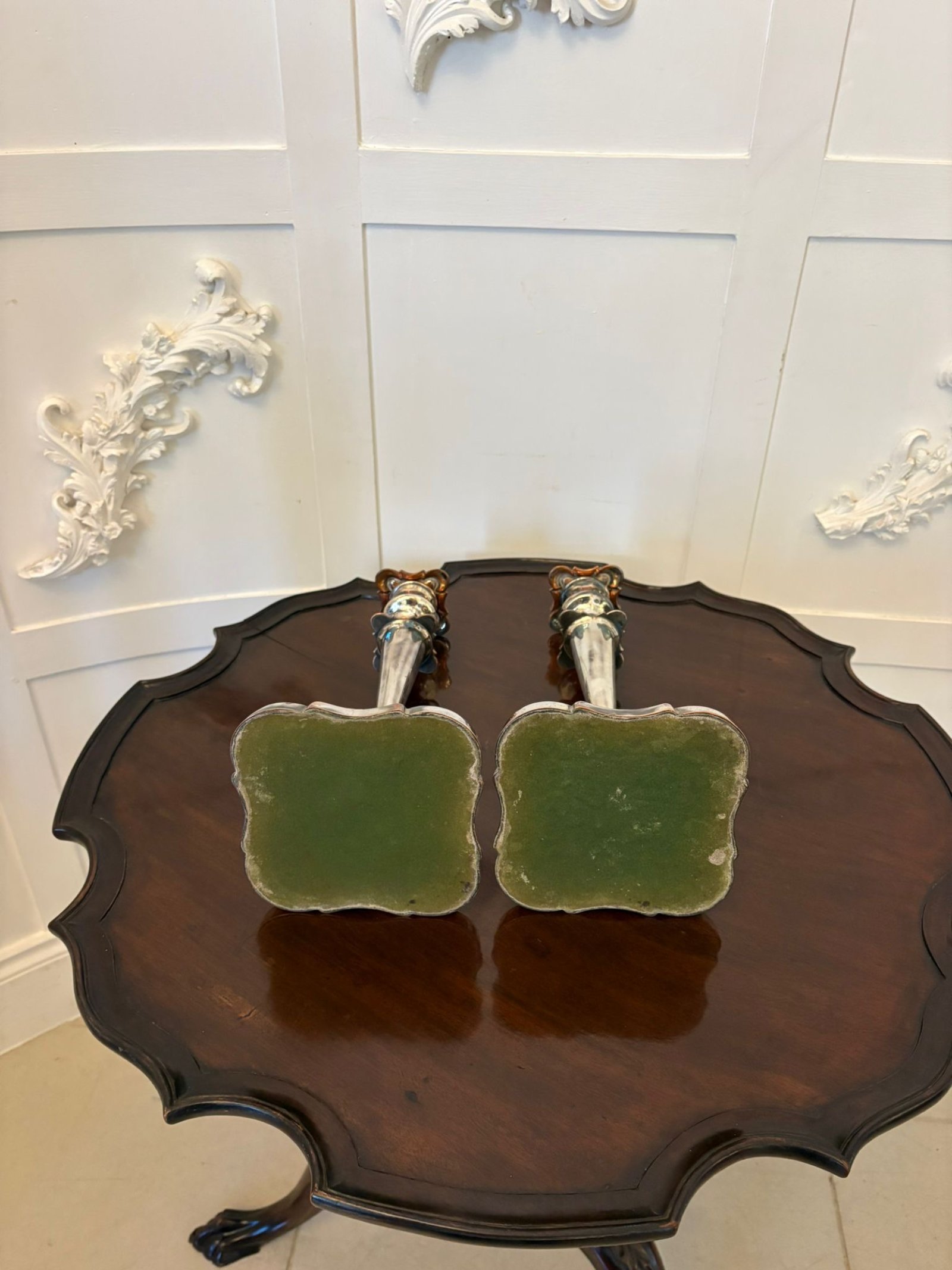 The candlesticks have excellent presence, their notable height giving strong visual impact when displayed on a sideboard, console, or chimneypiece. A decorative and versatile pair, suited to both traditional and contemporary interiors.