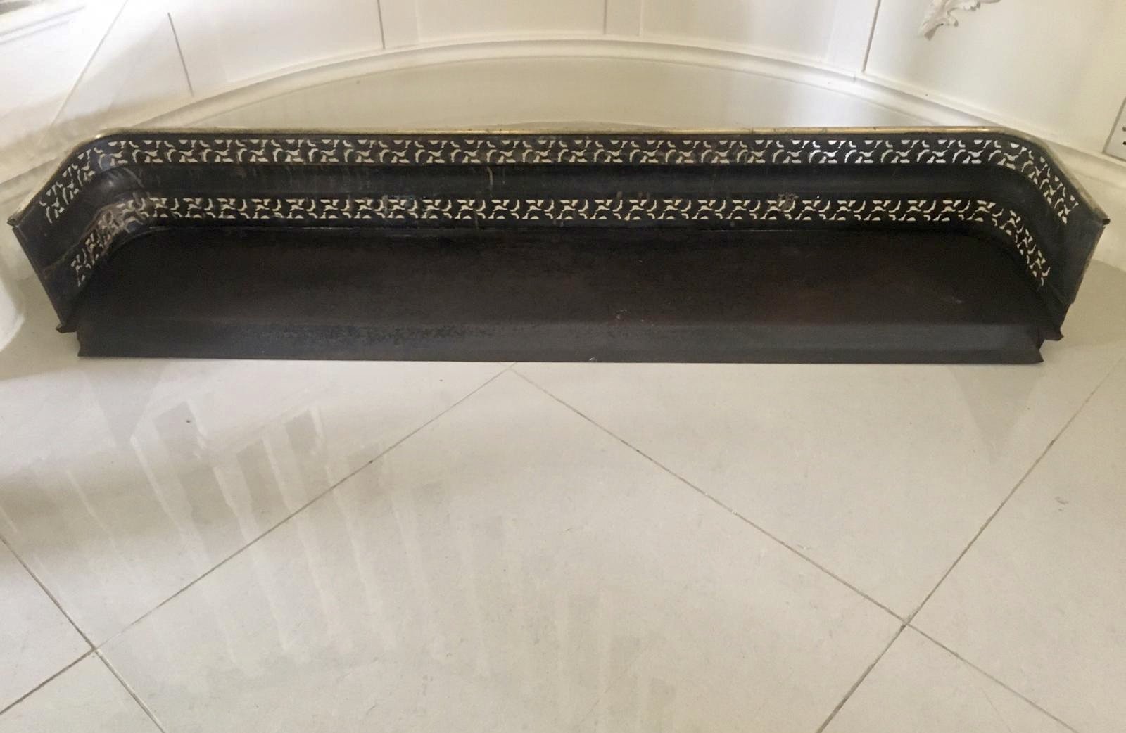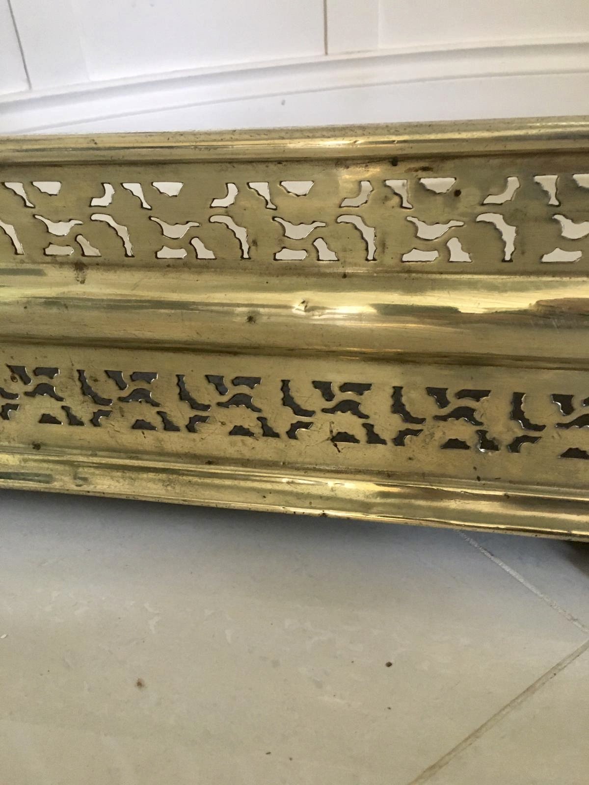 Antique Regency brass fender having a quality pierced decoration to the front and sides. It stands on attractive quality brass paw feet.