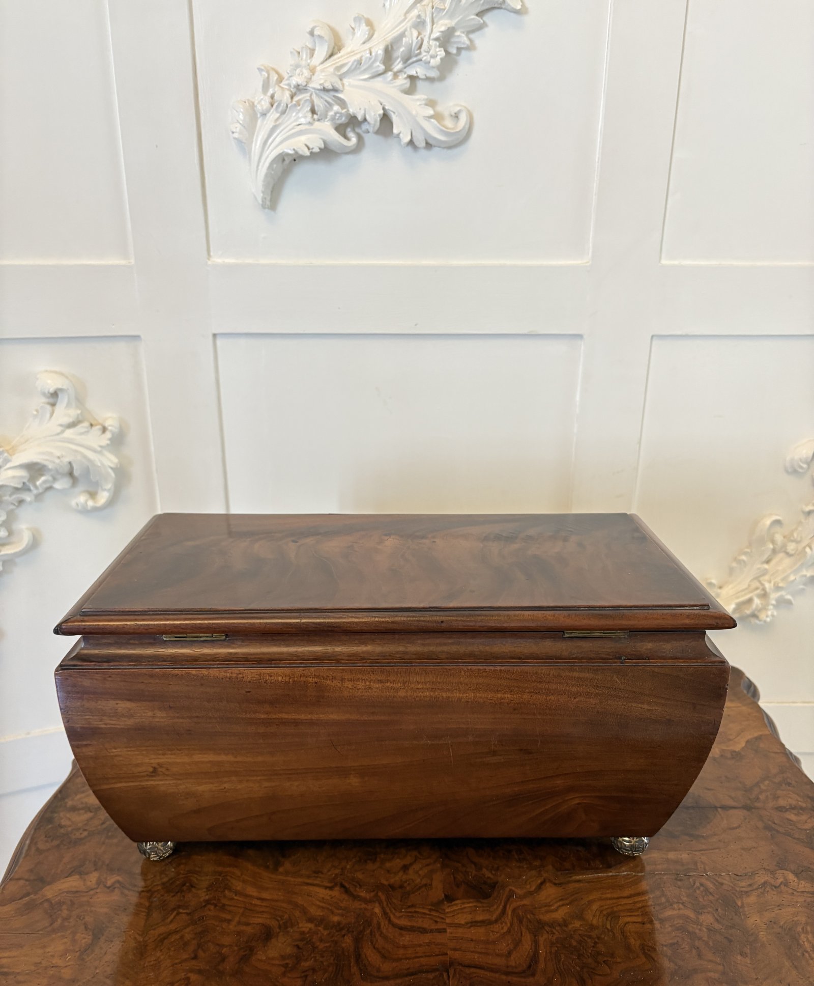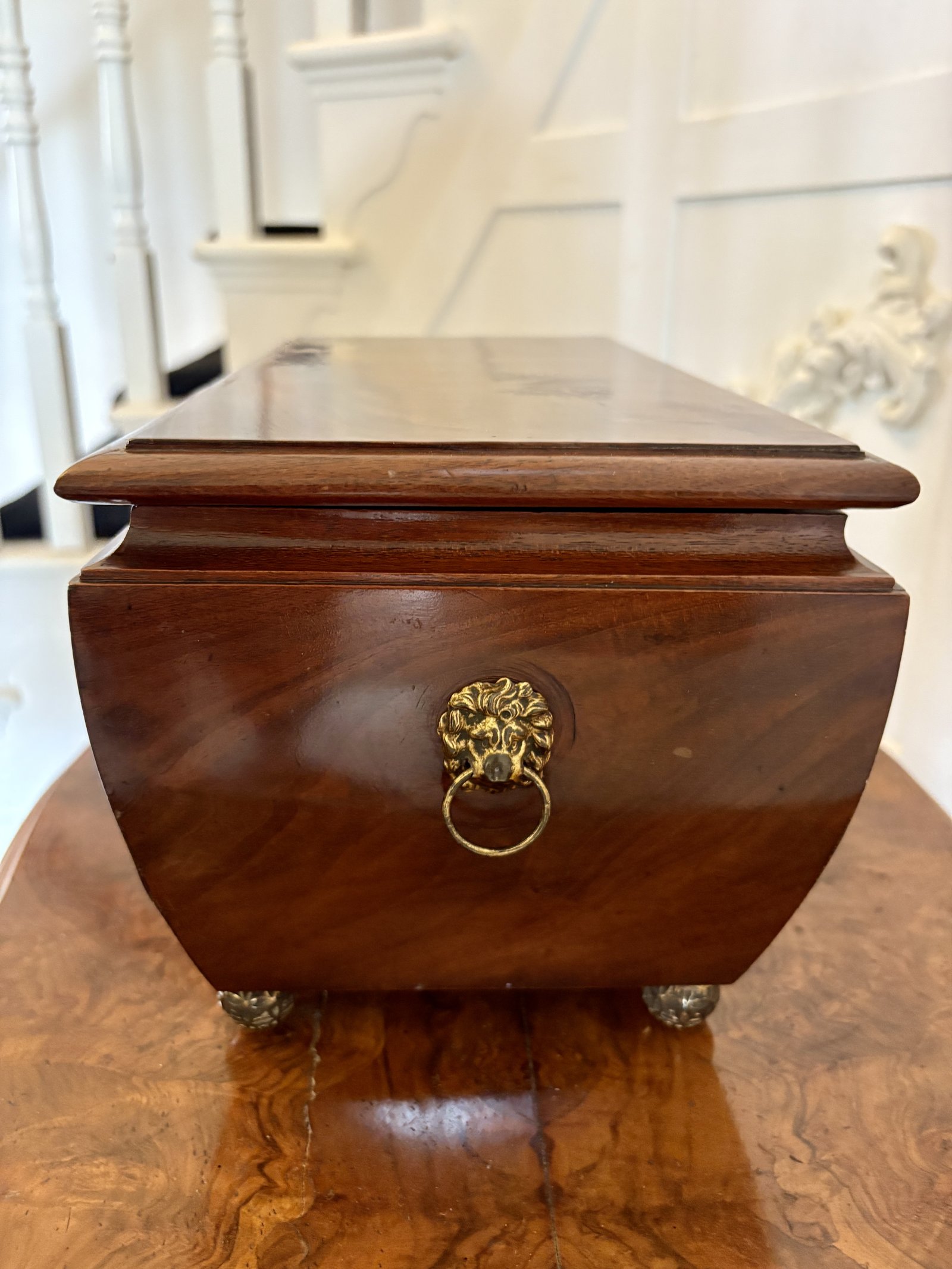 Antique quality Regency figured mahogany tea caddy having a figured mahogany lid opening to reveal three fitted compartments, shaped bombe sides and front, original brass lions head carrying handle and bone escutcheon standing on pretty ornate round brass ball feet