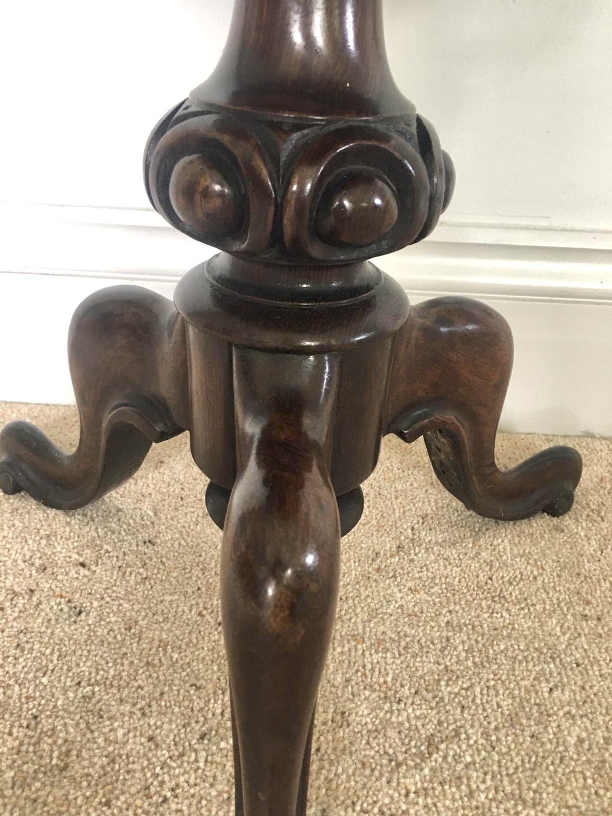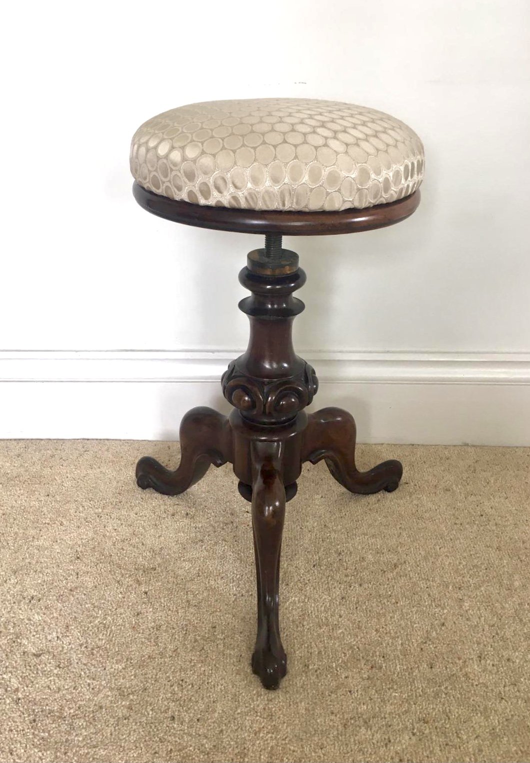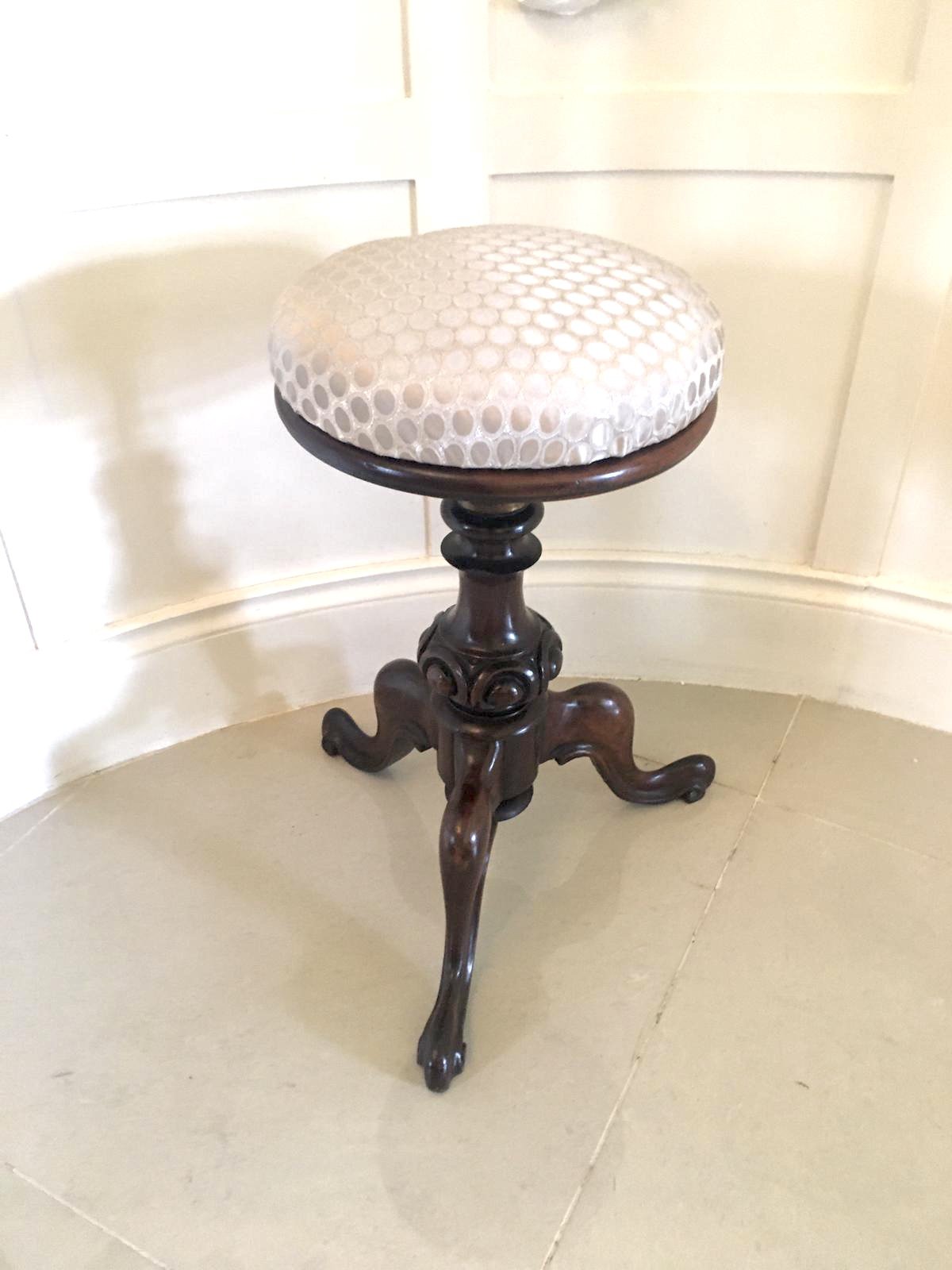 Antique Victorian walnut piano stool having a circle revolving seat newly reupholstered in a quality stylish fabric. It is raised on and elegant and carved solid walnut shaped turned column and stands on three solid walnut shaped cabriole legs with scrolled feet.