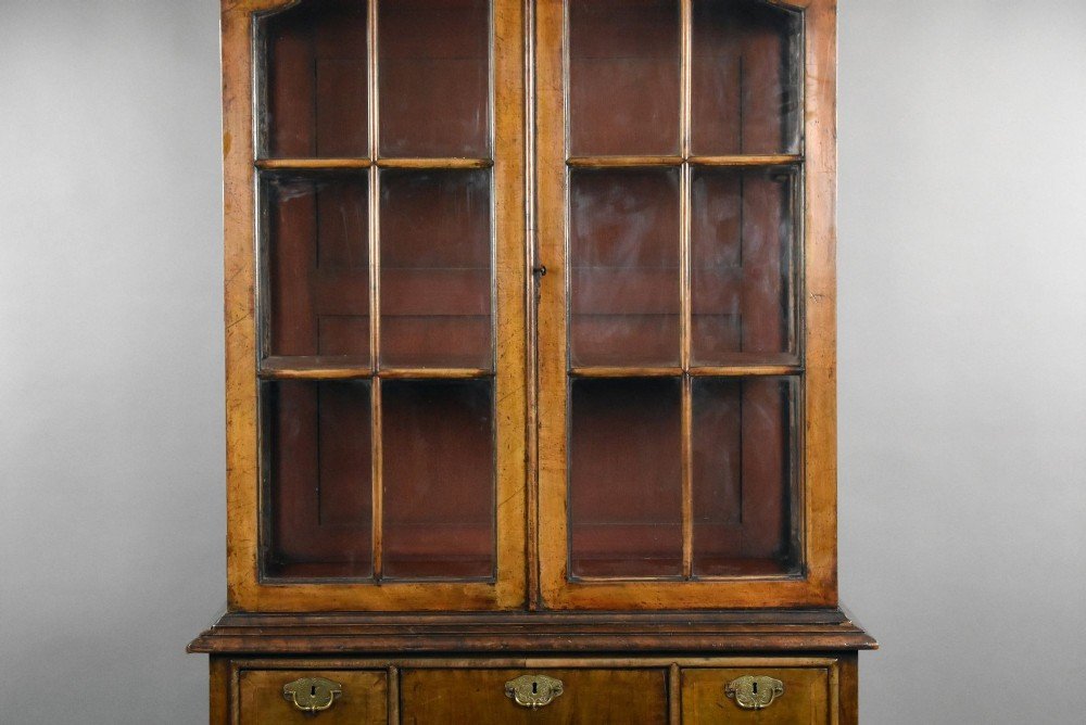 A fine Queen Anne style walnut cabinet on stand, circa 1900, of elegant proportions and rich colour. The upper section features an arched cornice above a pair of astragal-glazed doors opening to a shelved interior, ideal for displaying treasured items. Below, the base is fitted with an arrangement of three short drawers above a long drawer, all retaining their brass plate handles and escutcheons. The whole is raised on well-turned baluster legs united by shaped stretchers, terminating in bun feet.