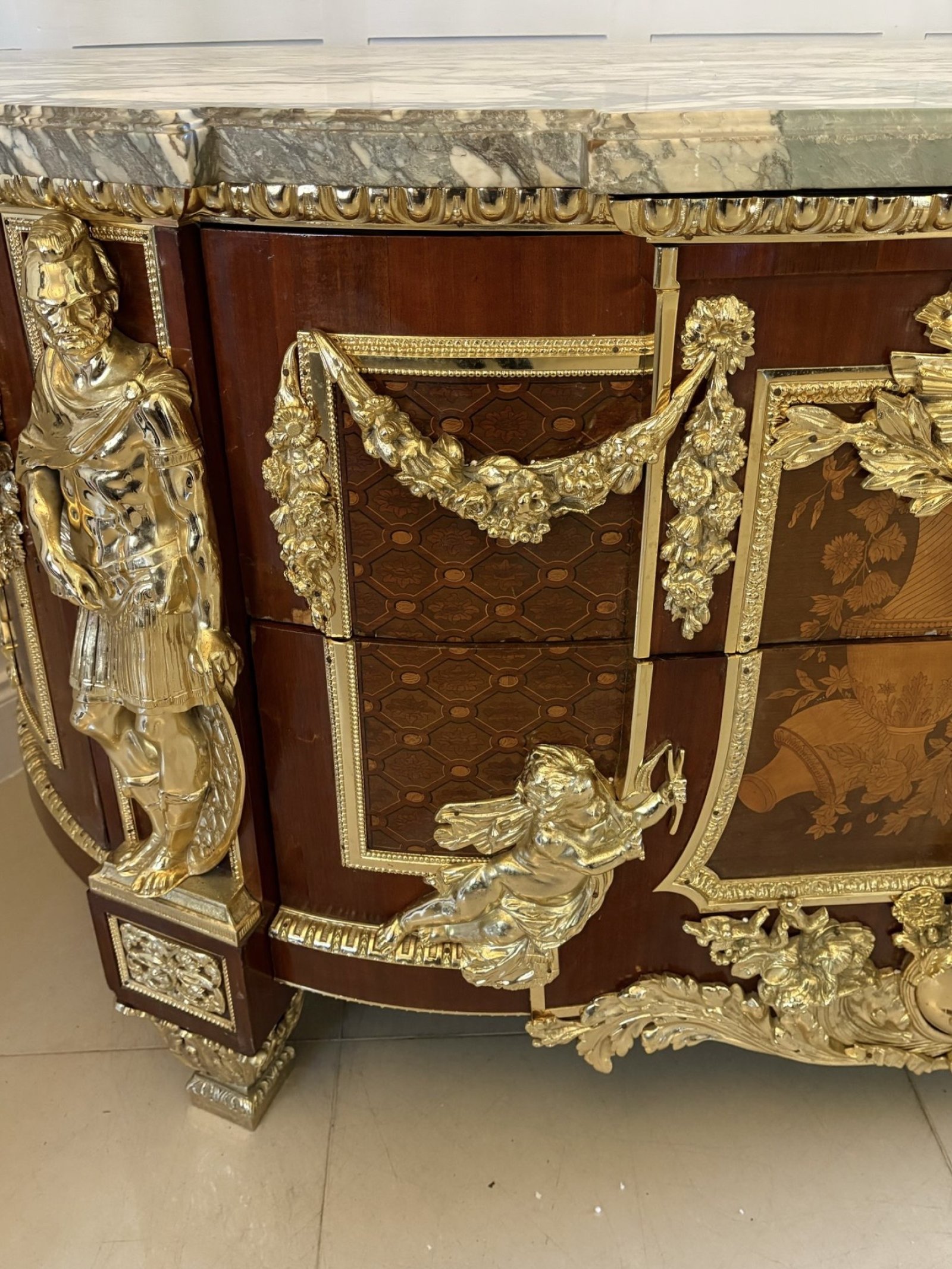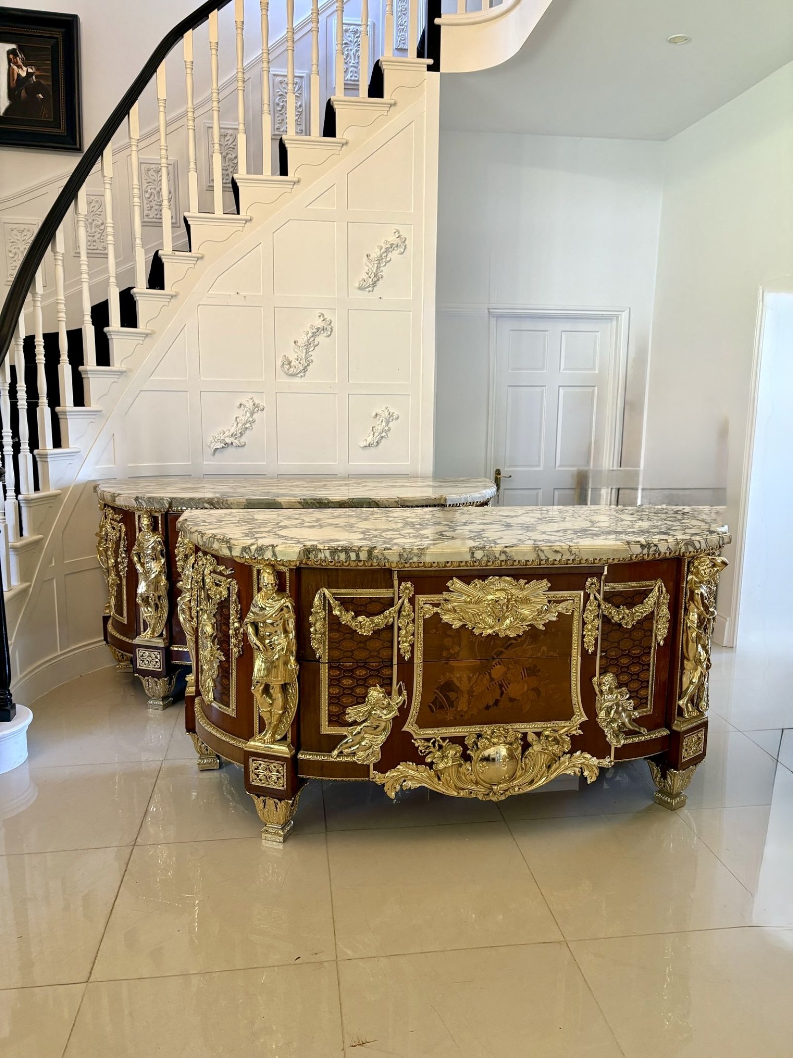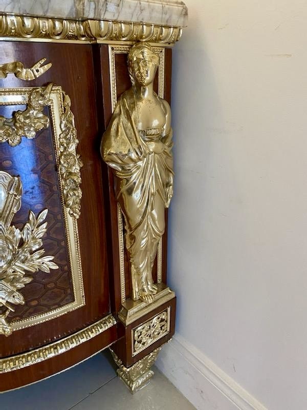 Antique fine French rare pair of early 20th century mahogany, fruitwood marquetry and gilt bronze mounted commodes In the Louis XVI Style, after the original model of the commode commissioned for the bedroom of Louis XVI at Versailles (d. 1774) by Jean-Henri Riesener (French, 1734-1806). The two-drawer and two-side door "D" shaped commodes both boast a white and mottled white-gray marble top resting on the base which depicts four armorial bronze figures emblematic of Courage, Force, Prudence and Tempérence. The centre marquetry panel with a floral still life and vase design flanked on each side by cherubs emblematic of Bienfaisance and Justice below a sunburst mask ormolu mount; the lower apron centred with a sphere with Fleur-de-lis, a French term meaning "lily flower," is a stylised emblem or device often associated with French royalty, and representing purity, light, and life surmounted by two floral cornucopias. The rounded sides each fitted with a cupboard door.