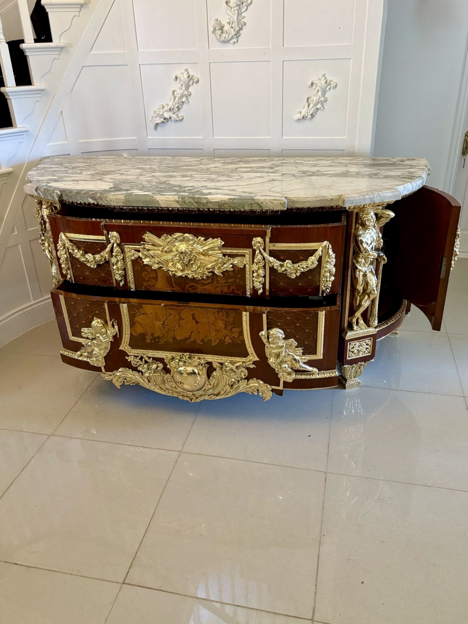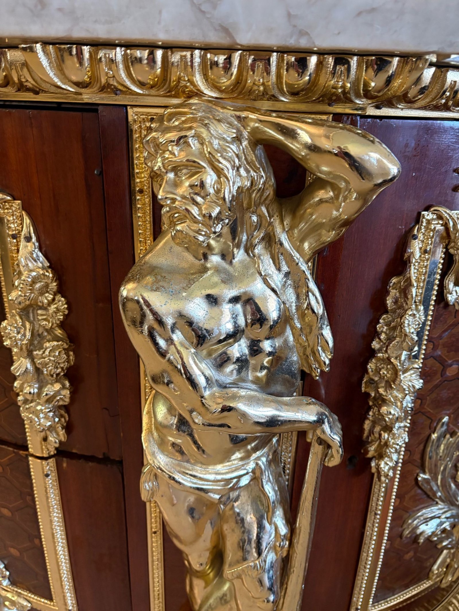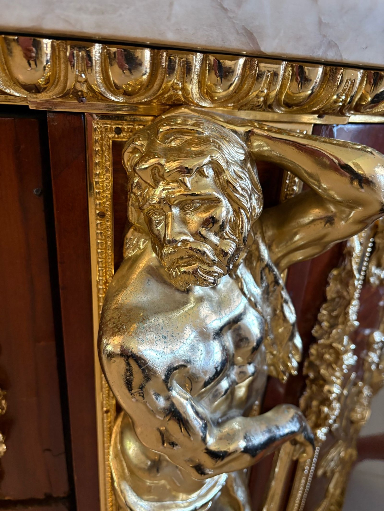 Antique fine French rare pair of early 20th century mahogany, fruitwood marquetry and gilt bronze mounted commodes In the Louis XVI Style, after the original model of the commode commissioned for the bedroom of Louis XVI at Versailles (d. 1774) by Jean-Henri Riesener (French, 1734-1806). The two-drawer and two-side door "D" shaped commodes both boast a white and mottled white-gray marble top resting on the base which depicts four armorial bronze figures emblematic of Courage, Force, Prudence and Tempérence. The centre marquetry panel with a floral still life and vase design flanked on each side by cherubs emblematic of Bienfaisance and Justice below a sunburst mask ormolu mount; the lower apron centred with a sphere with Fleur-de-lis, a French term meaning "lily flower," is a stylised emblem or device often associated with French royalty, and representing purity, light, and life surmounted by two floral cornucopias. The rounded sides each fitted with a cupboard door.