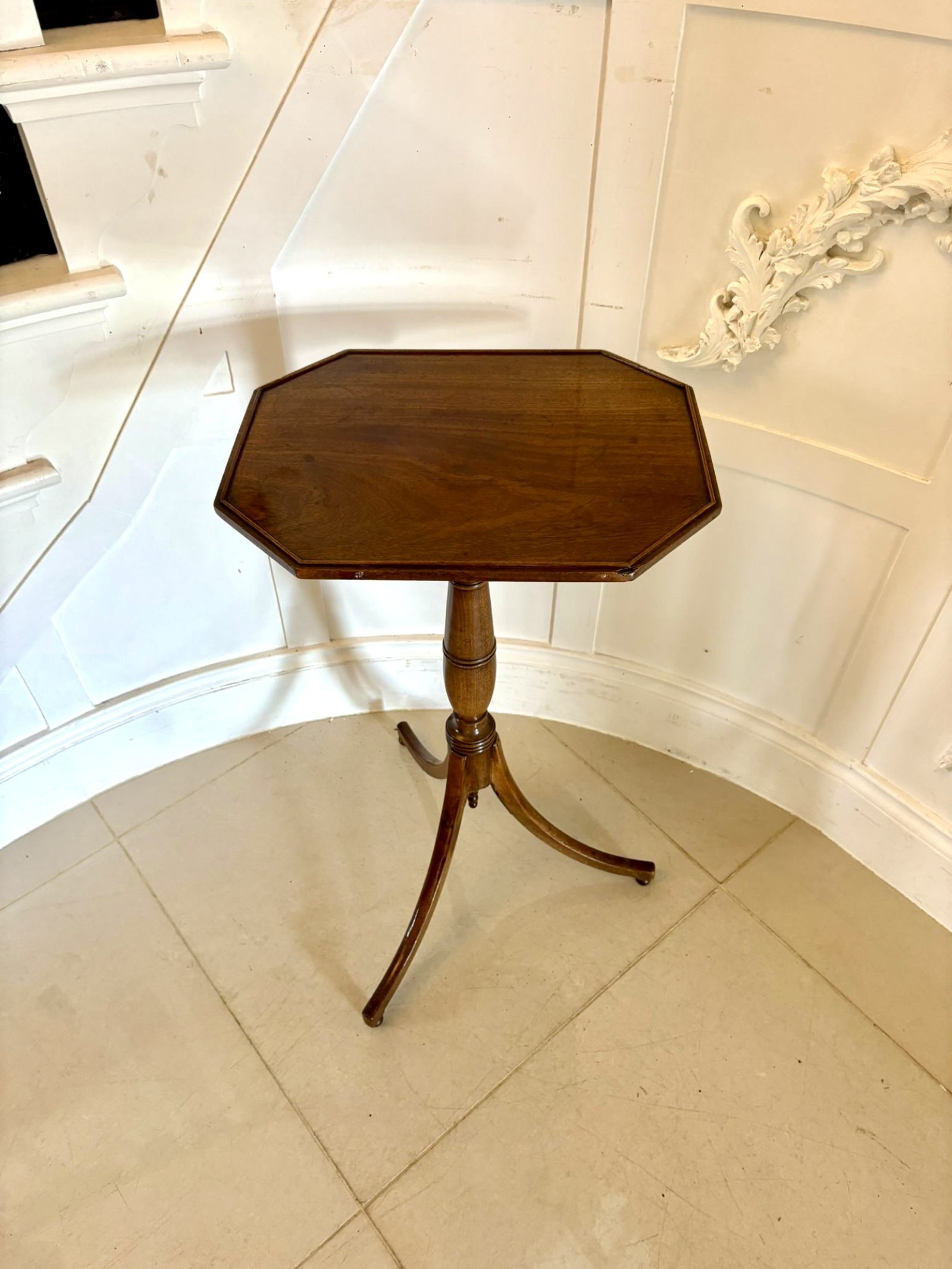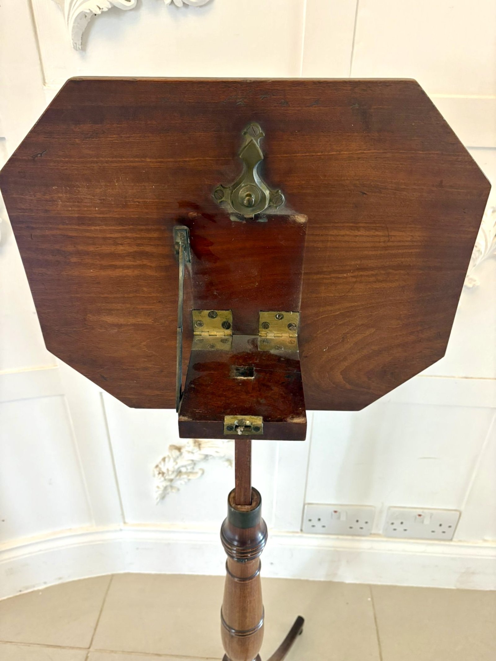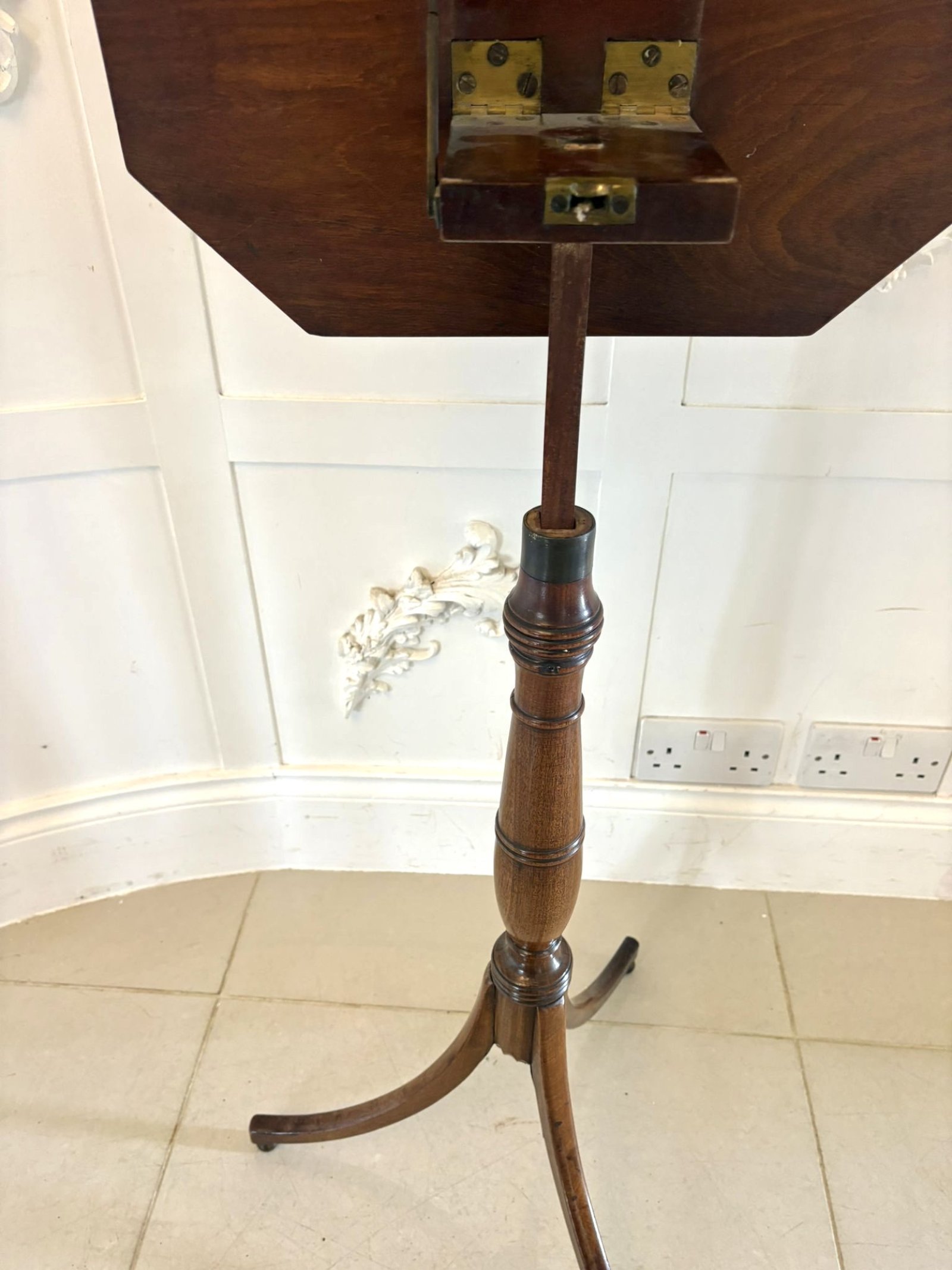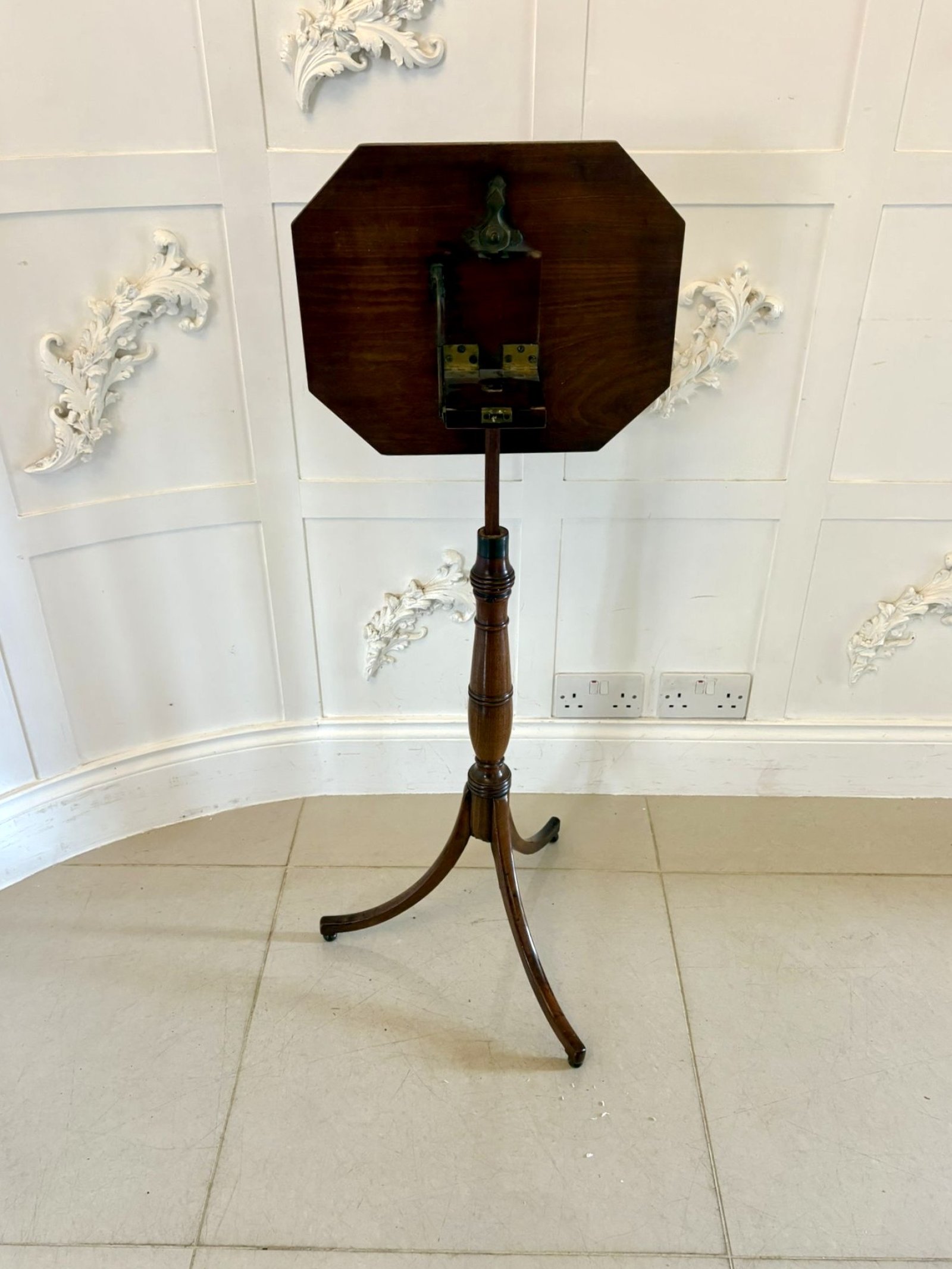 A fine early 19th-century Regency mahogany adjustable reading or music table of elegant design and superb craftsmanship. The octagonal top with a finely moulded edge, is mounted on an adjustable brass mechanism allowing for variable height and angle — ideal for use as a reading, writing, music table or lamp table.