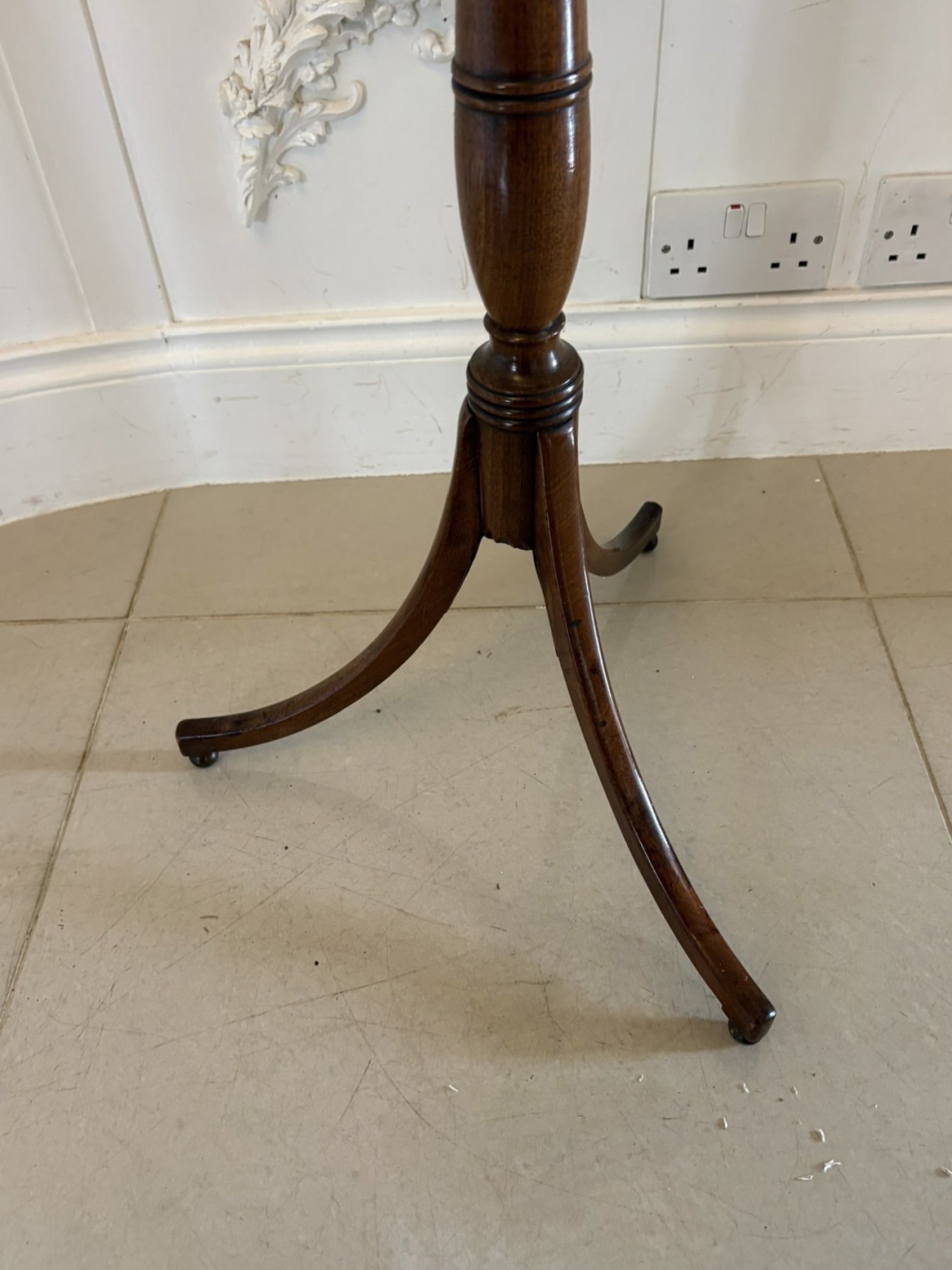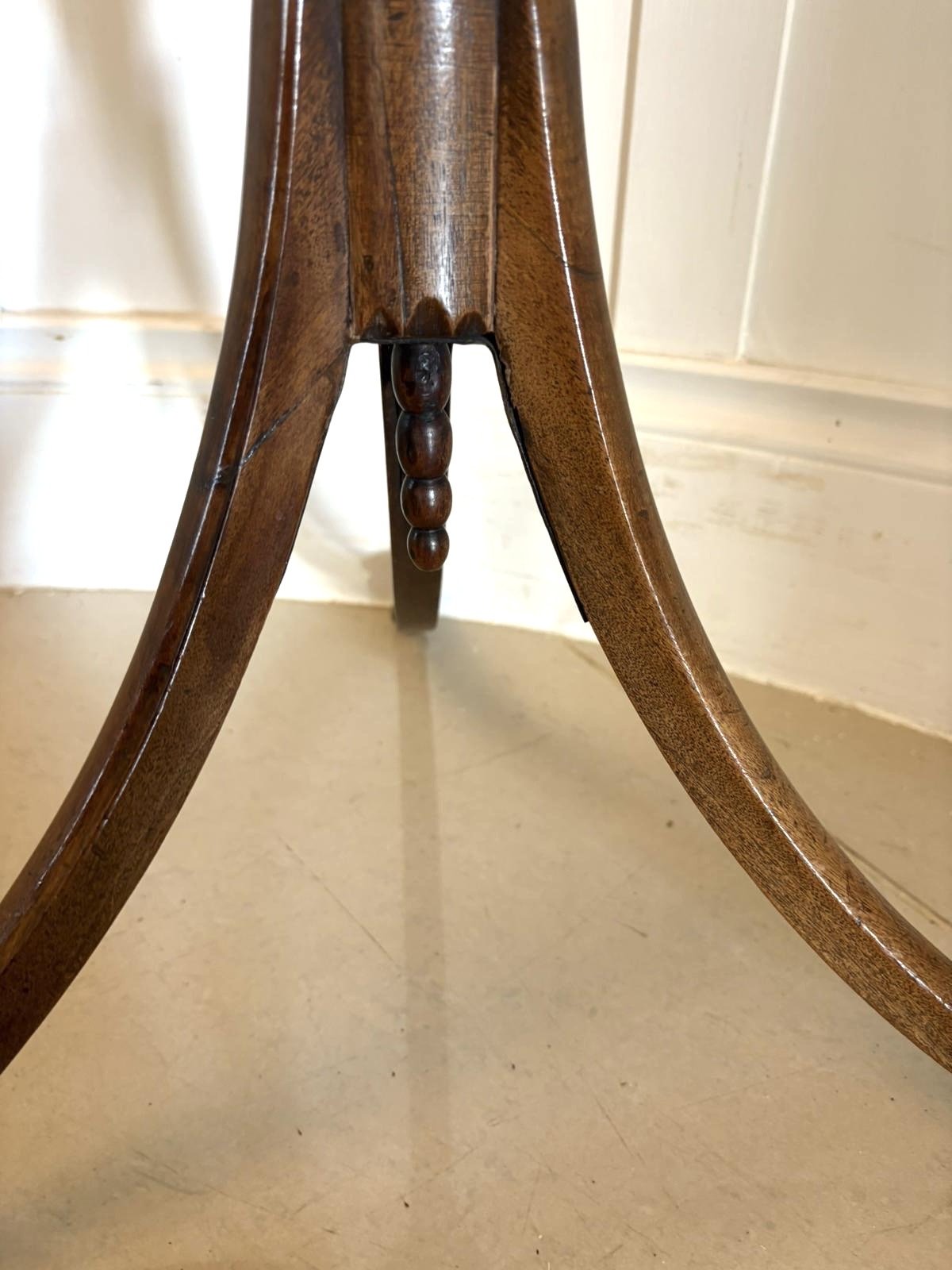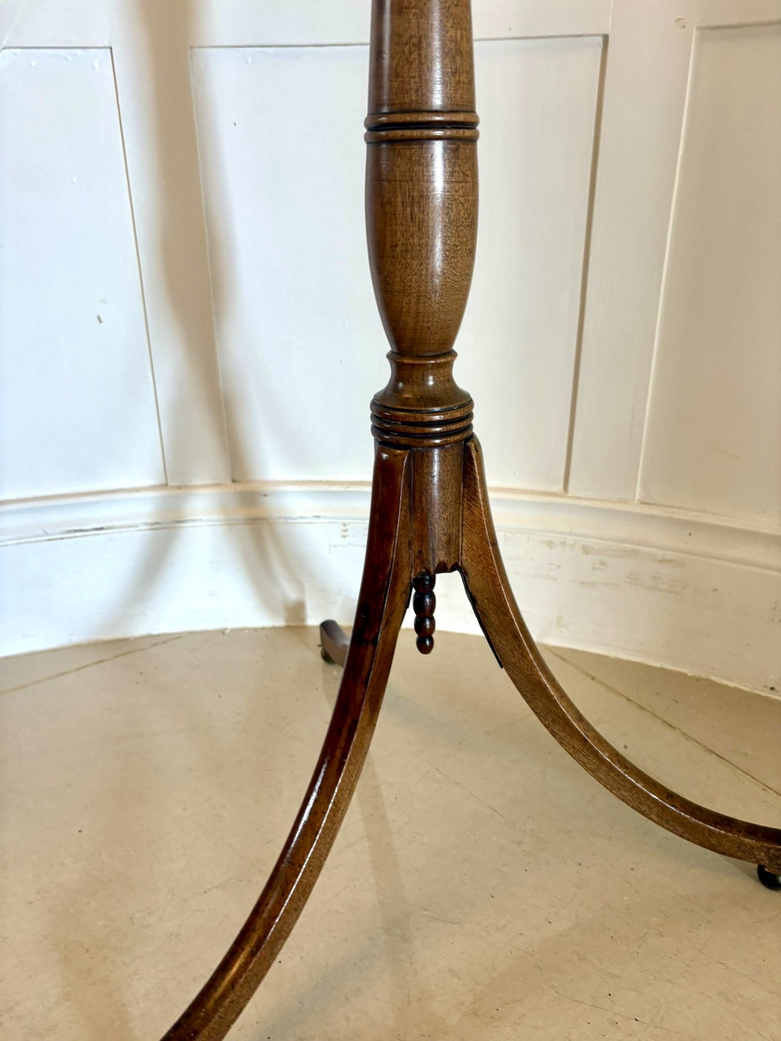 Raised on a turned and reeded column terminating in a triform base with elegant swept legs and small brass castors, this piece perfectly exemplifies the balance and refinement of Regency design. The table retains a rich, well-aged patina, enhancing the natural beauty of the mahogany.