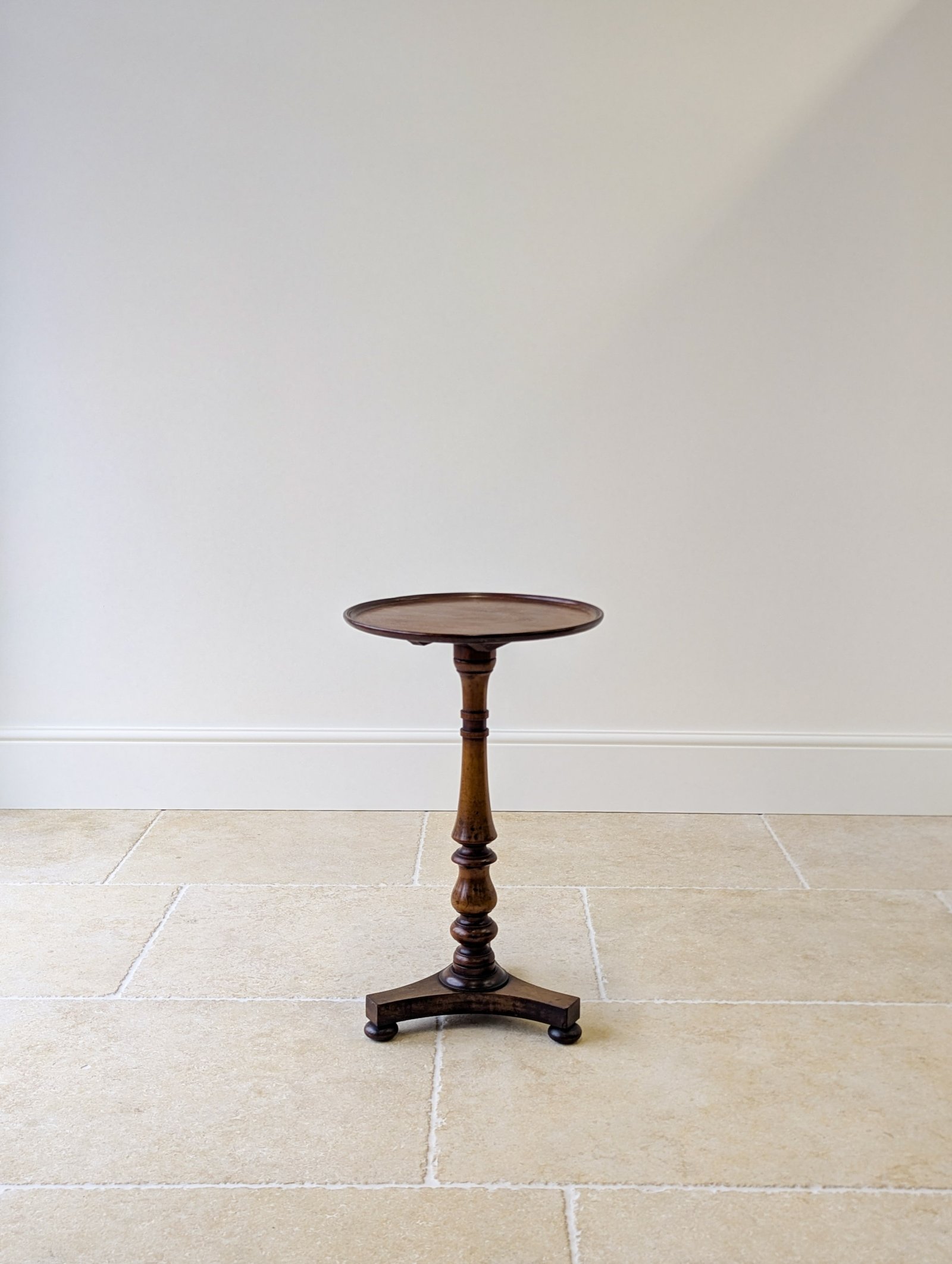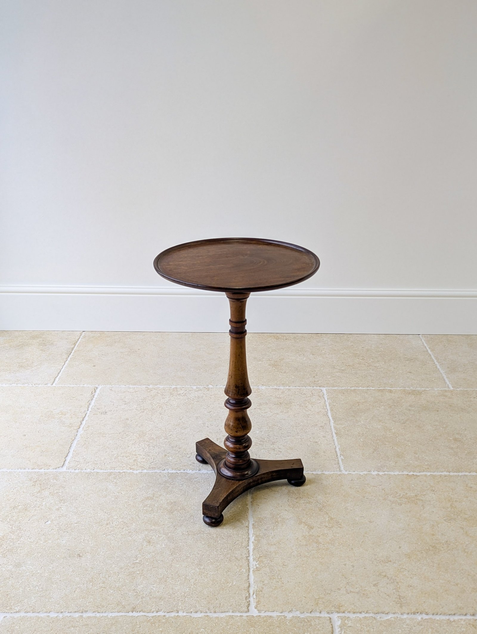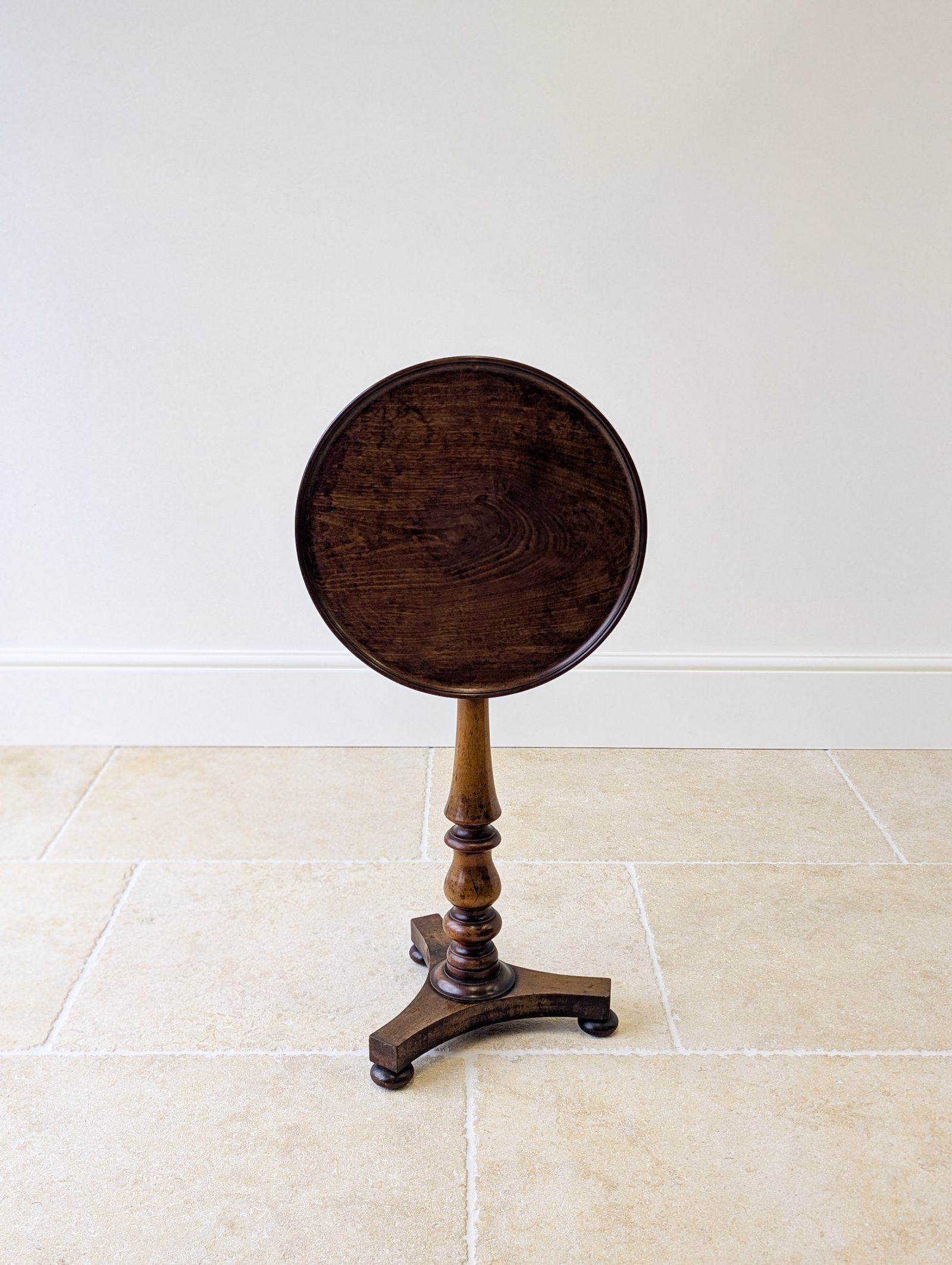 A fine late Regency tilt-top wine table, the circular top in solid mahogany with a neatly raised dished edge, supported on a turned beech column and mahogany tripod base with small turned bun feet. The pedestal column displays skilled hand turning with a subtle taper, the whole finished in a warm, even polish that unites the contrasting timbers harmoniously.