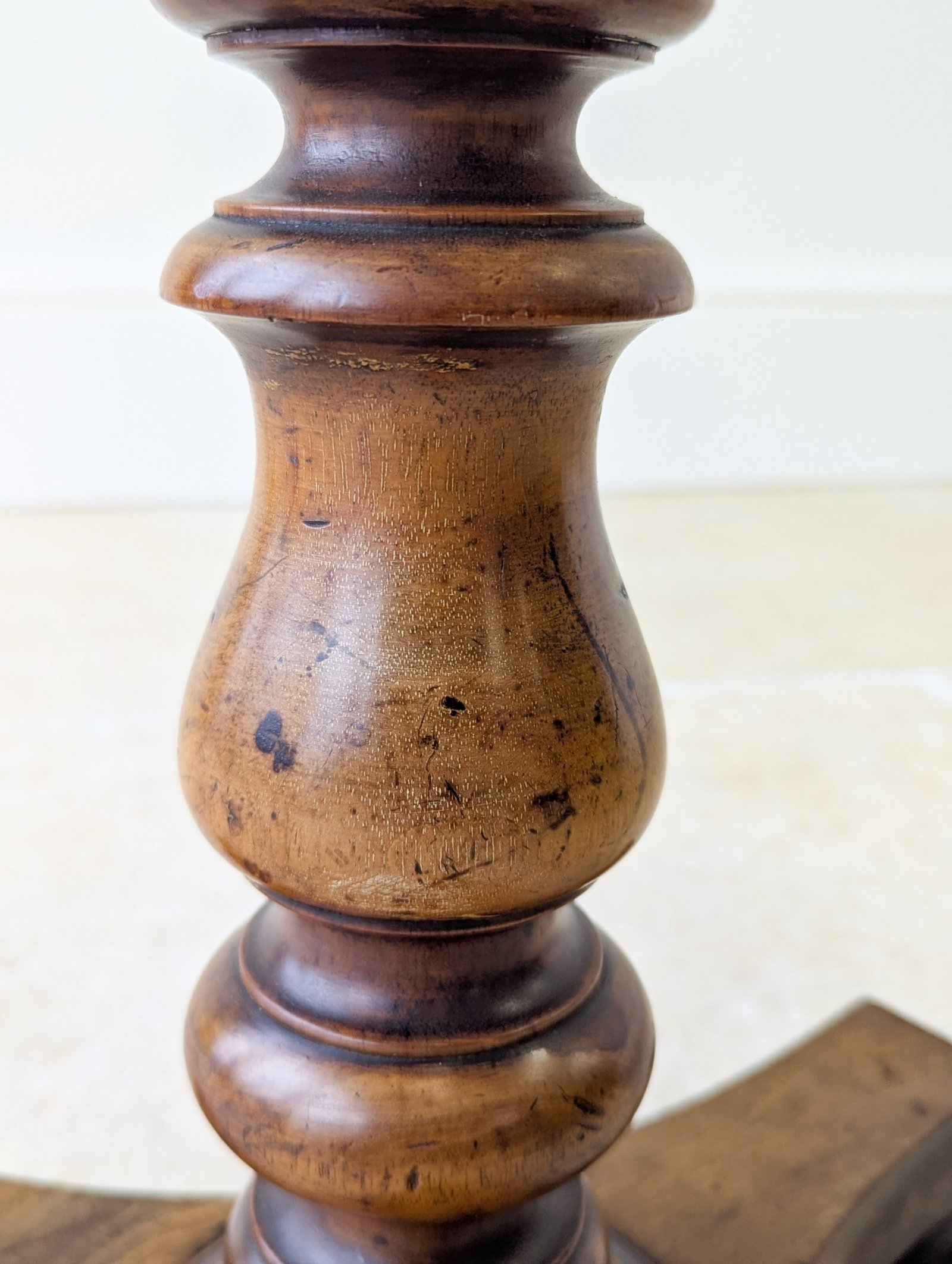 The choice of beech for the turned pedestal is correct to the period and characteristic of quality Regency construction. Beech offered superior strength and a crisp turning surface, then stained to match the mahogany top and base, a combination frequently used in London and provincial workshops of the 1820s and 1830s.
