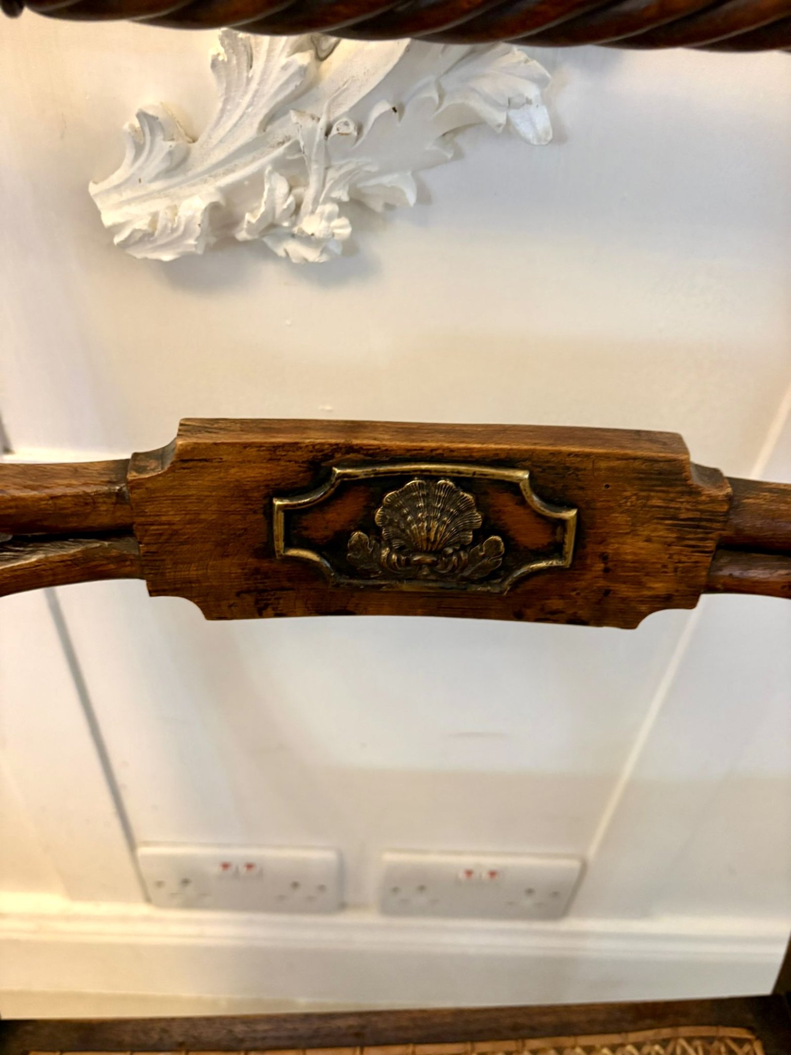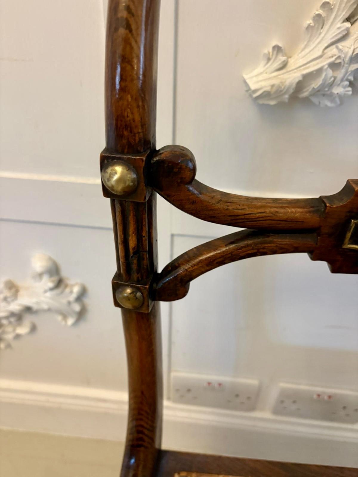 Each chair has a decorative spiral turned top rail and a shaped central splat decorated with a classical brass shell mount. Additional brass rosette mounts strengthen the joints and provide subtle decorative detail.