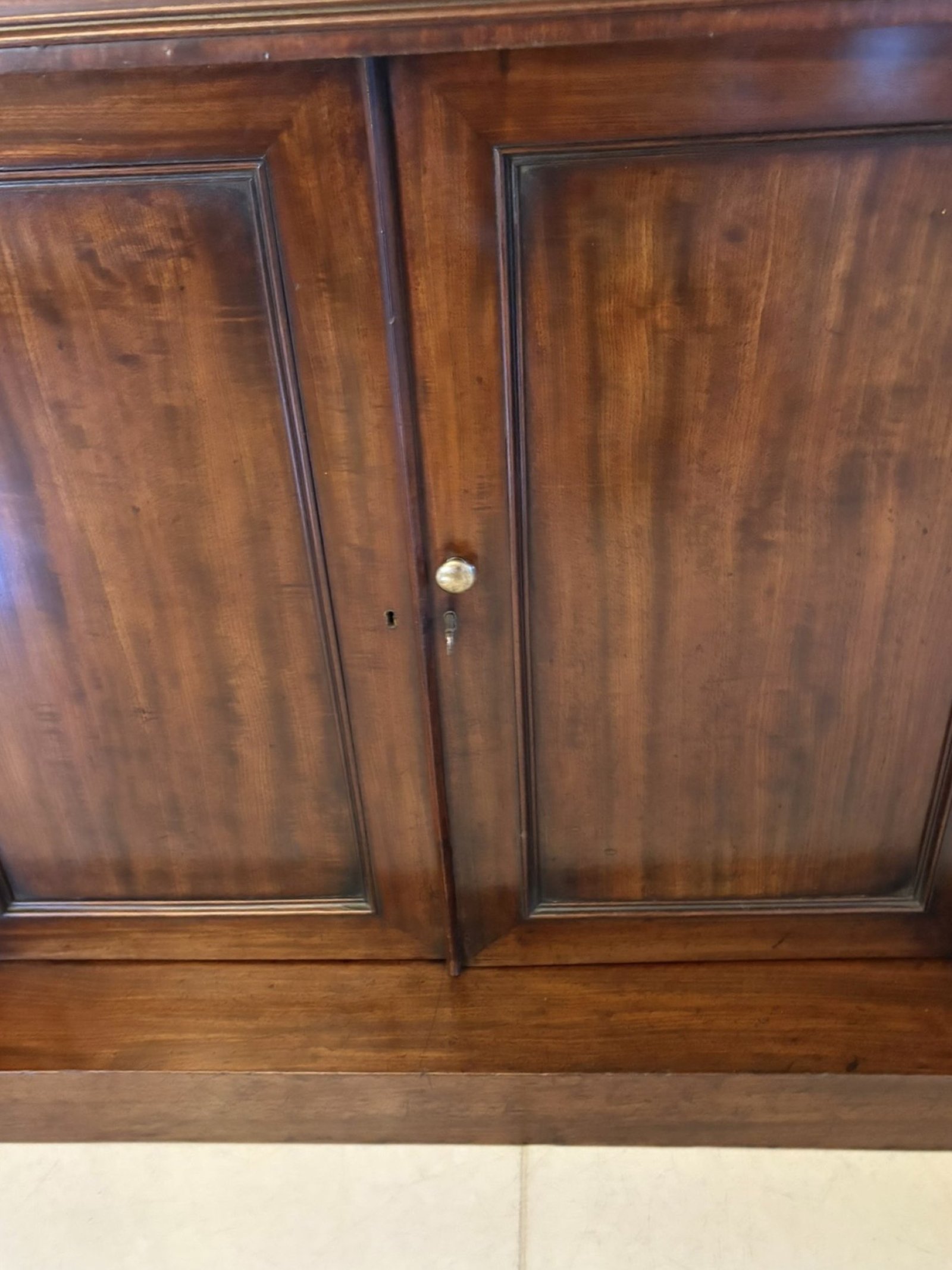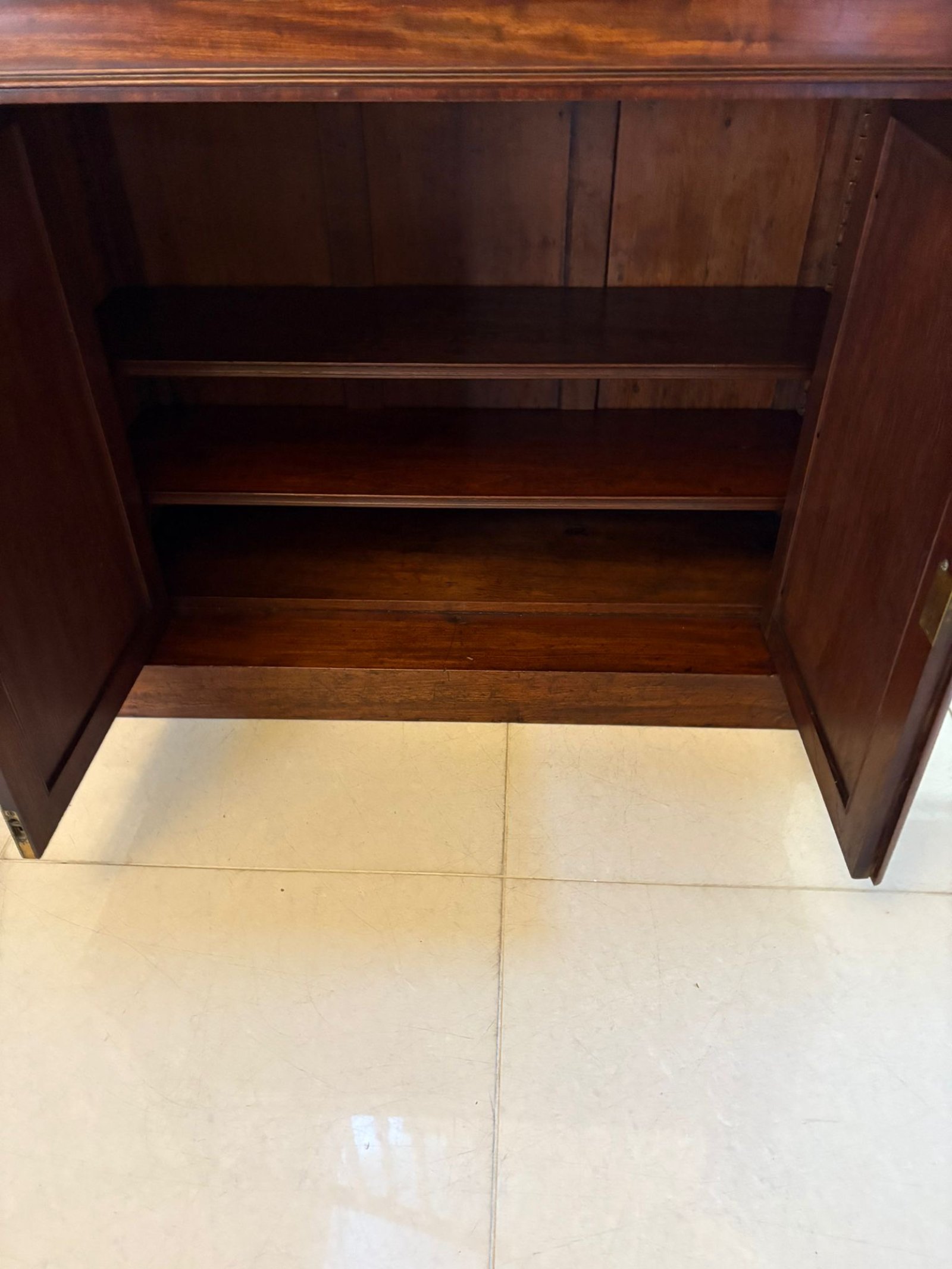 Antique Regency quality figured mahogany sideboard having a gallery top above a mahogany shelf supported by shaped scroll supports raised on a figured mahogany rectangle shaped top above a long single drawer with a moulded edge above a pair of figured mahogany moulded panelled doors opening to reveal two adjustable shelves flanked by turned columns standing on a plinth base.