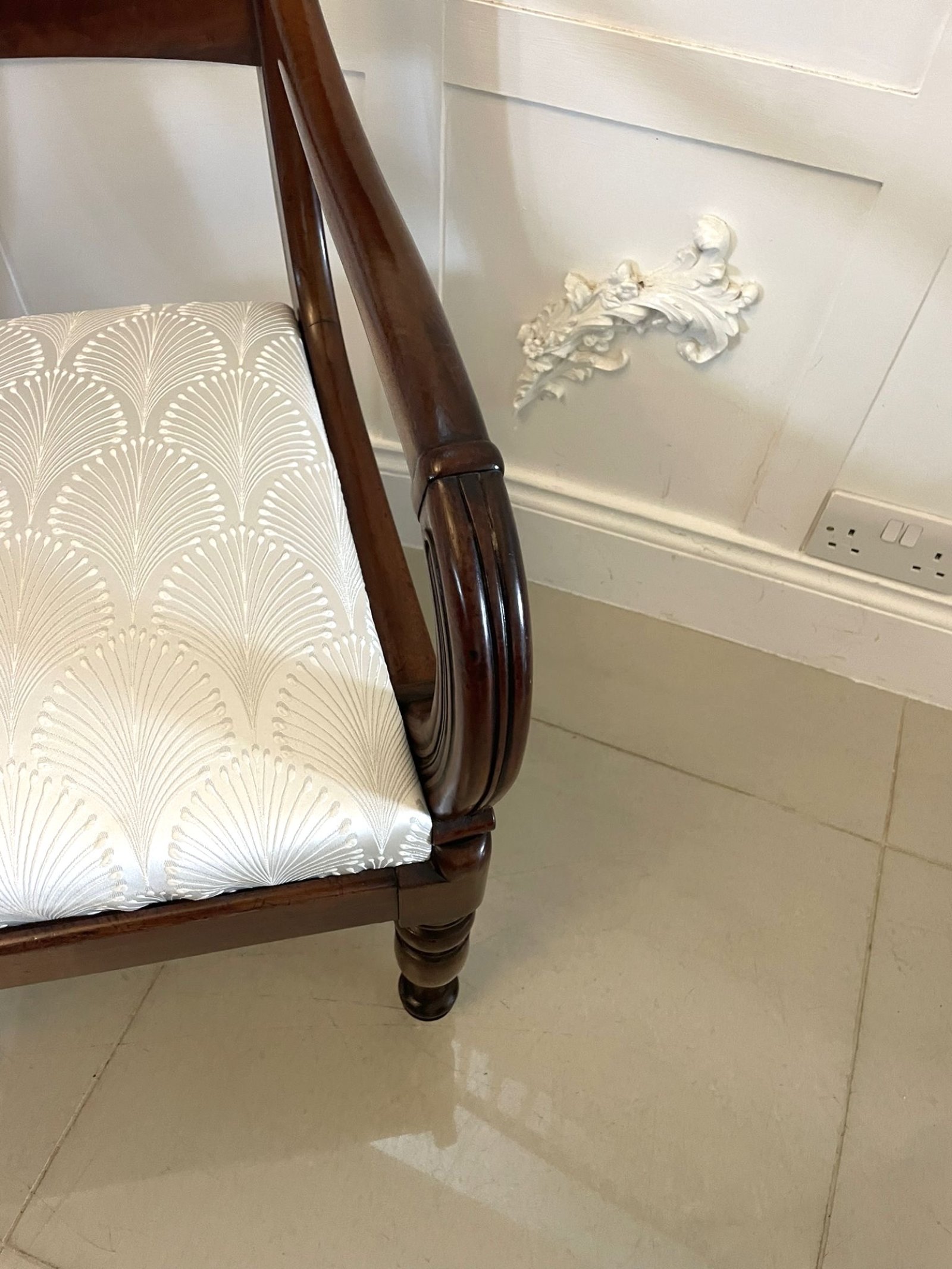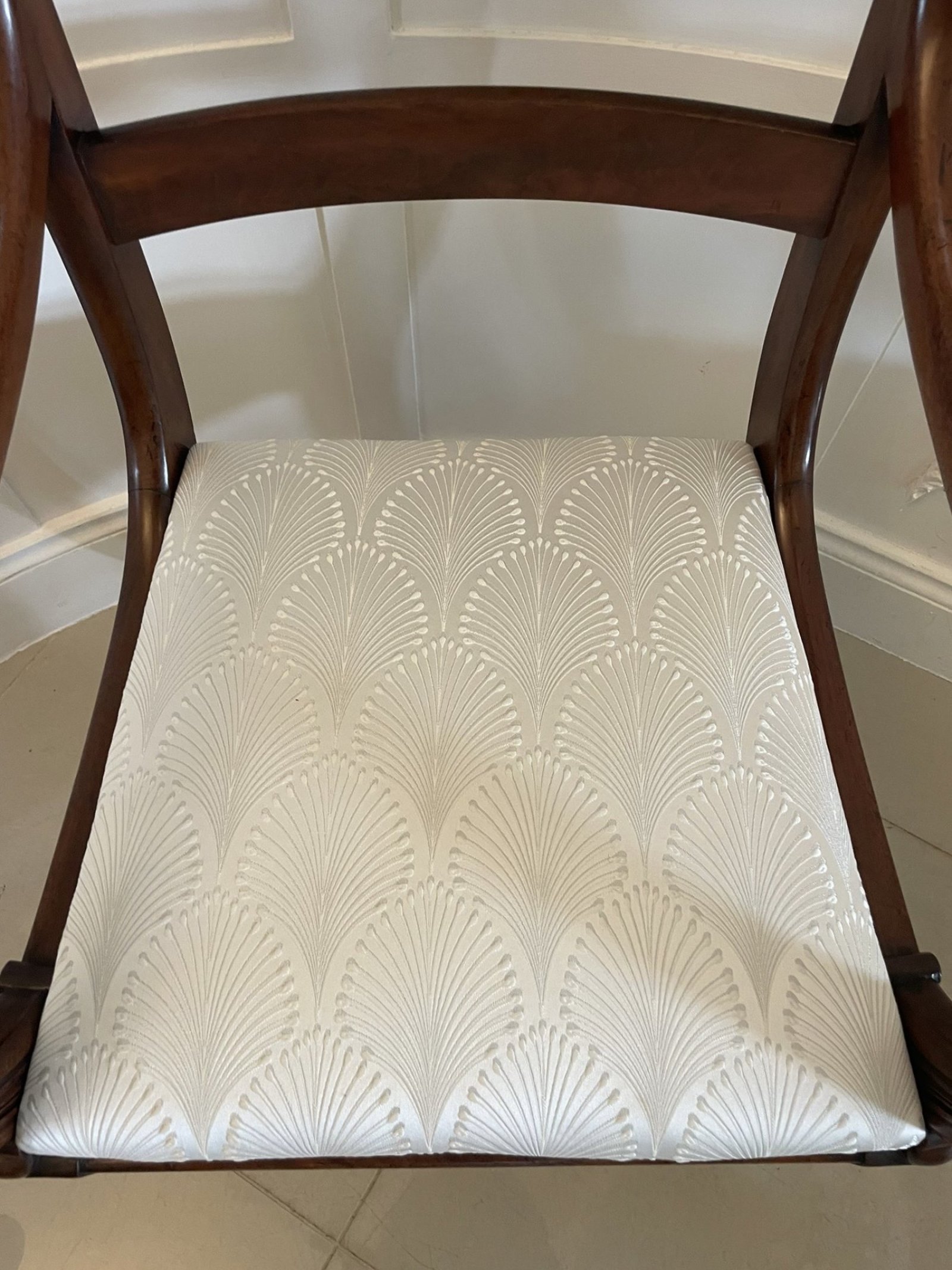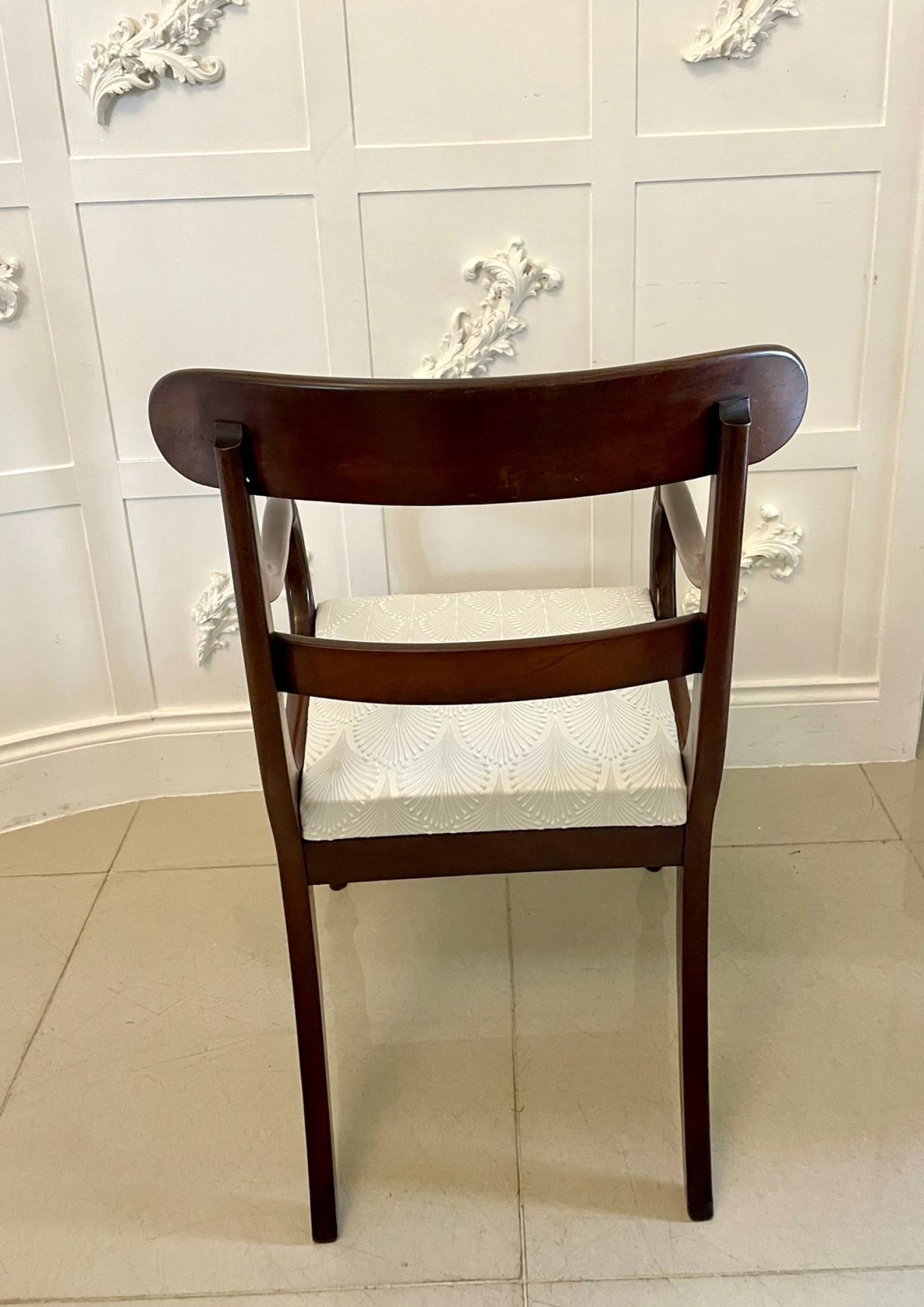 Antique Regency quality mahogany desk chair having a quality figured mahogany top rail and centre splat, elegant carved mahogany shaped open arm, newly reupholstered drop in seat in a quality fabric standing on turned tapering legs to the front and out swept back legs