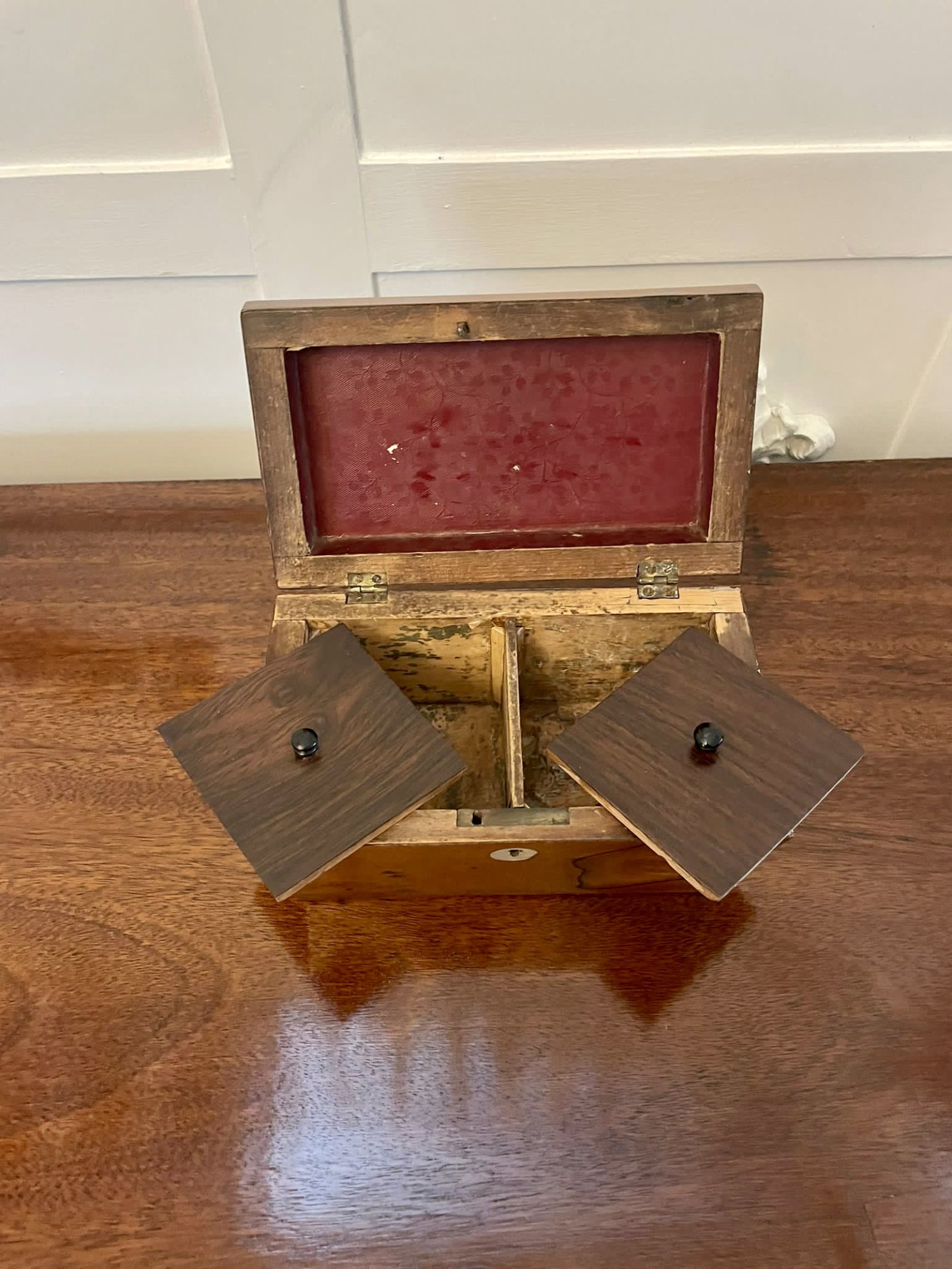 Antique Regency quality rosewood tea caddy having a quality carved rosewood lift up top opening to reveal two lidded tea compartments, original escutcheon