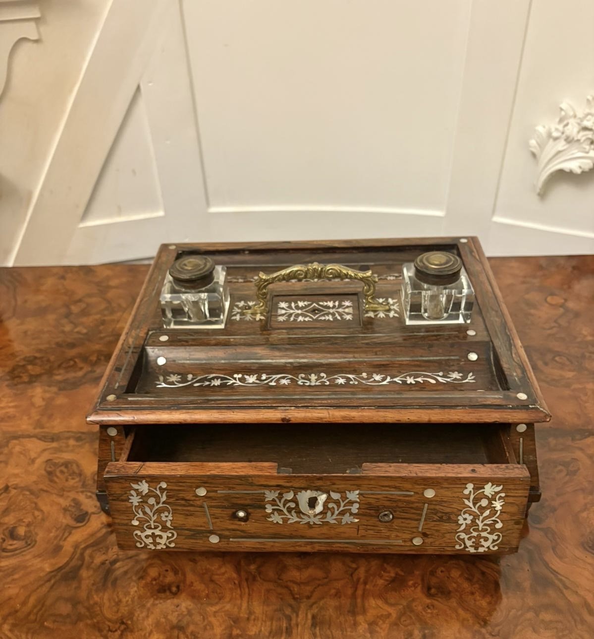 Crafted from well-figured rosewood the piece retains a beautiful mellow patina that contrasts elegantly with the iridescence of the mother-of-pearl. Raised on four small bun feet the writing set has a charming and highly decorative presence, making it a desirable piece for collectors of Regency writing accessories.
