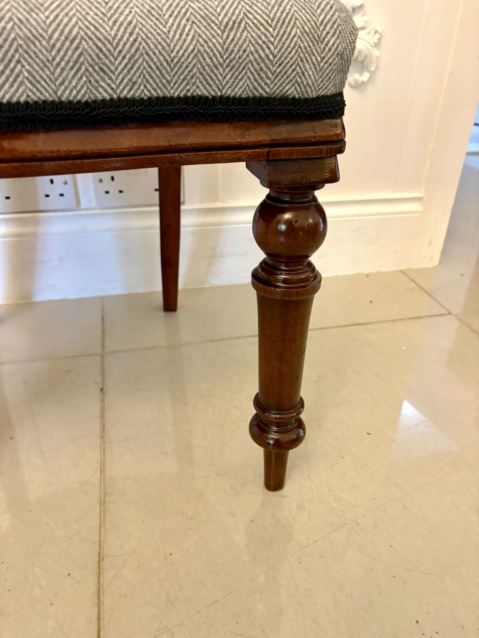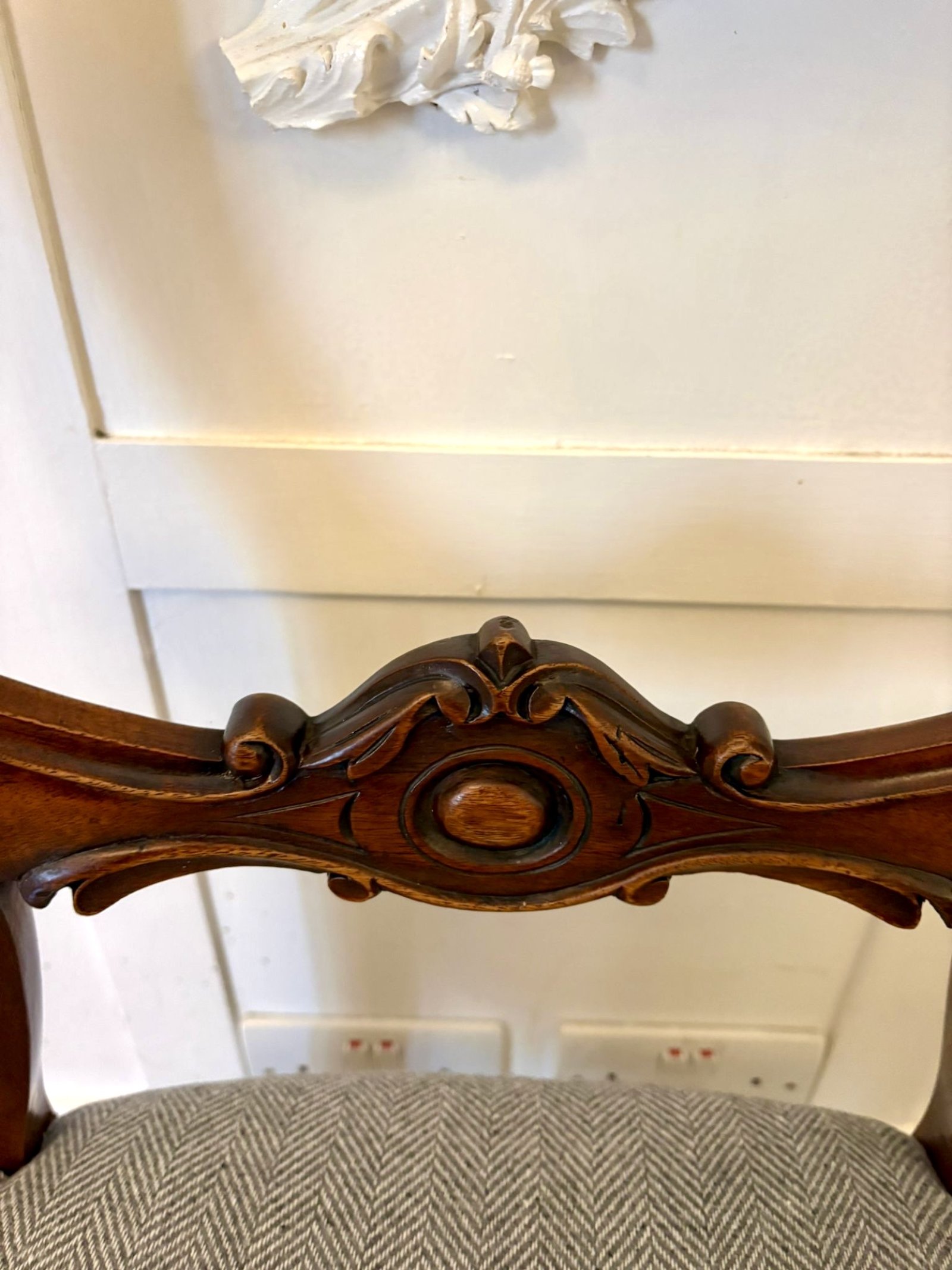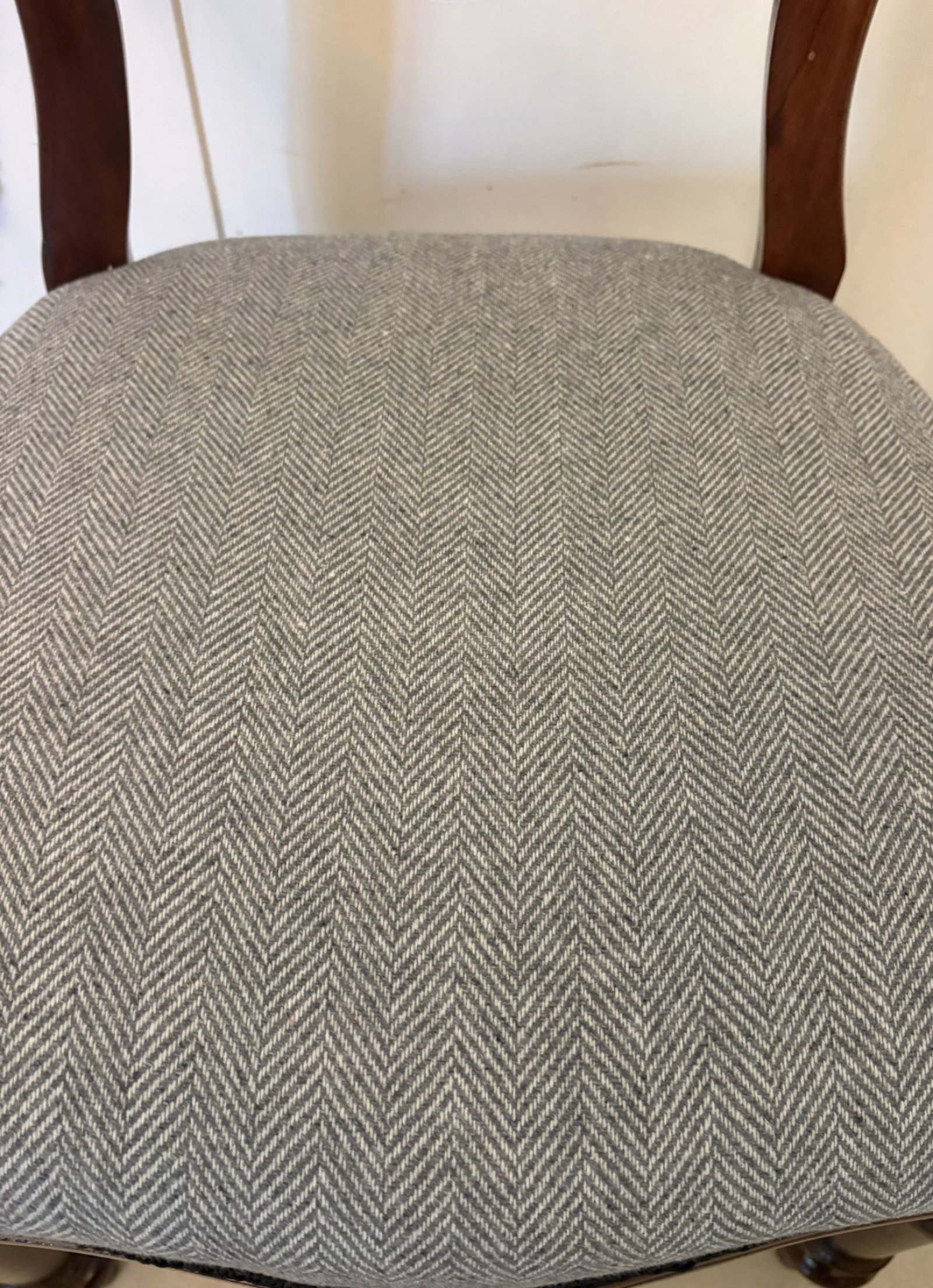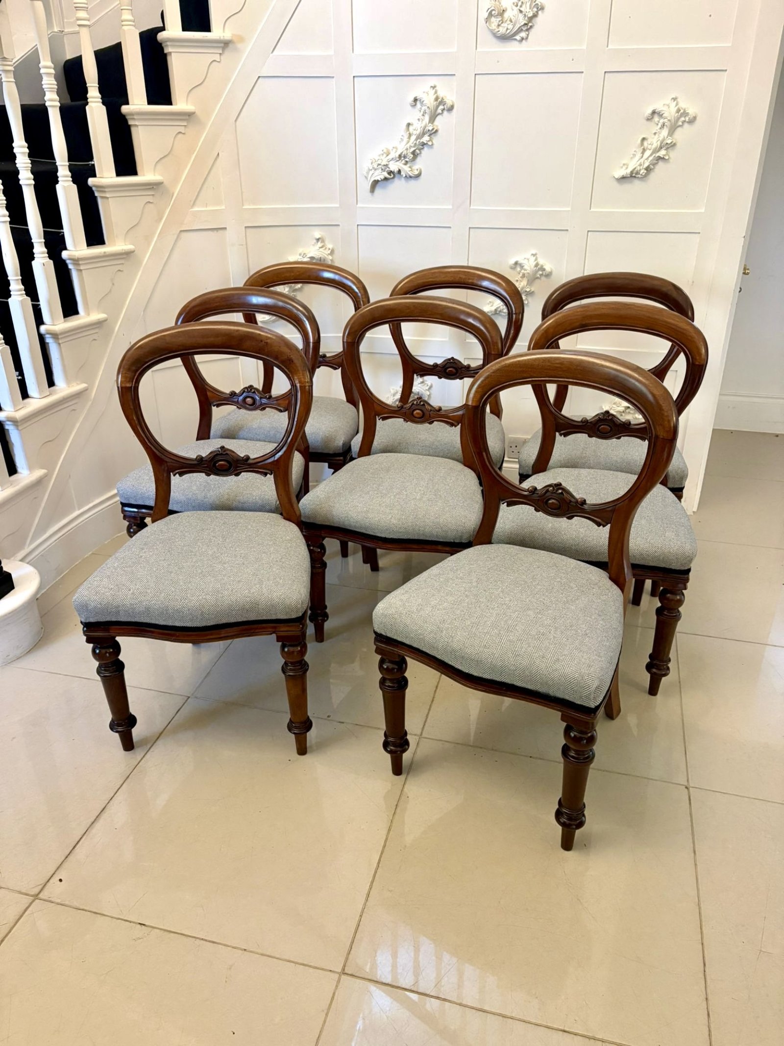 A refined set of eight antique mahogany dining chairs each with elegant balloon backs and finely carved central splats, displaying pleasing symmetry and confident mid-19th-century proportions. The frames are well-figured quality mahogany, with turned and tapering legs united by robust stretchers, giving both visual balance and practical strength. Recently upholstered in a tasteful grey herringbone fabric, the seats provide a subtle, contemporary contrast while remaining entirely in keeping with the period character. The warm colour of the mahogany is enhanced by a well-preserved patina, highlighting the quality of the timber and craftsmanship throughout. A versatile and decorative set, equally suited to a formal dining room or a more relaxed interior.